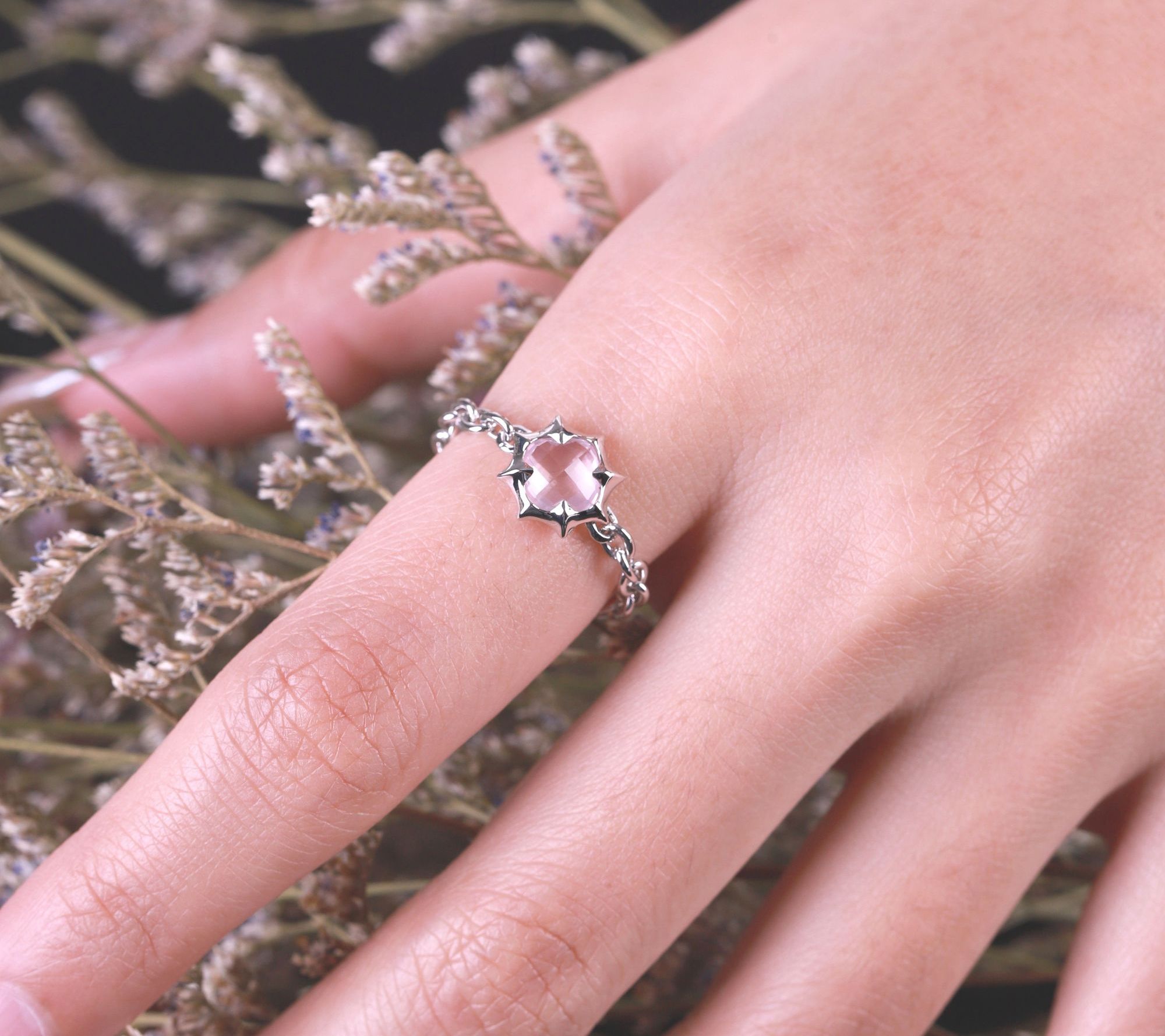 - Flexible chain ring with a pineapple-cut, prong-set rose quartz