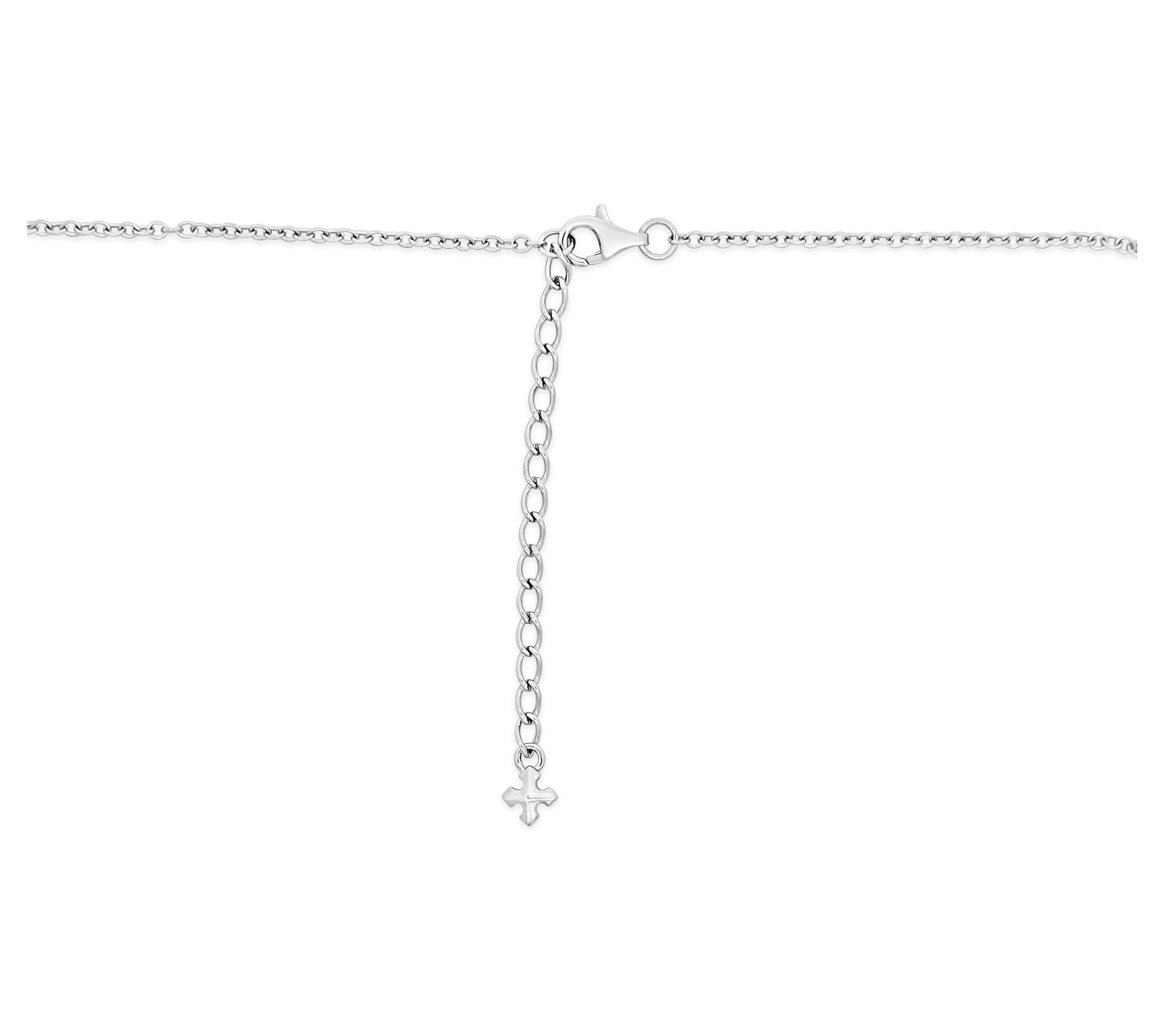 Chain measures 18"L plus a 2"L extender x 1/8"W; pendant measures 1/2"L x 7/8"W