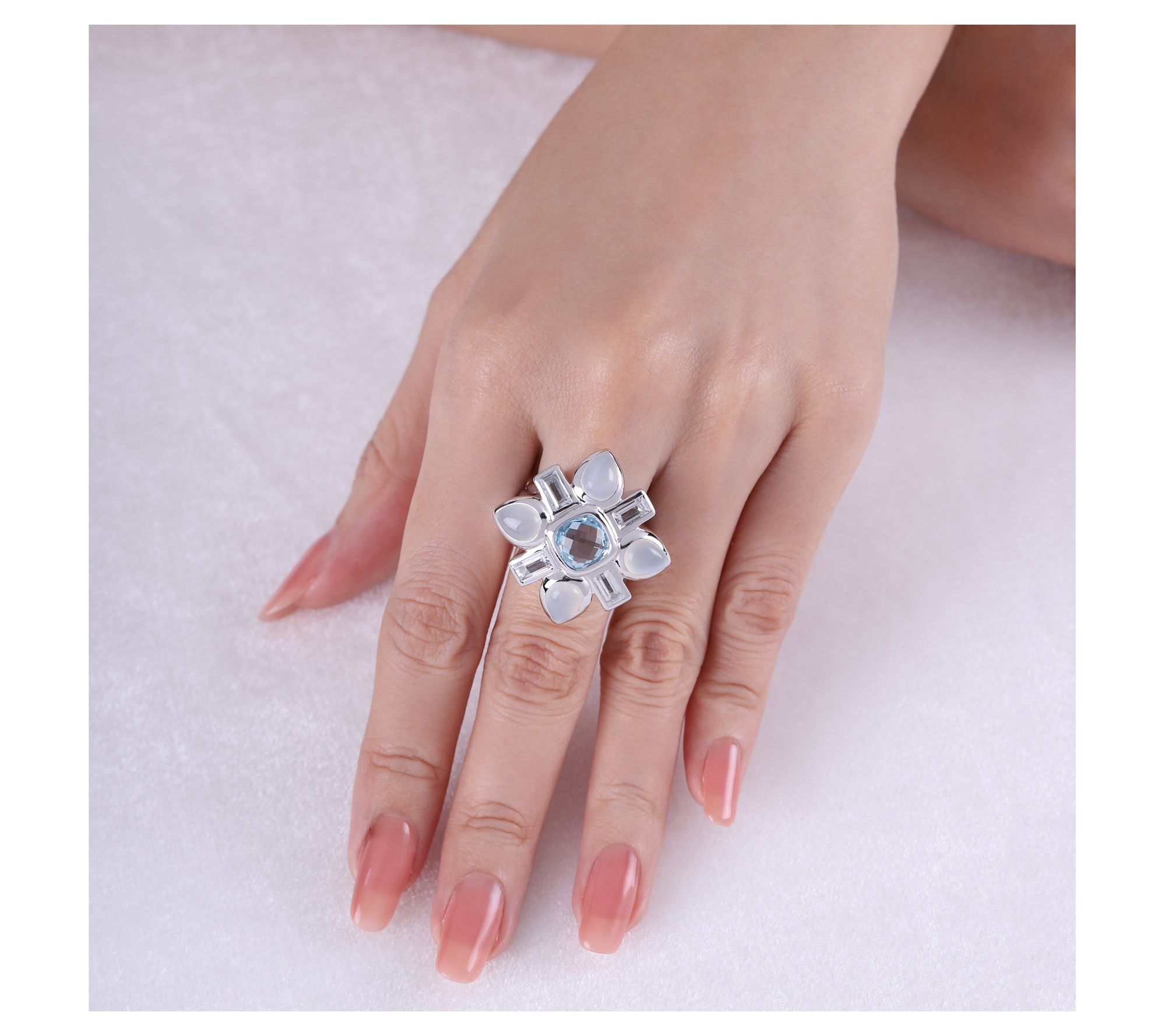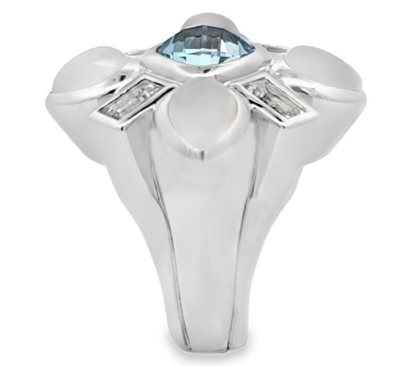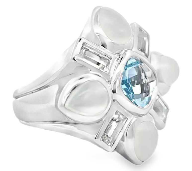 Spark conversations and capture compliments when you slip on this Jackie ring. Featuring a radiant sky blue topaz centerpiece, accented by white topaz baguettes and pear-shaped moonstones, this ring creates an elegant accessory for any special occasion. From Margo Manhattan.