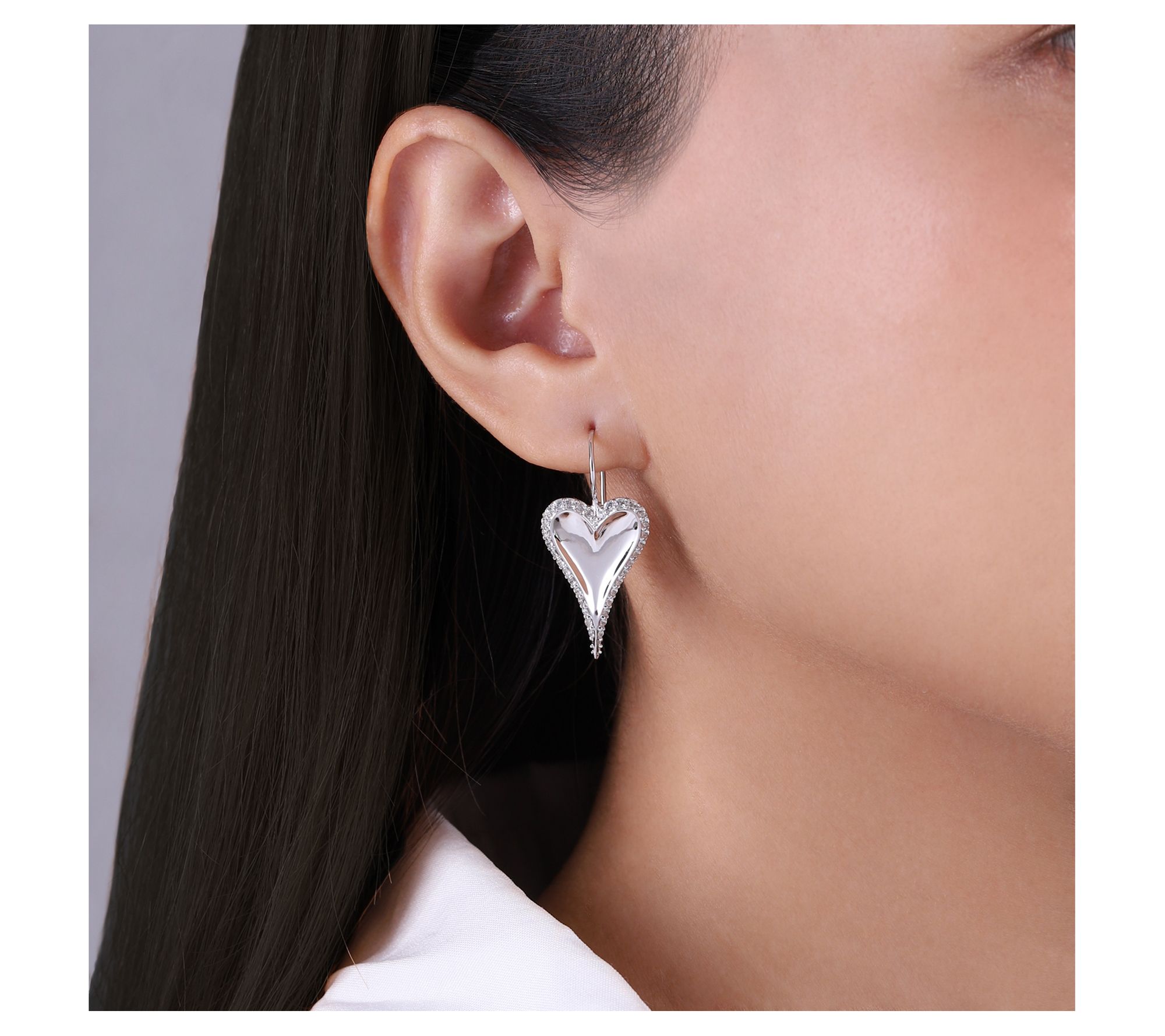 • Puffed heart design with white topaz pave frame; polished finish