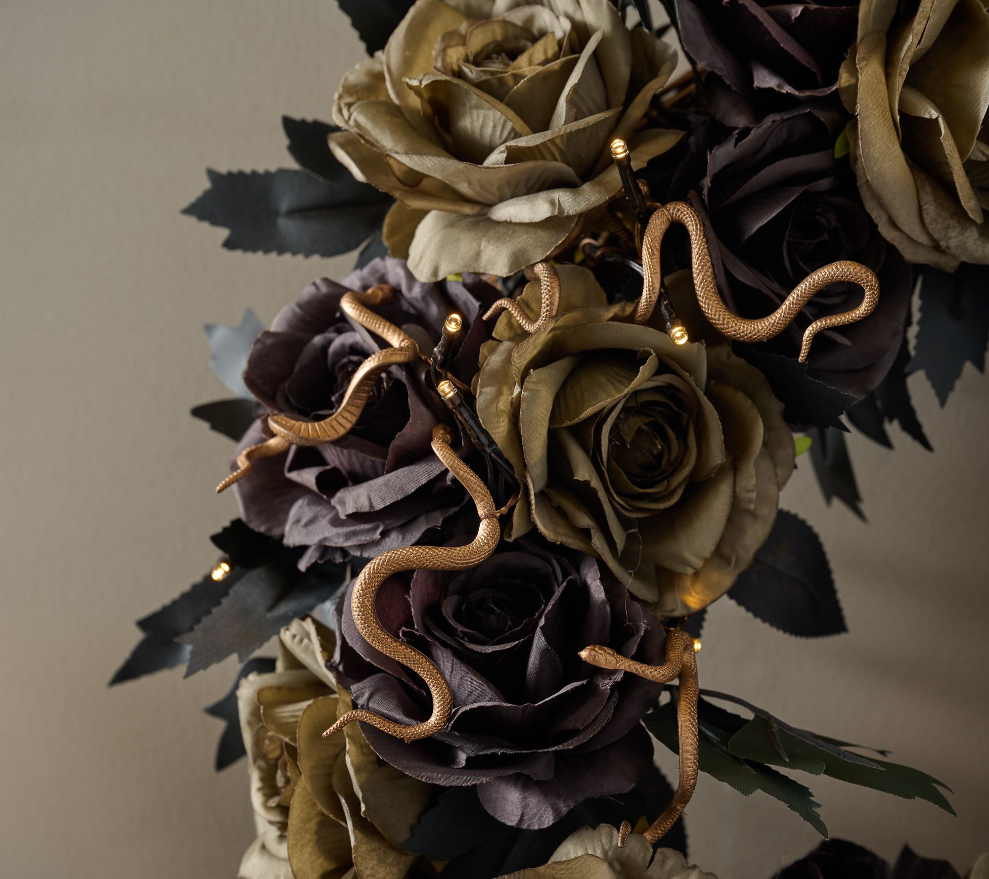 Charmed, for sure. Bring an unexpected twist to your festive decor with this illuminated rose and snake wreath, dotted with bright LEDs to set just the right mood. Mix and match between several timer and lighting modes to create a dramatic entrance, or let it spark conversation above your mantel all season long. From Martha Stewart.