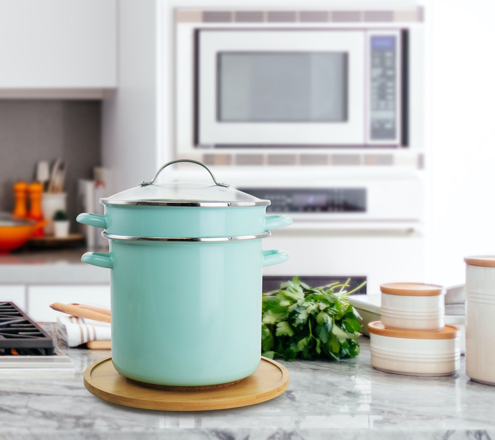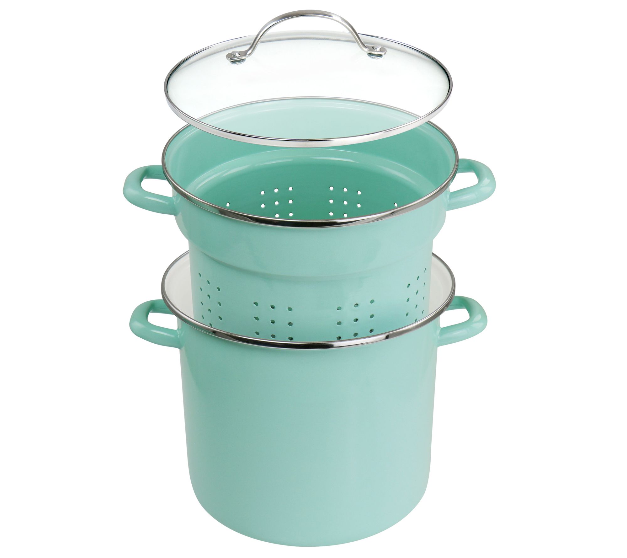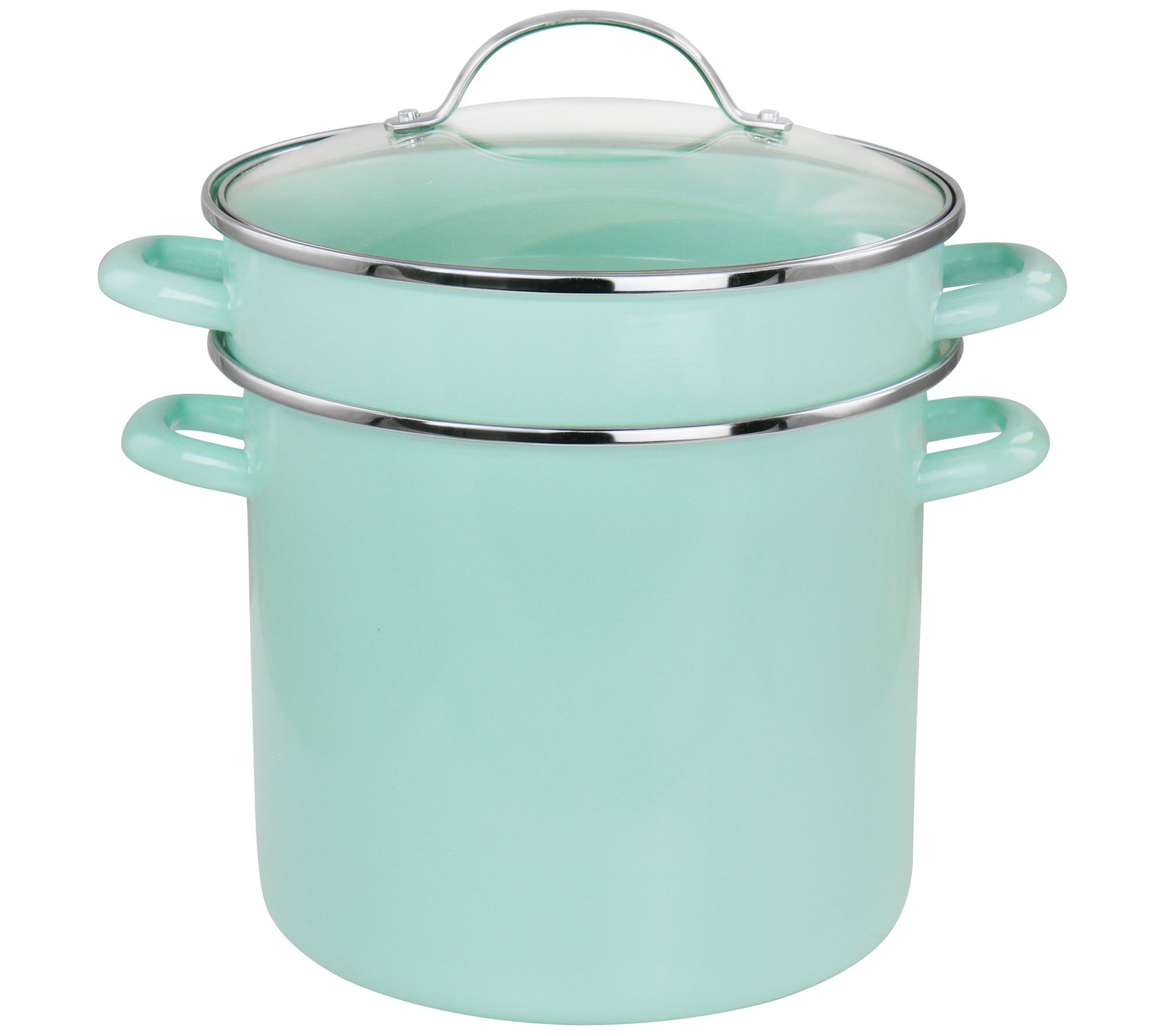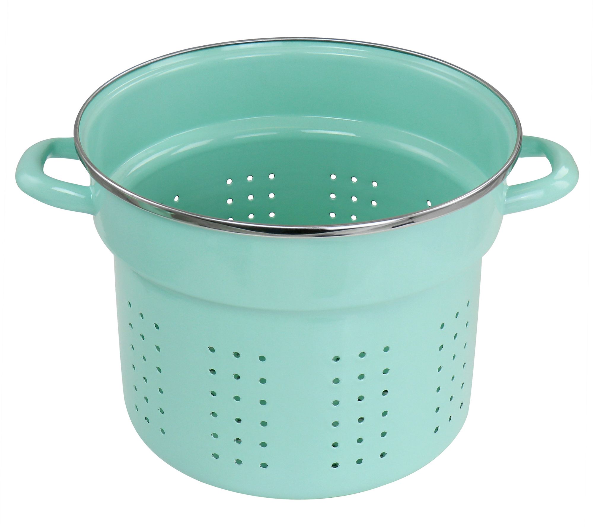 Steam vegetables, boil pasta, or make soup for the family with this 8-qt stockpot. Offering a steamer insert, a glossy aqua enamel exterior, and wide handles that make lifting and pouring easy. A beautifully functional addition to your kitchen collection. From Martha Stewart.