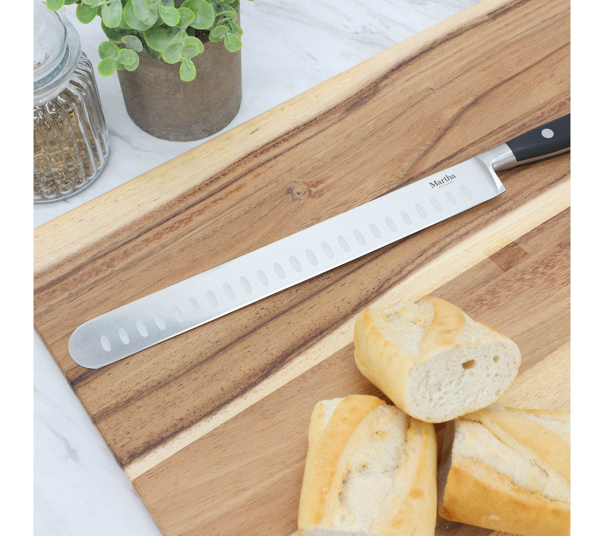 Master slicing roasts, carving poultry, and prepping large fruits with this 10" hollow edge slicer knife. The stainless steel blade glides effortlessly through meats and produce, while the triple-riveted handle offers comfortable control for extended kitchen tasks. Enjoy reliable performance and a touch of sophistication every time you cook. From Martha Stewart.