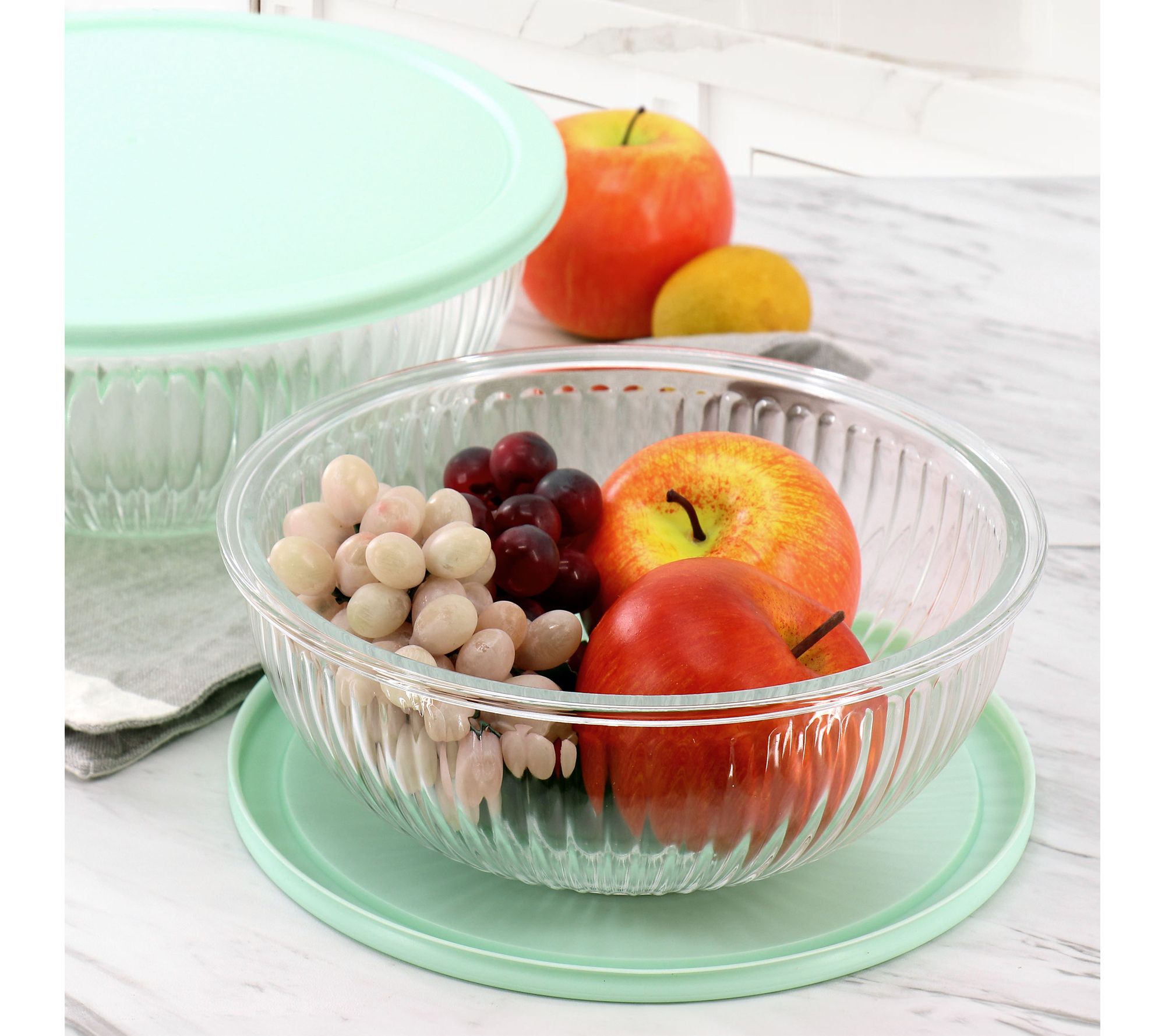 From prepping ingredients to serving up salads or storing leftovers, this glass bowl set makes kitchen tasks effortless and stylish. The embossed stripe texture adds a touch of elegance to your table, while airtight lids keep your food fresh and ready for any occasion. From Martha Stewart.