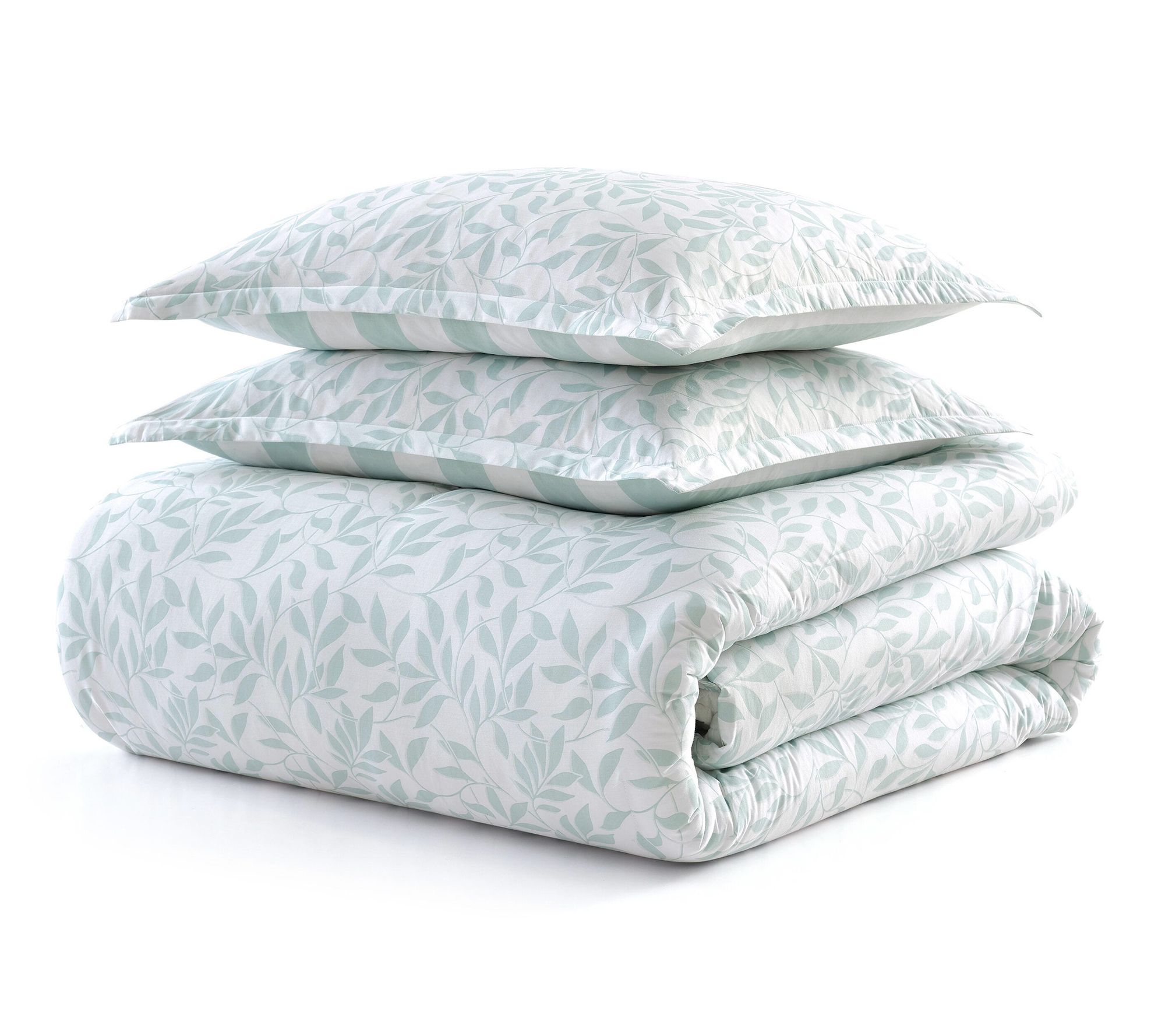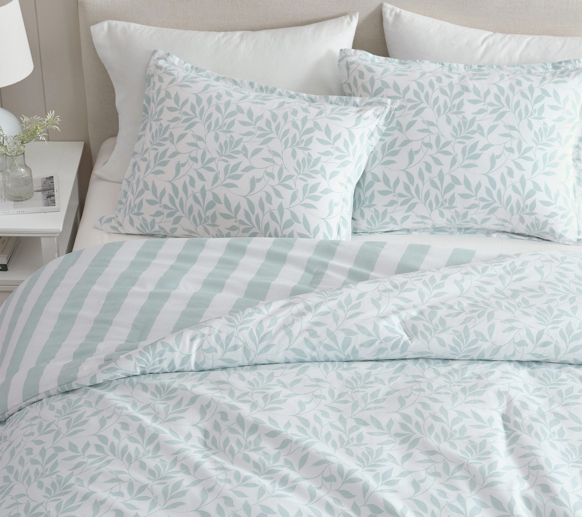 Transform your bedroom into a restful sanctuary with this cotton duvet set, where soft winter blue vine motifs dance across a crisp white background for a look that's as inviting as it is refined. A reversible cover lets you choose between elegant botanicals and classic stripes, making it easy to refresh your space with a simple flip. From Martha Stewart.