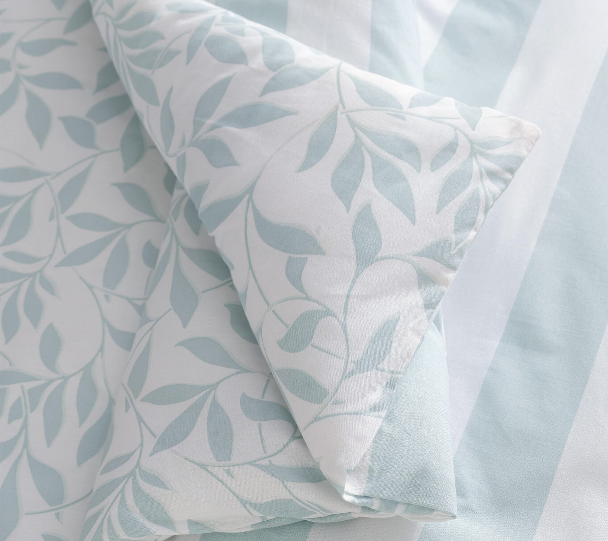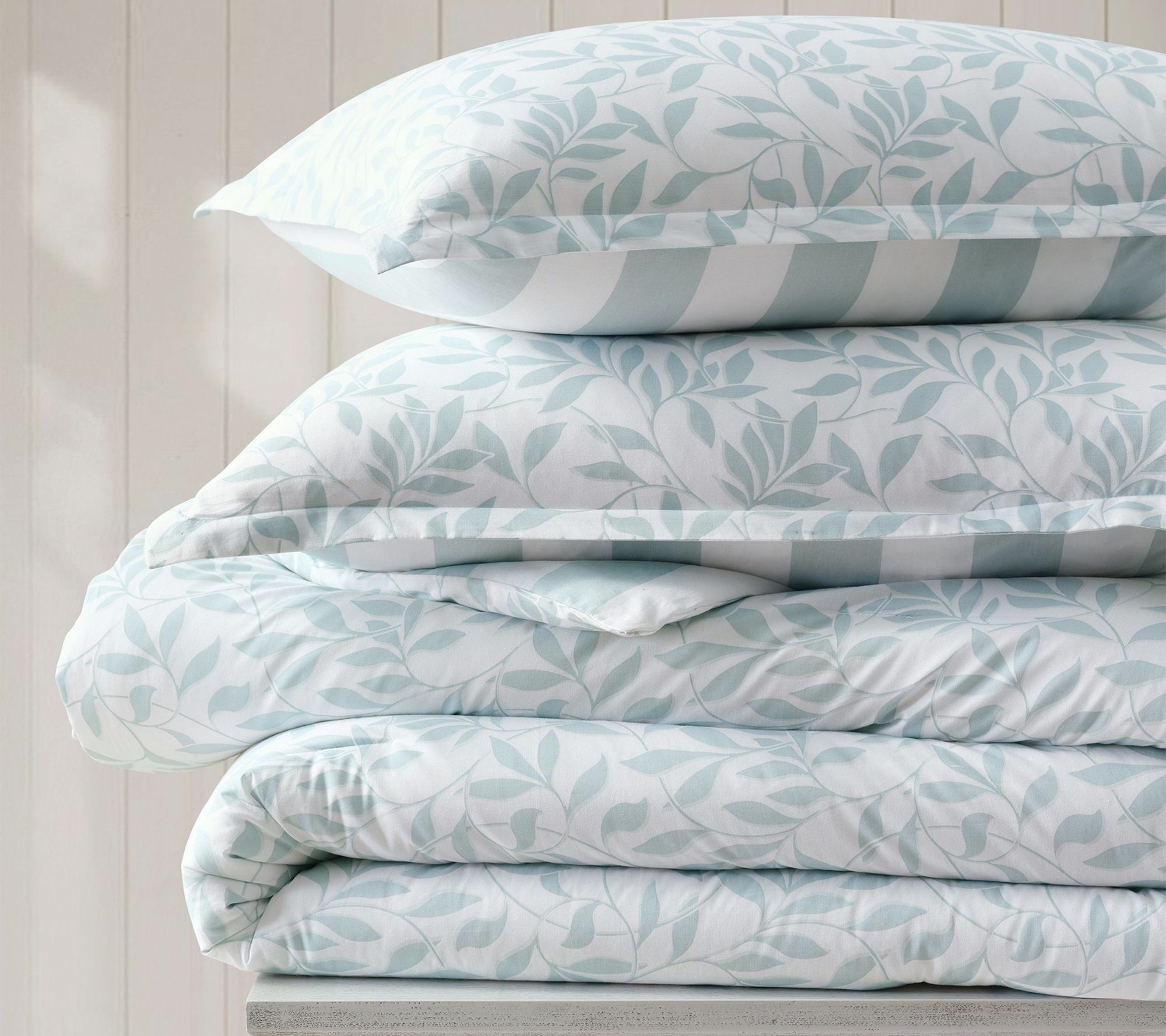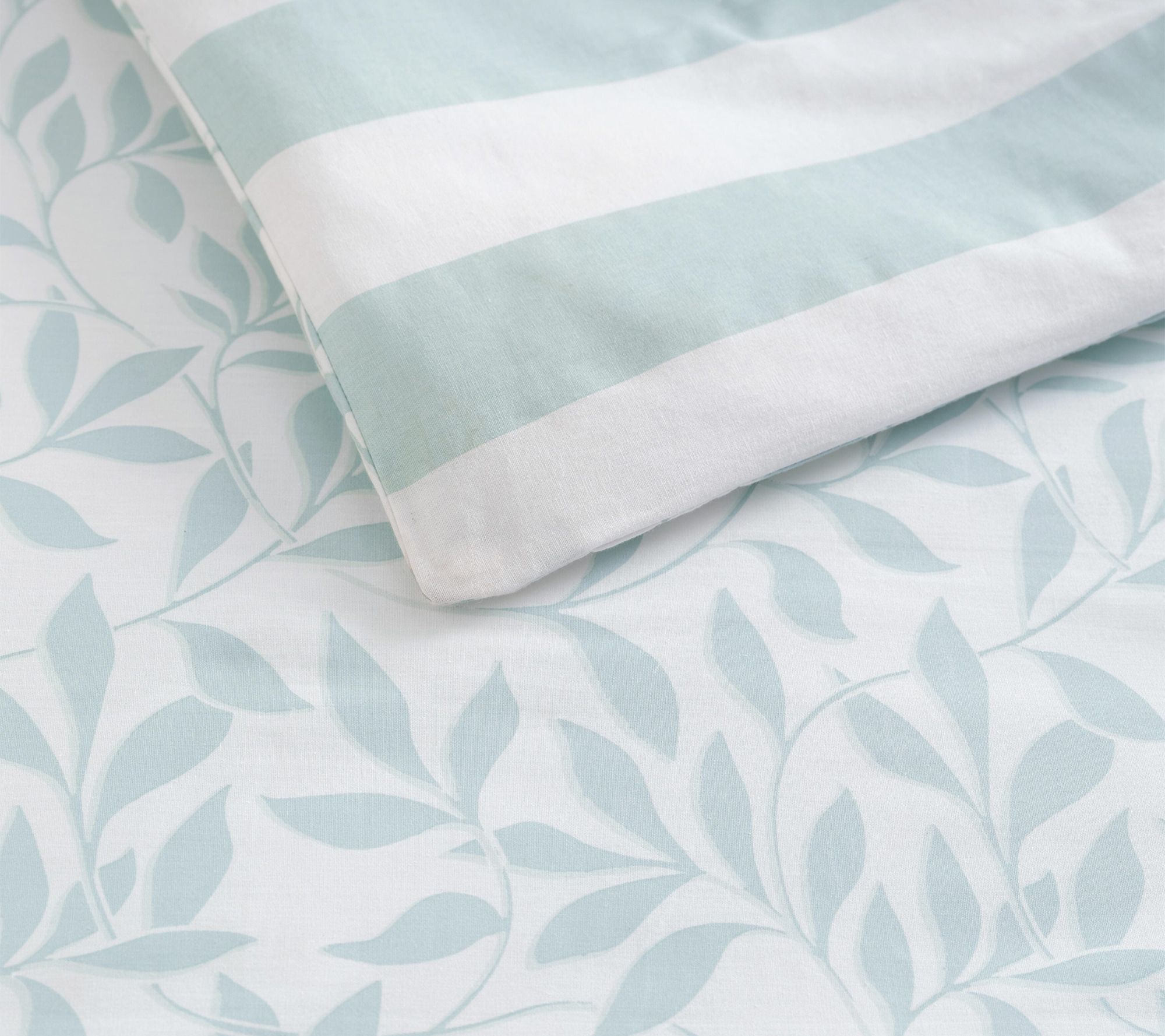 • Duvet cover features elegant vine motifs in soft blue on white; reverses to a coordinating stripe pattern for versatile styling