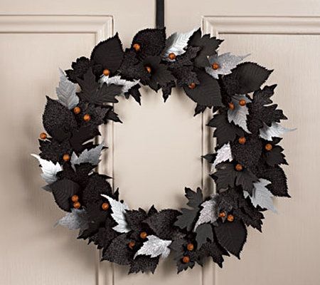 • Halloween kit: 12"D chipboard wreath form, 23 orange glittered berries, black ribbon, 50 embossed black and metallic silver leaves, black florists' tape, one 0.35 oz jar of onyx glitter, one 0.35 jar of metallic silver glitter, and one 0.88 oz bottle of nontoxic white glue