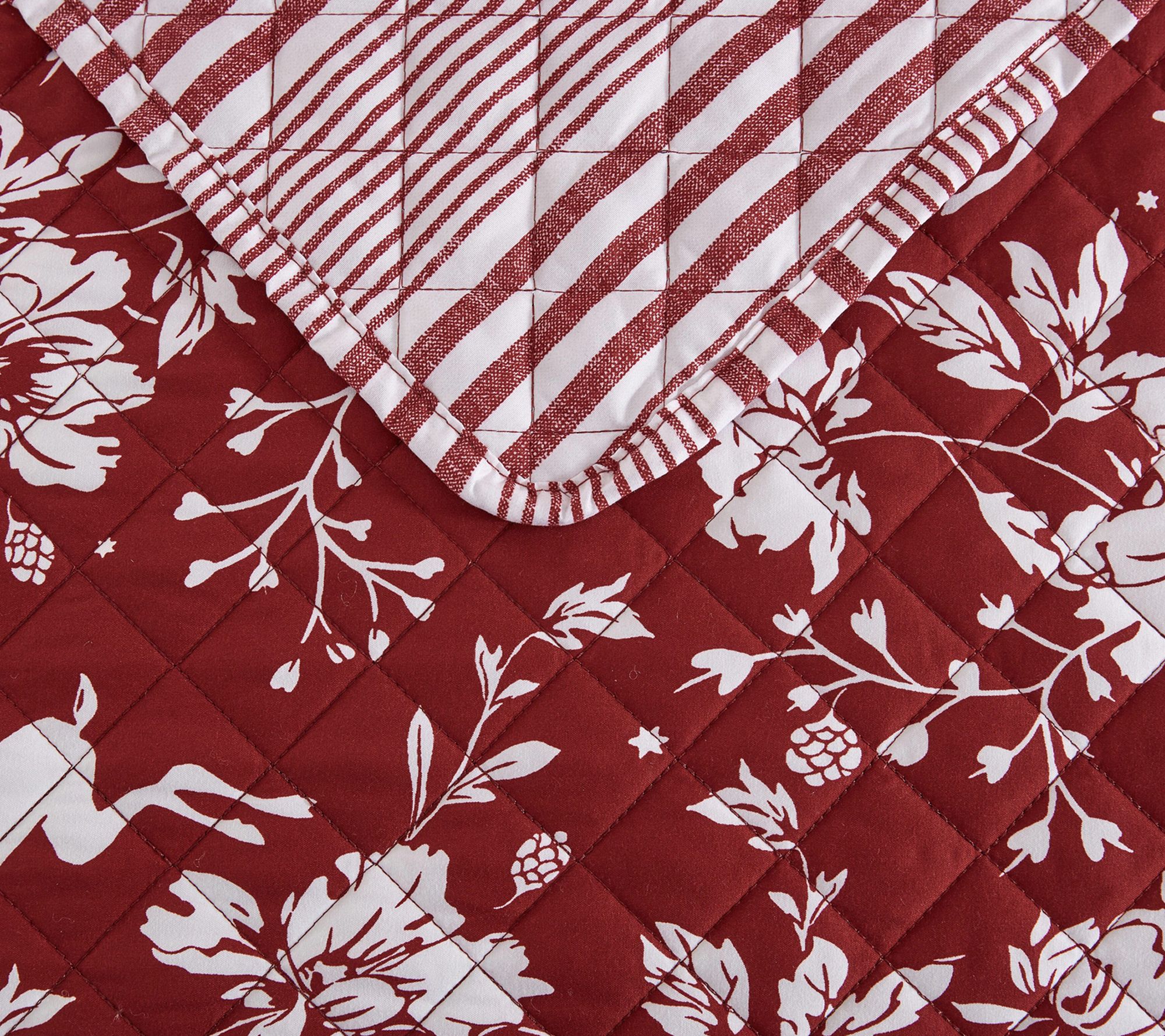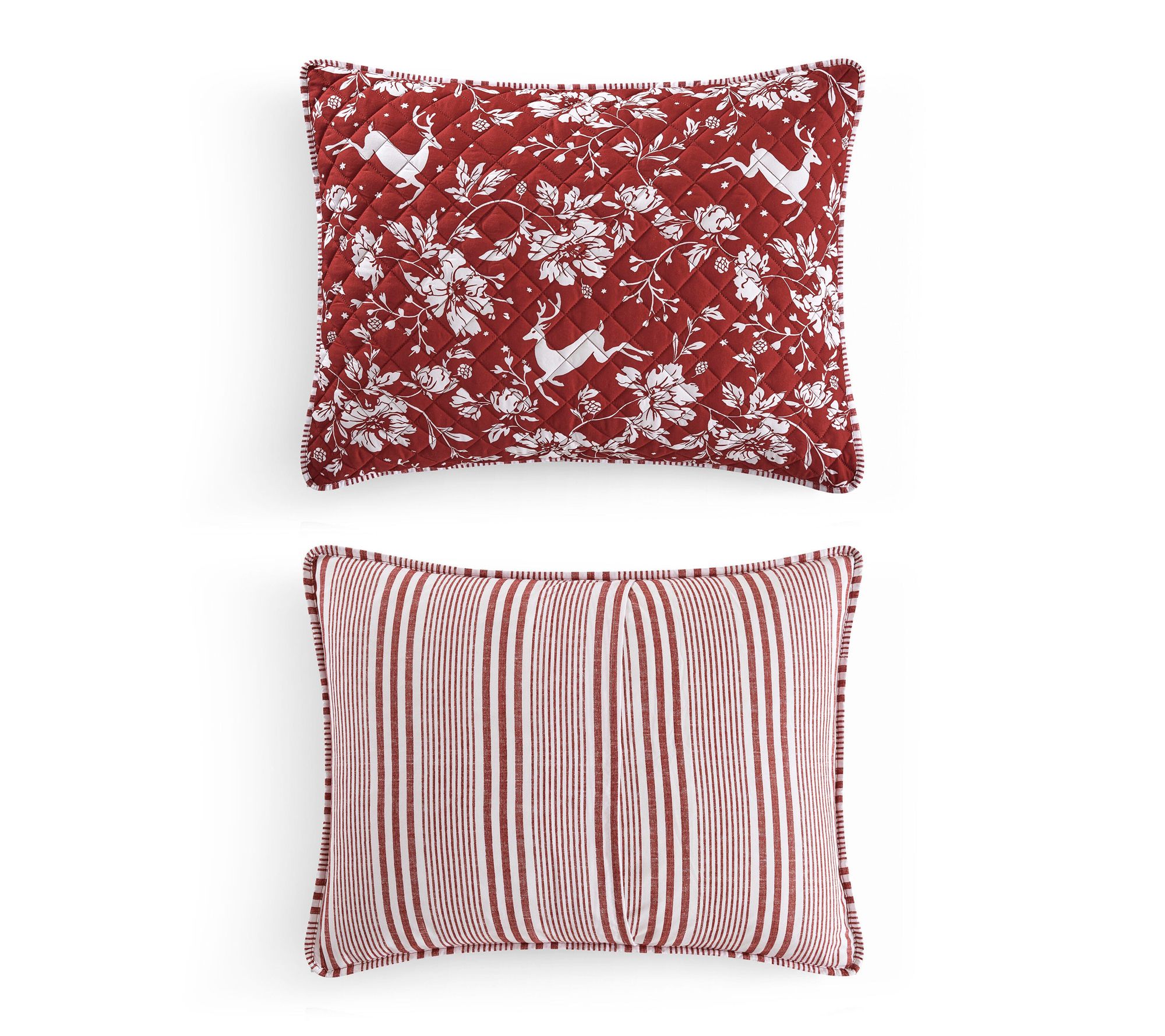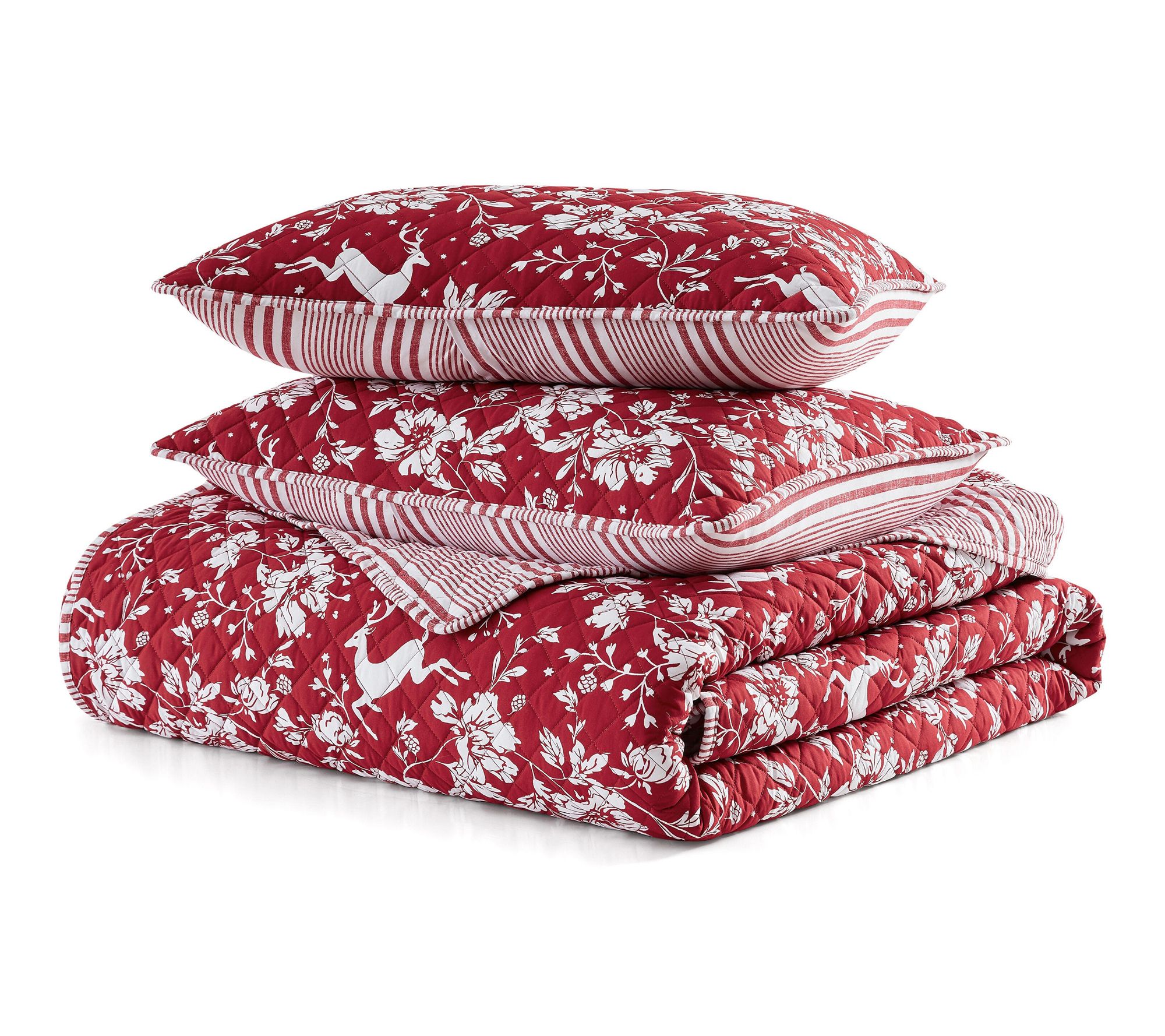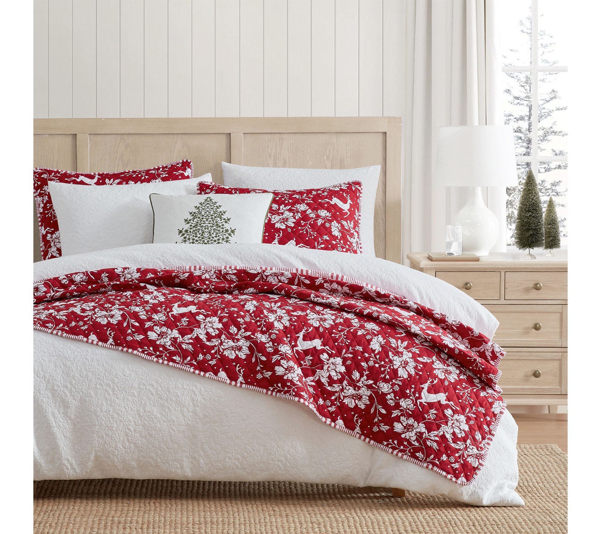Bring a festive touch to your bedroom with this quilt set, where a playful woodland deer and floral design in vibrant red and white creates a cozy haven that feels like a holiday retreat all season long. Lightweight and inviting, the quilt's intricate stitching adds texture and classic charm for restful nights and cheerful mornings. From Martha Stewart.