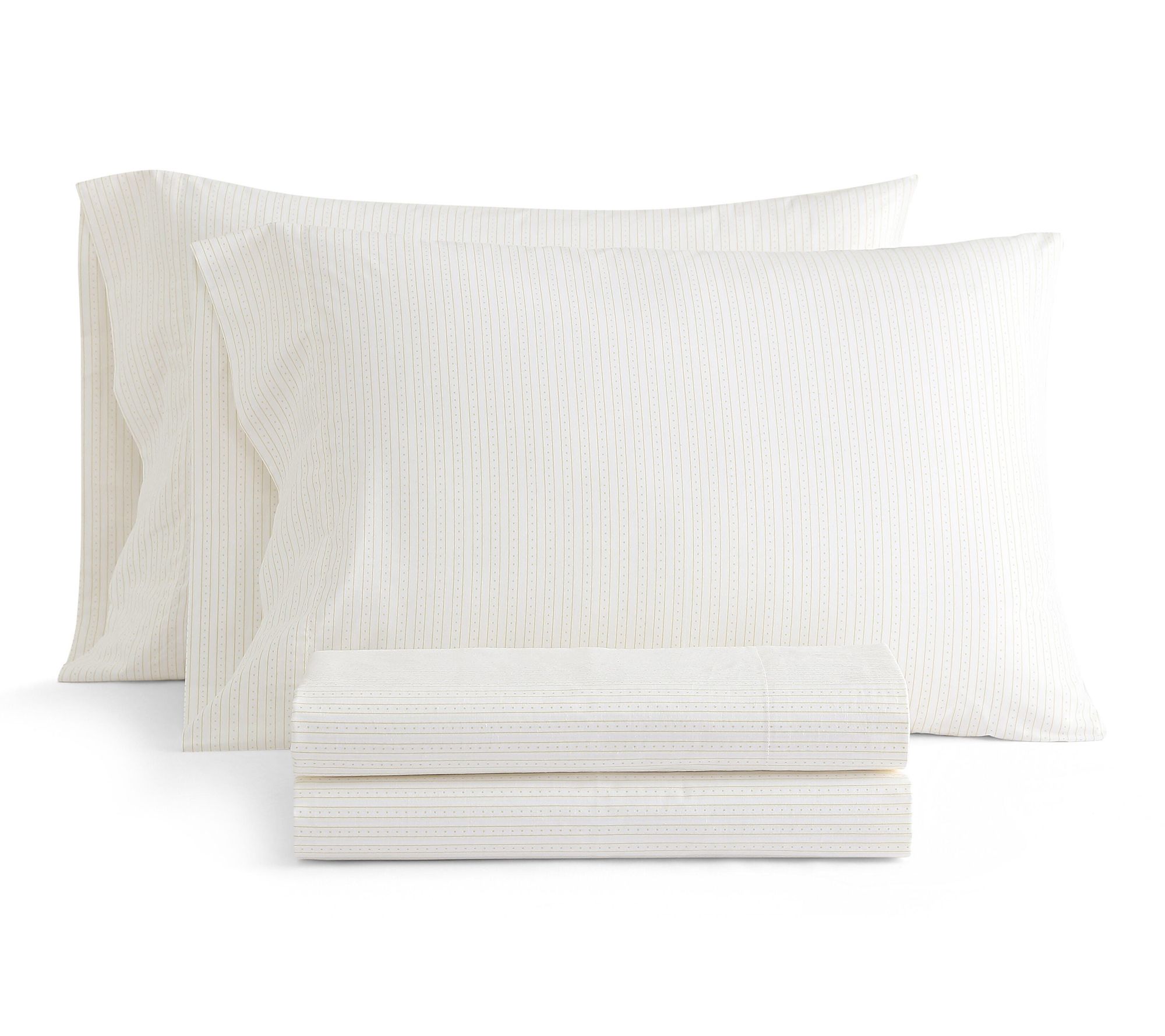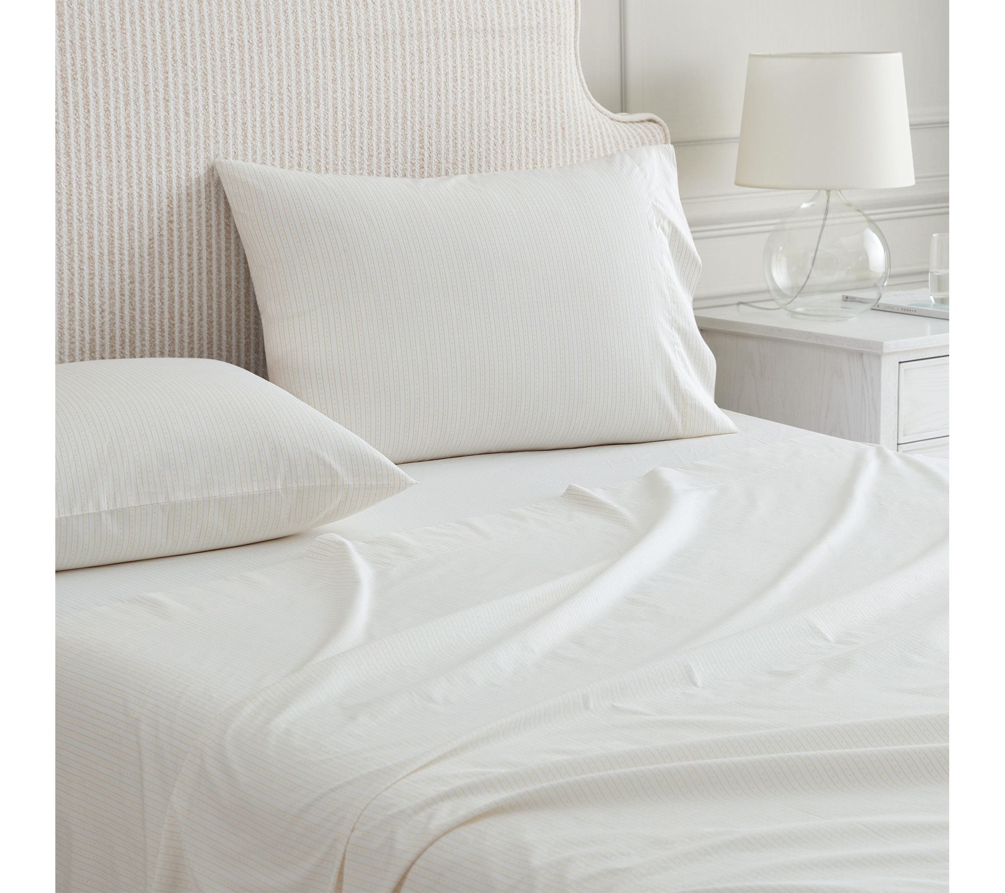 Serene mornings can begin with the inviting comfort of this sheet set, crafted from 100% cotton with crisp white fabric and softly gleaming gold dotted stripes. Enjoy the classic elegance of tailored hems and deep pocket fitted sheet, combining refined style with Martha Stewart's celebrated practicality for restful nights and beautifully dressed beds. From Martha Stewart.