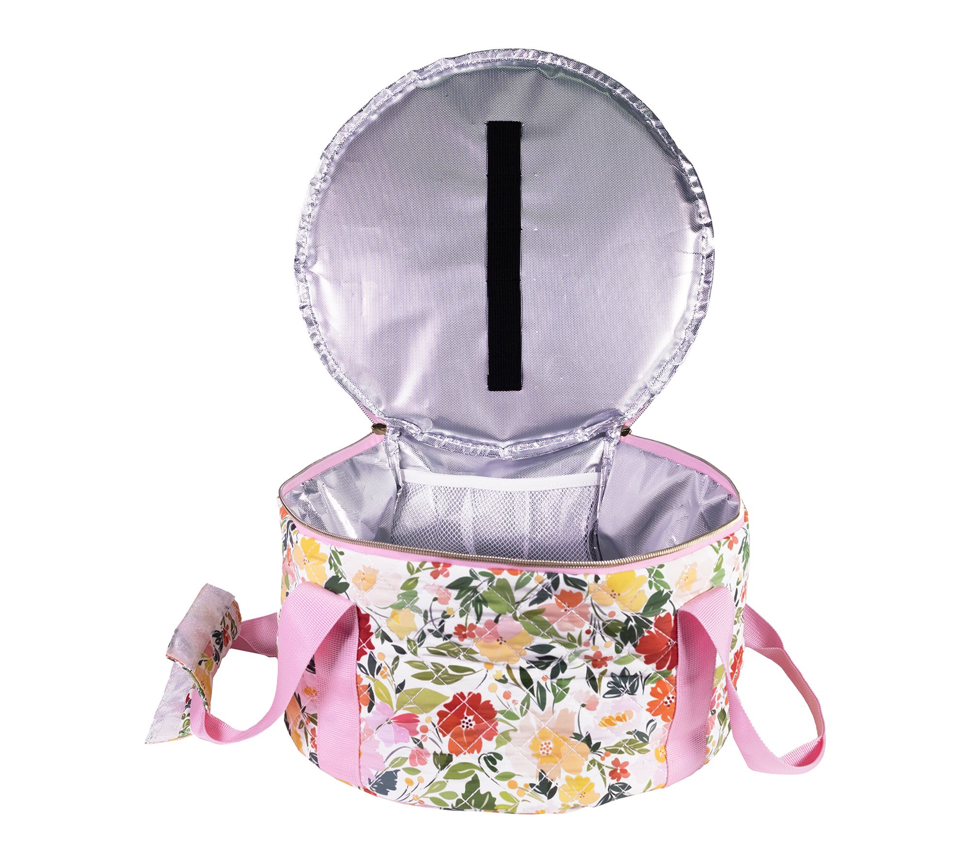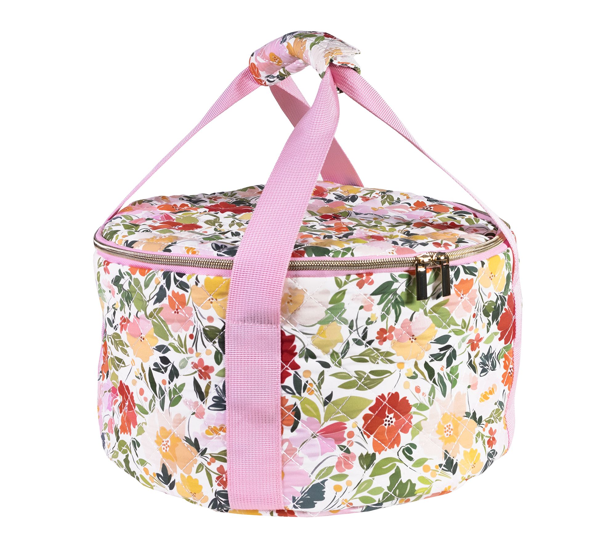 Savor the joy of sharing your signature dishes at gatherings with this Dutch oven carrier, featuring a vibrant floral exterior and pink trim. Its heat-resistant lining helps keep your meal warm, while zip closure, double handles, and an interior pocket make toting your favorite recipes stylishly simple. From Martha Stewart.