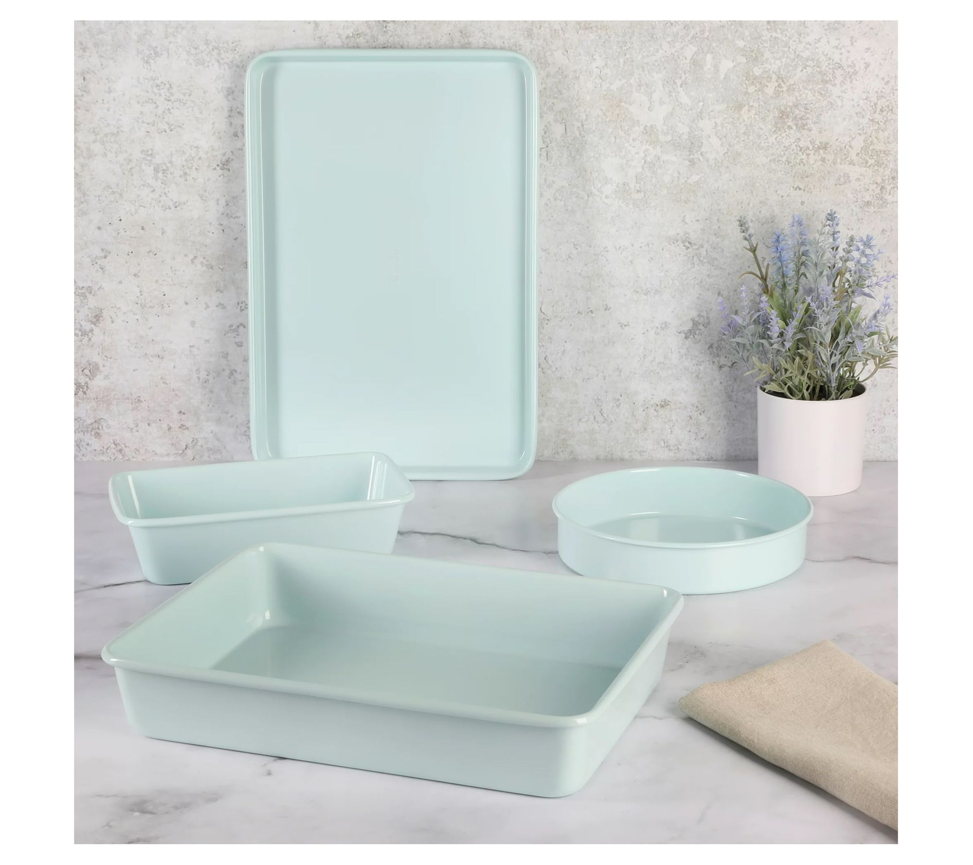 • Includes loaf pan, cake pan, cookie sheet, and baking pan
