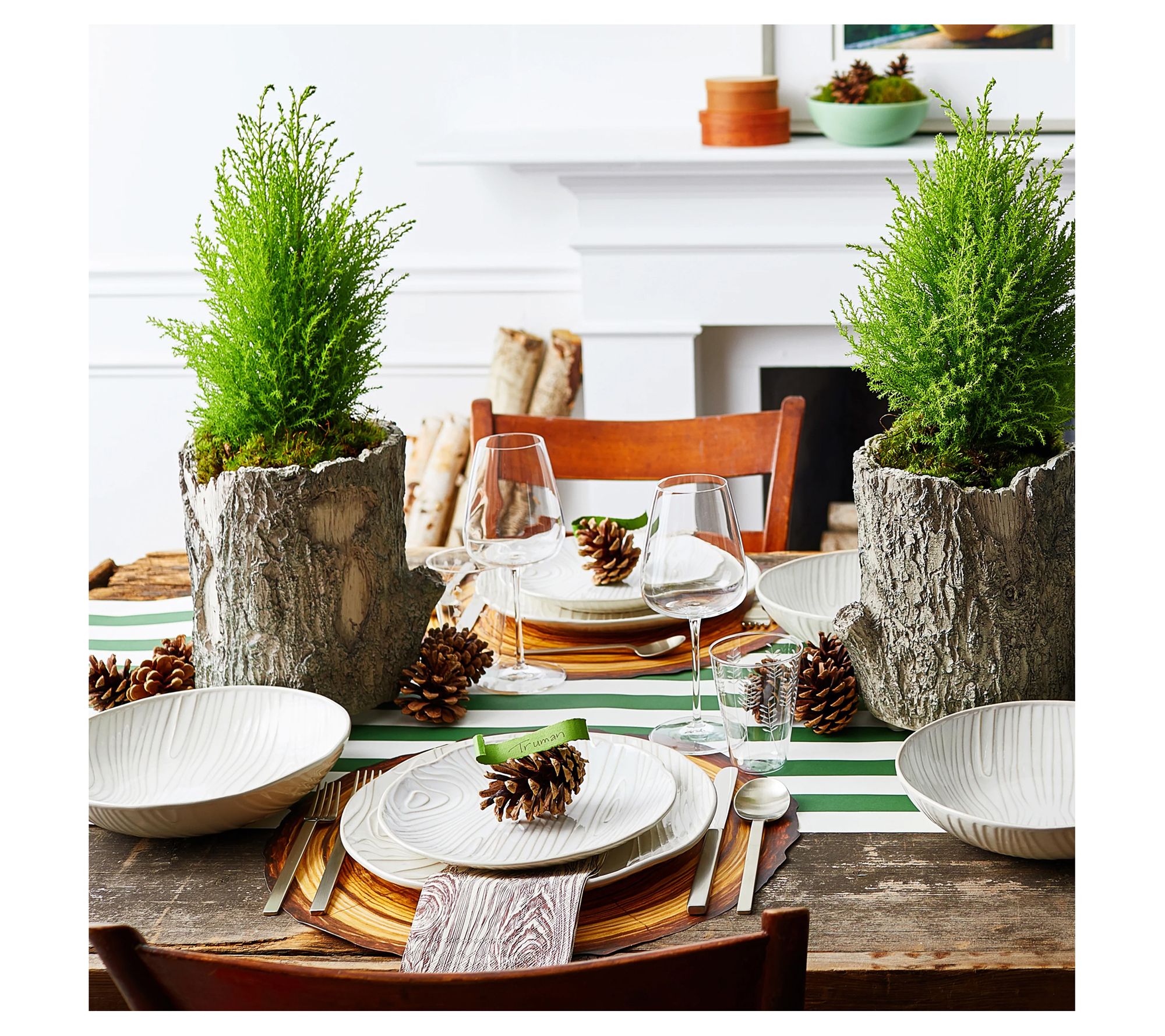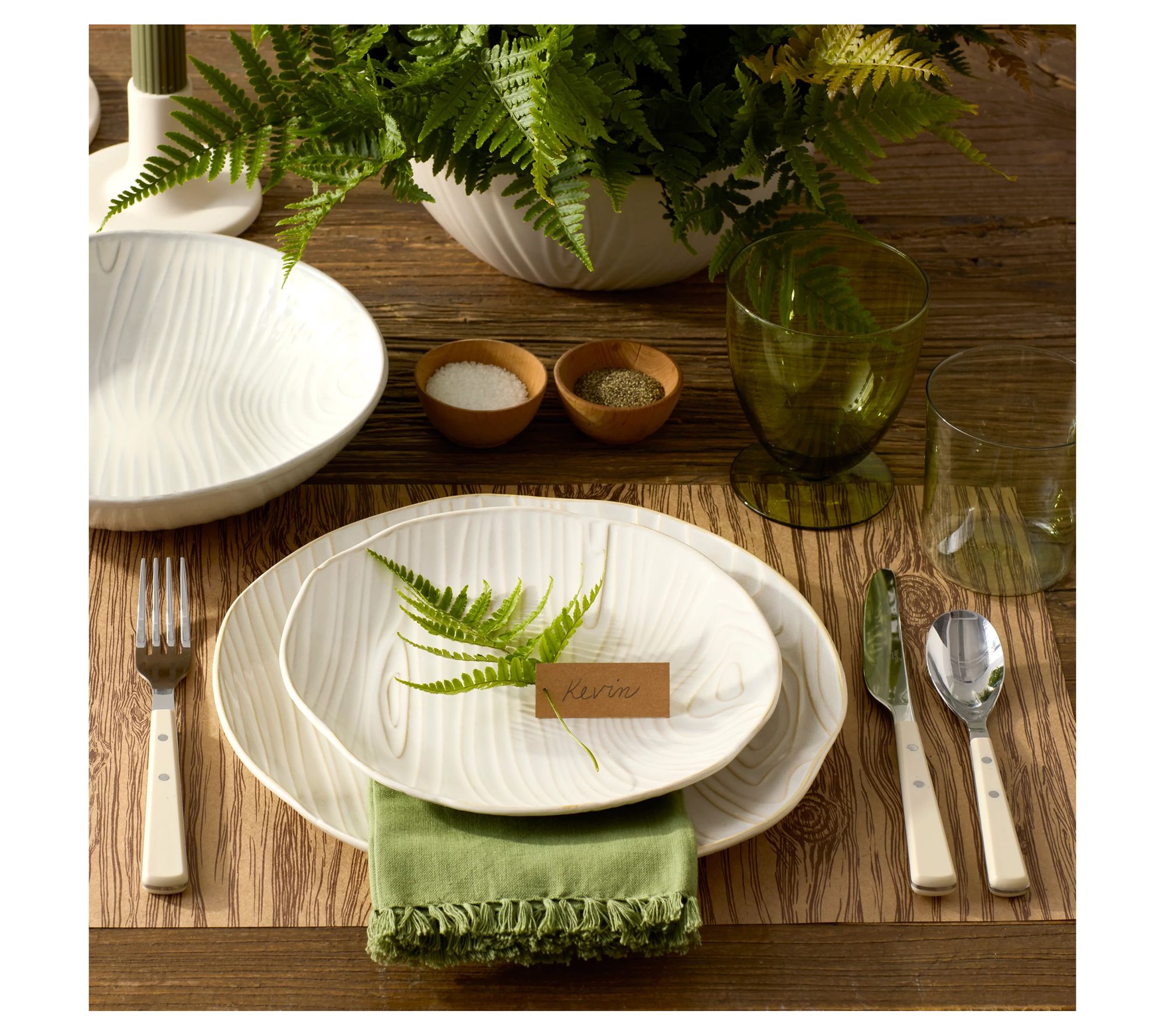 Bring the essence of nature into your dining room with the captivating design of the Faux Bois dinnerware set. Each piece is embossed with bark-inspired patterns to add texture and dimension to your table. From Martha Stewart.