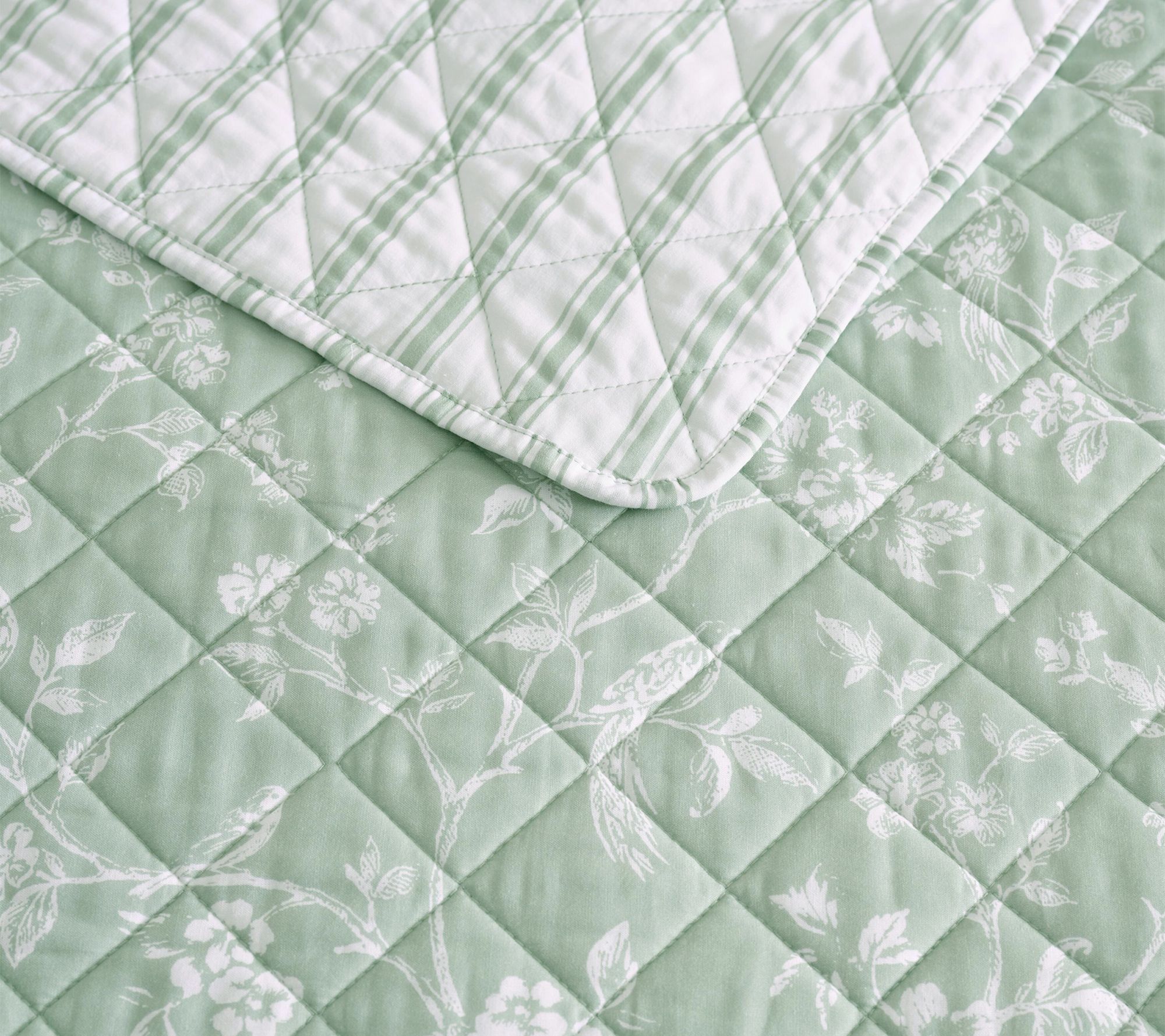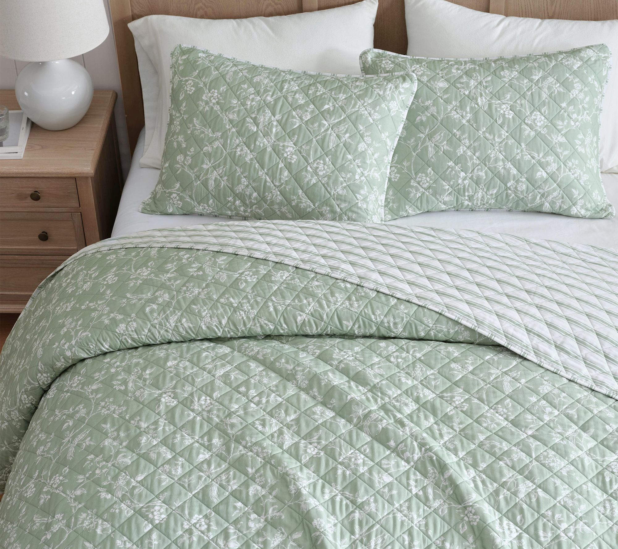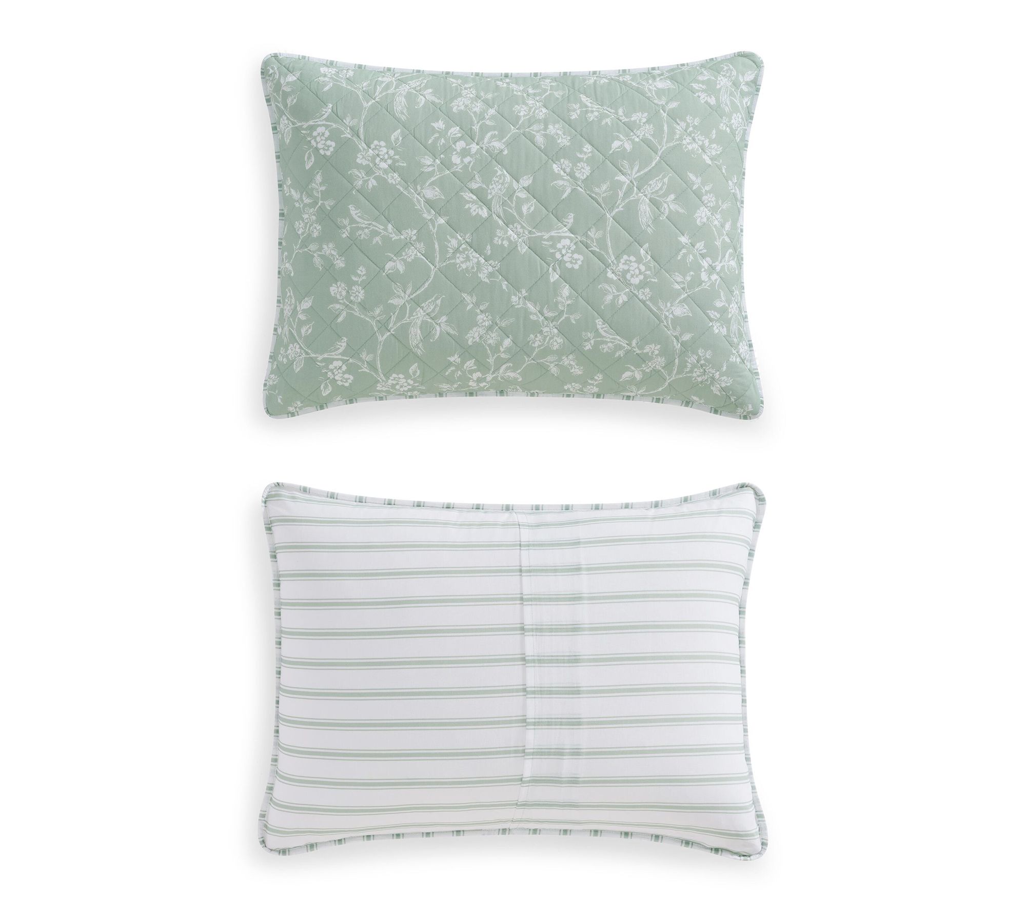 Let tranquil, French-inspired elegance set the tone for your bedroom retreat with this quilt set. A graceful sage green and white bird and floral motif lend a timeless touch, while the reversible design offers a classic stripe to refresh your look whenever the mood strikes. Lightweight comfort makes it ideal for layering, so you can enjoy year-round coziness. From Martha Stewart.