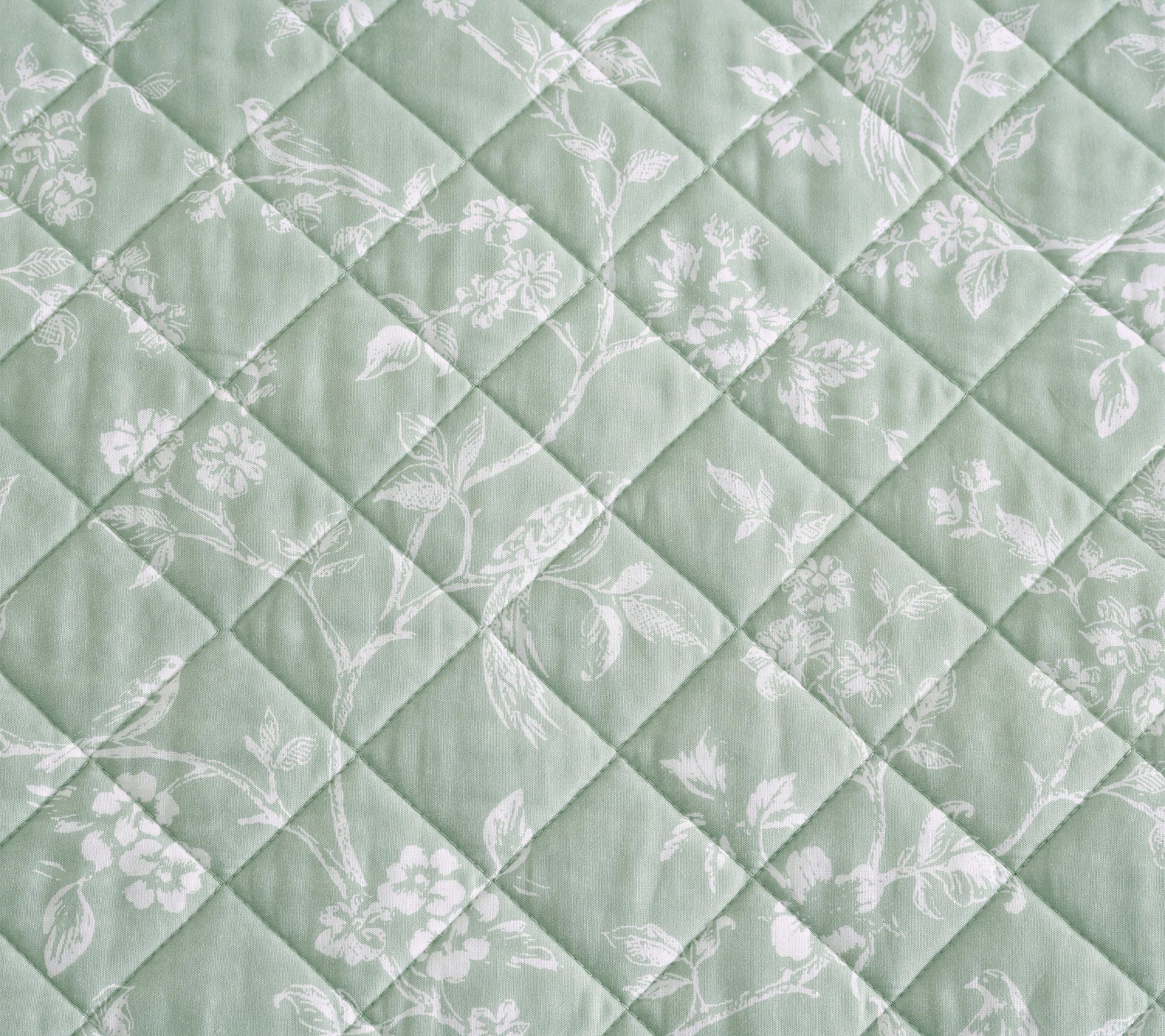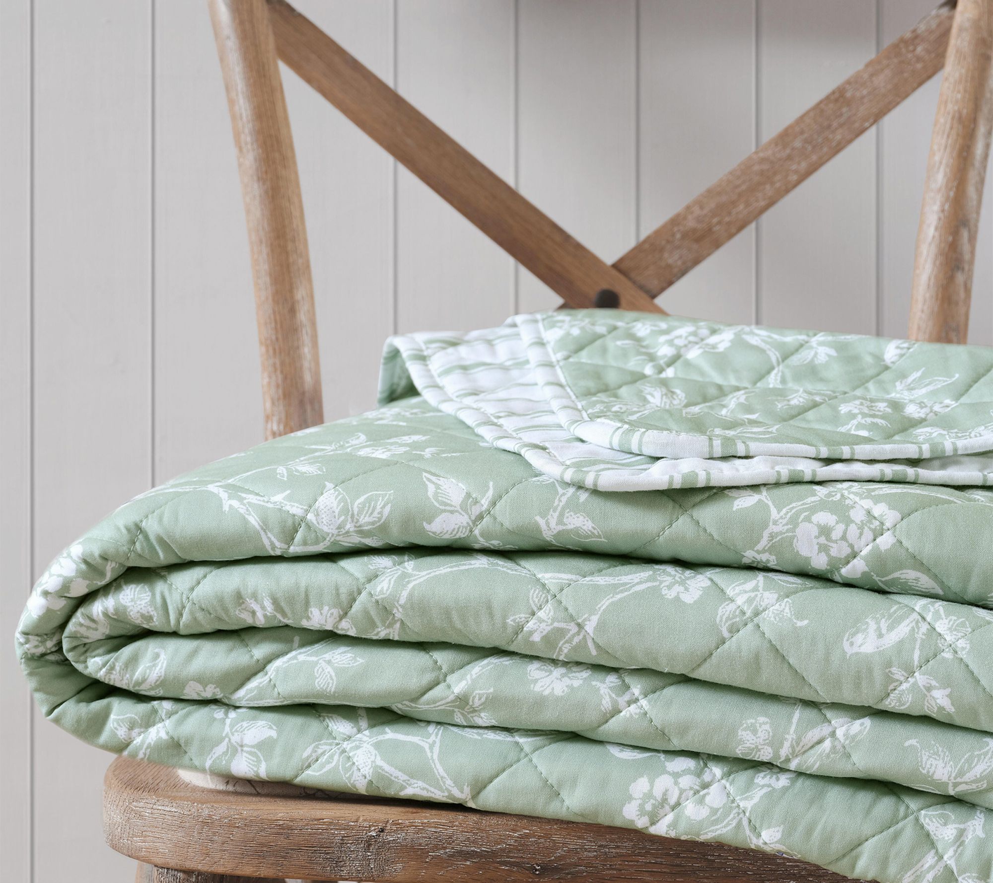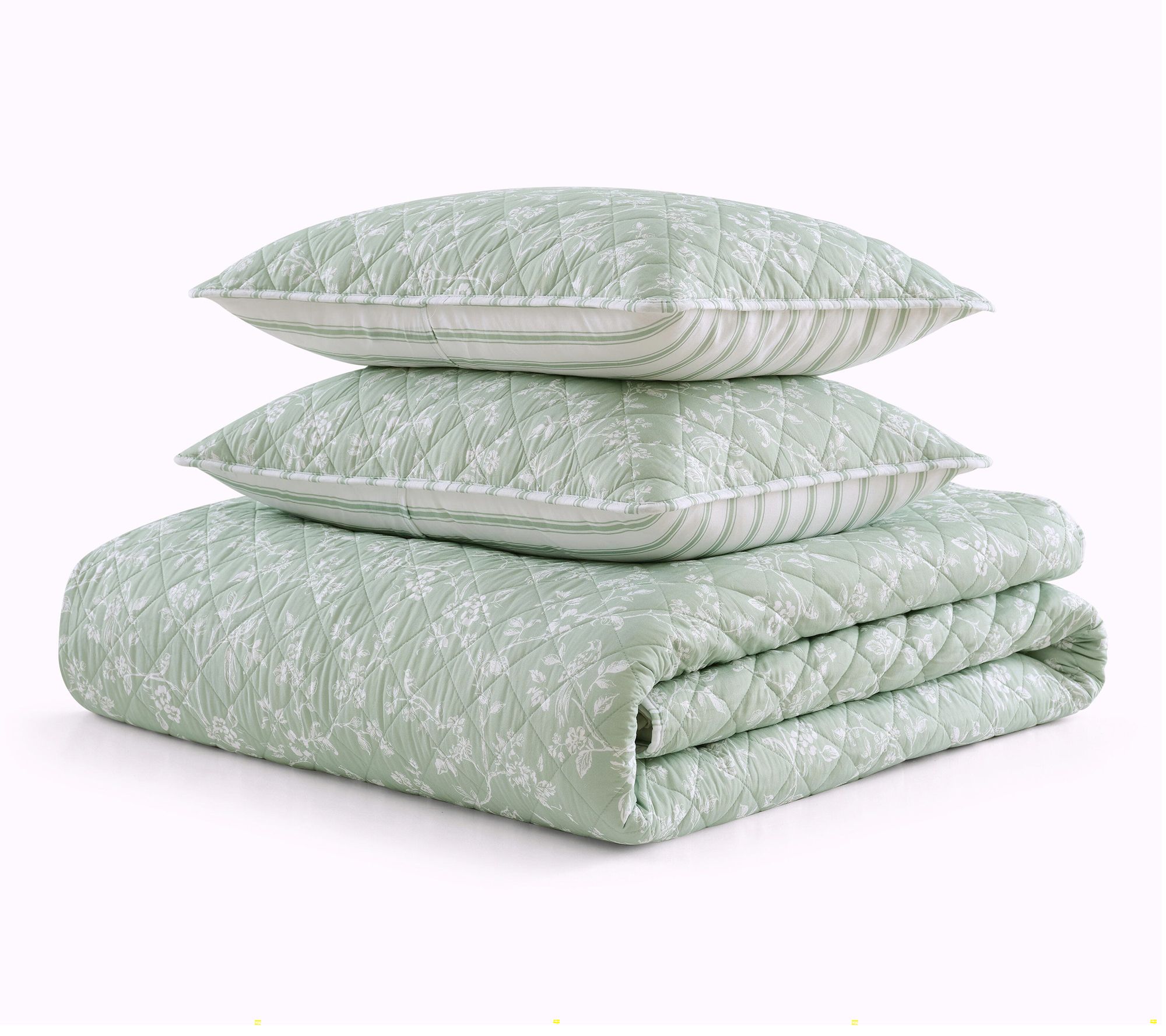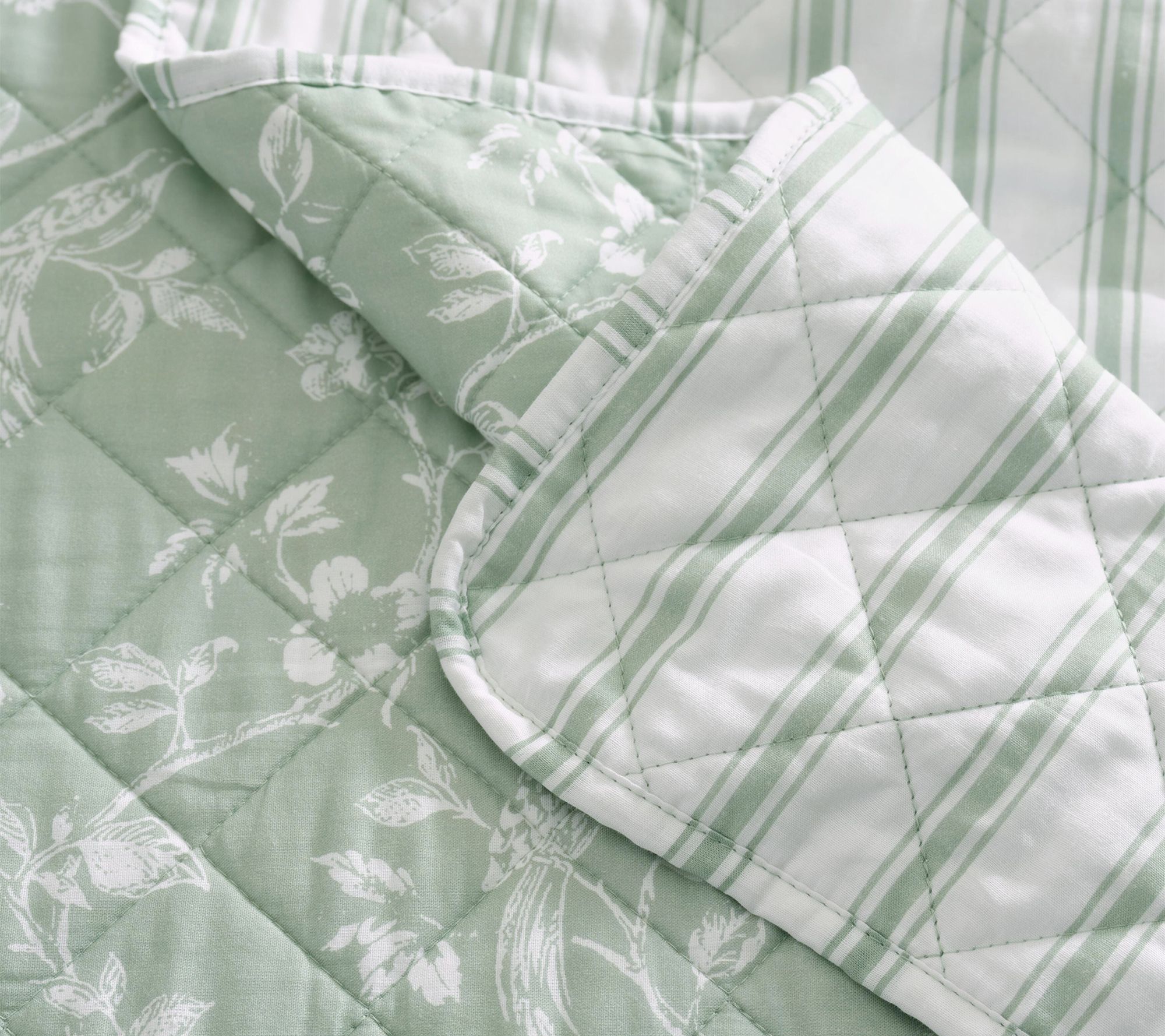 Let tranquil, French-inspired elegance set the tone for your bedroom retreat with this quilt set. A graceful sage green and white bird and floral motif lend a timeless touch, while the reversible design offers a classic stripe to refresh your look whenever the mood strikes. Lightweight comfort makes it ideal for layering, so you can enjoy year-round coziness. From Martha Stewart.