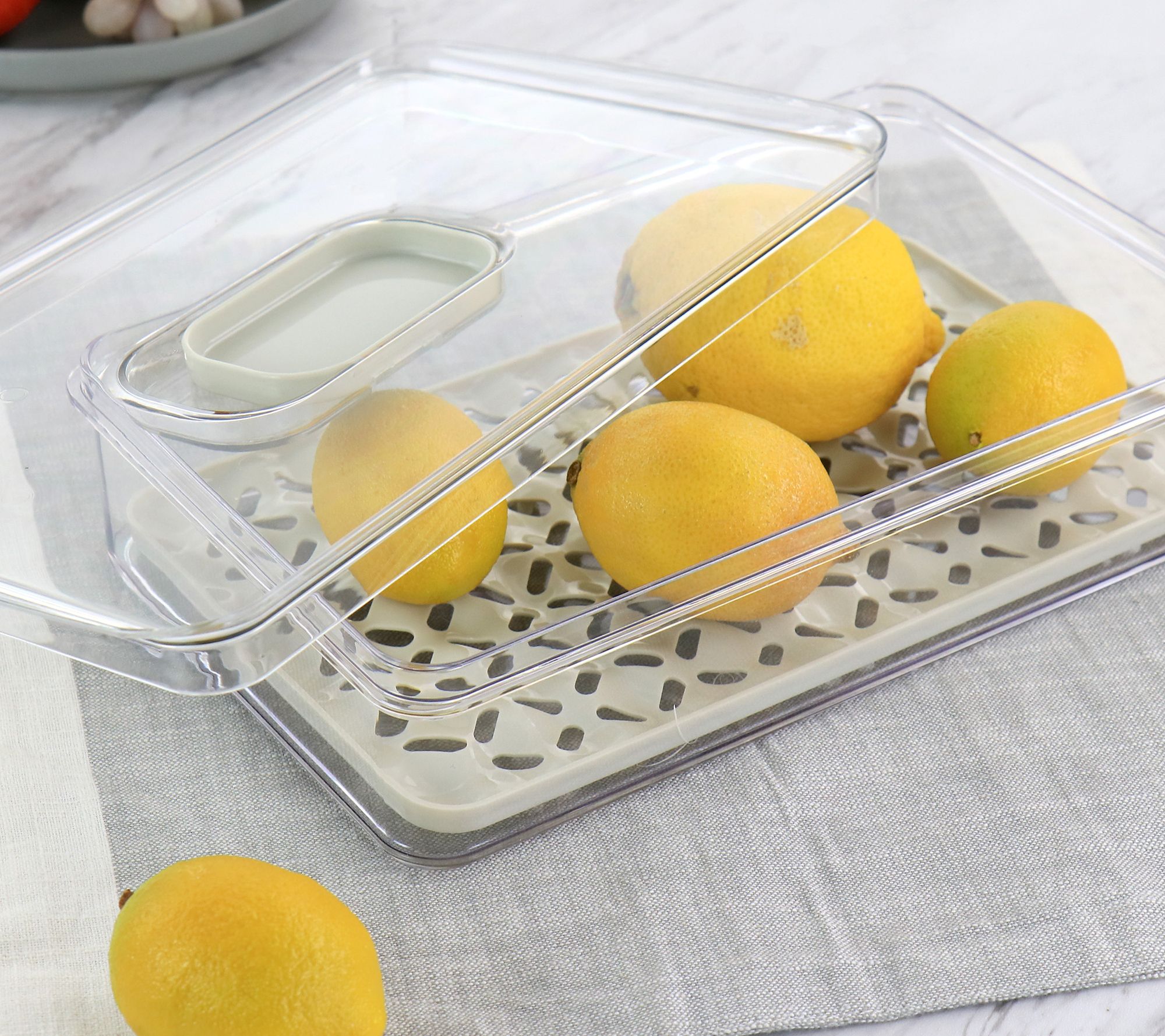 Keep your food well ventilated and contained with this fresh keeper set. It features a plastic container and a lid with a vented slider. It also comes equipped with a removable basket that has an elevated bottom to help promote airflow. From Martha Stewart.