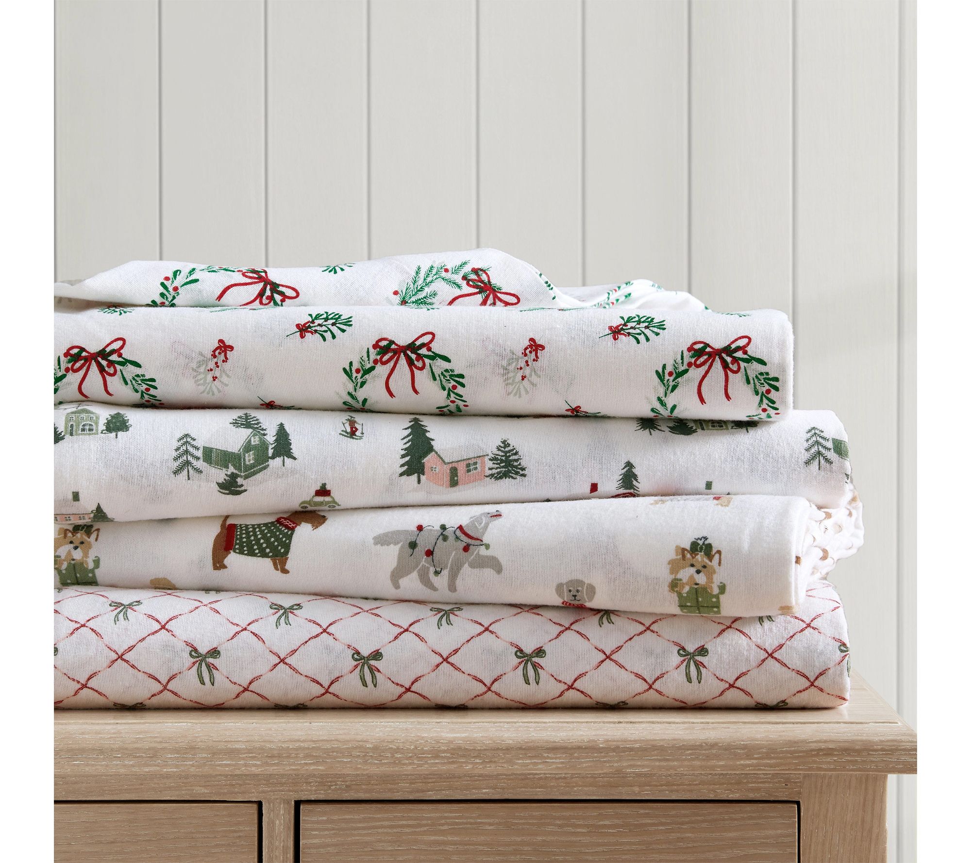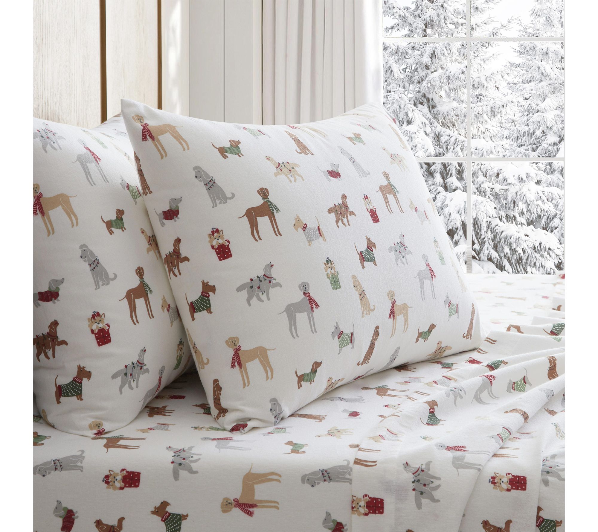 Spread seasonal joy in your bedroom with this flannel sheet set, adorned with playful pups decked out in holiday scarves, sweaters, and garlands. The inviting softness of brushed 100% cotton keeps you comfortable while adding a dash of festive whimsy -- whether it's for overnight guests or your own wintertime haven. From Martha Stewart.