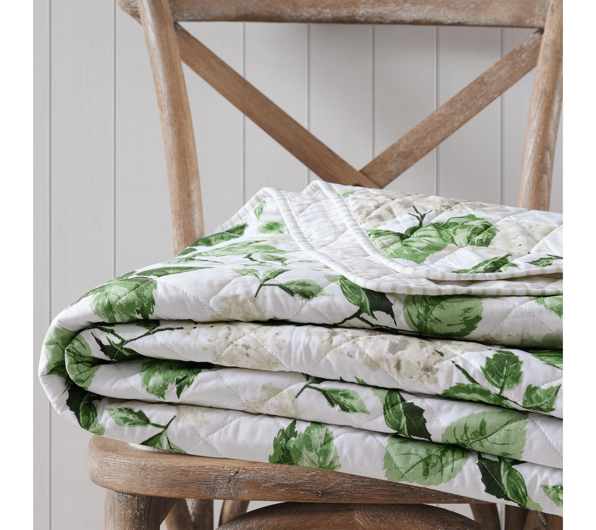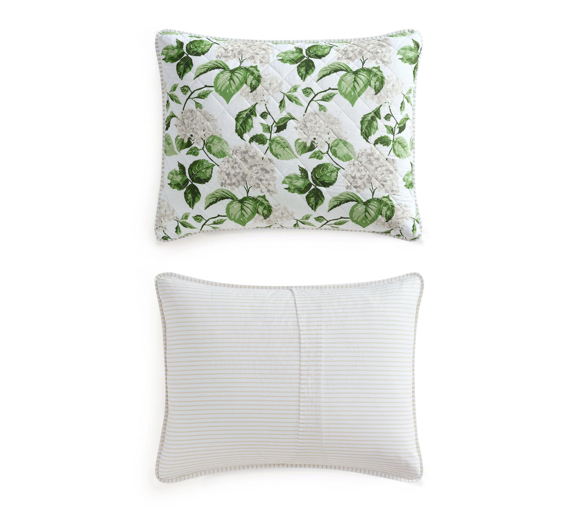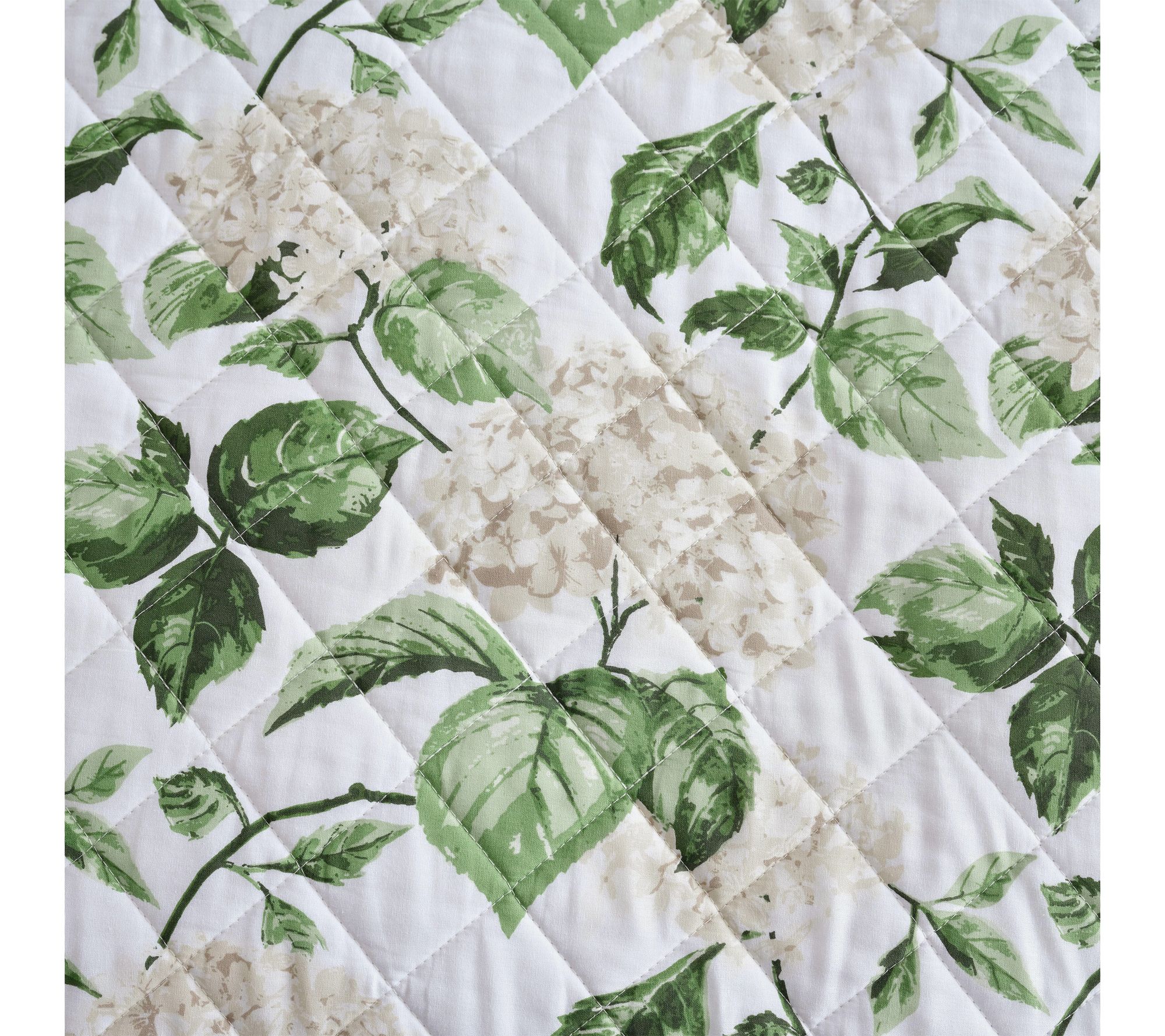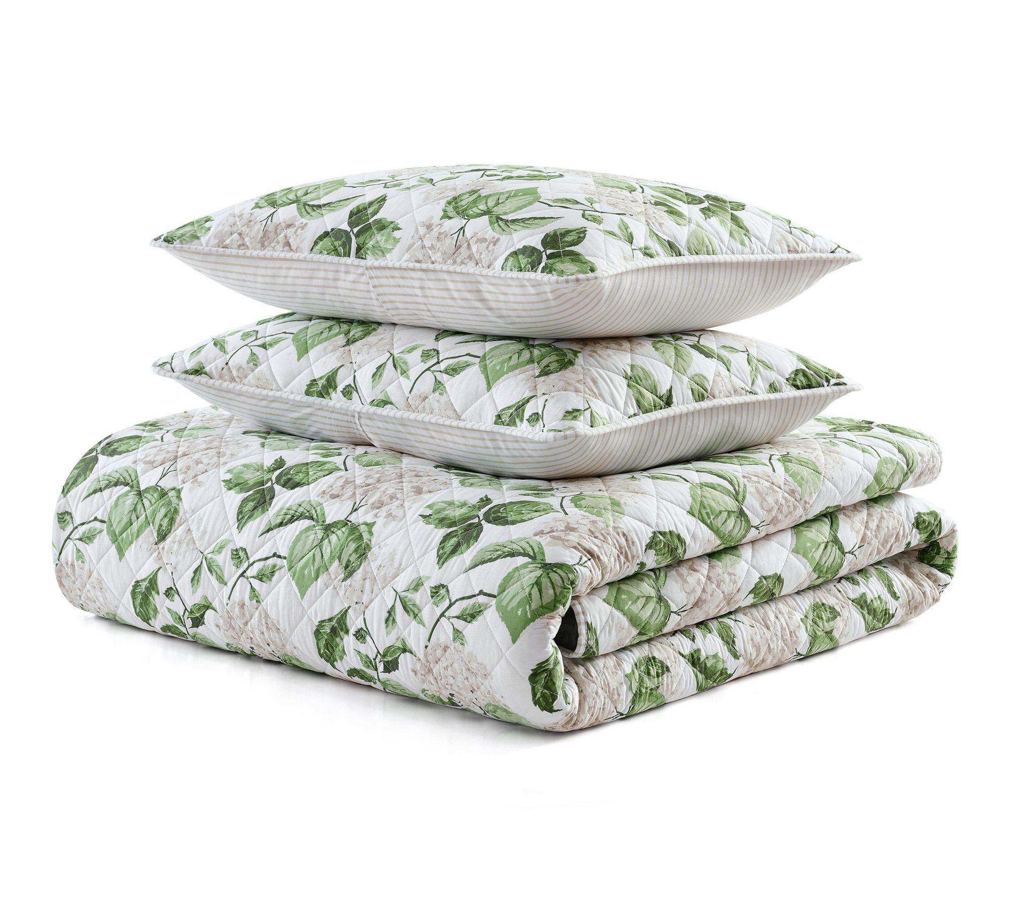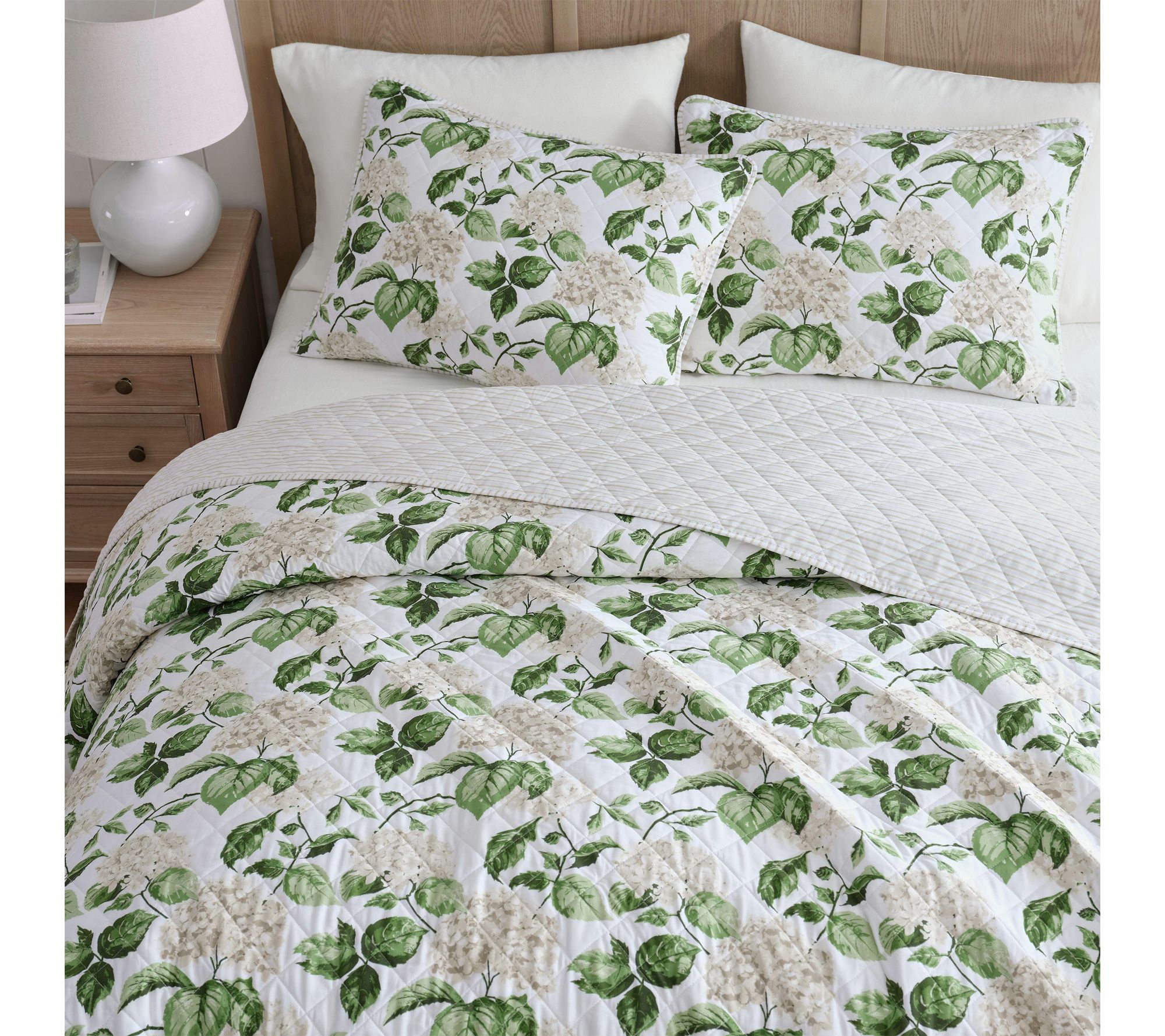 A fresh take on timeless botanical style, this hydrangea floral quilt set brings subtle color and soft elegance to your restful retreat. Crafted from 100% cotton with a gentle quilted texture, the reversible design lets you switch from lush blooms to classic ticking stripes with ease. Lightweight comfort and easy care make it a favorite for both year-round layering and seasonal refreshes. From Martha Stewart.