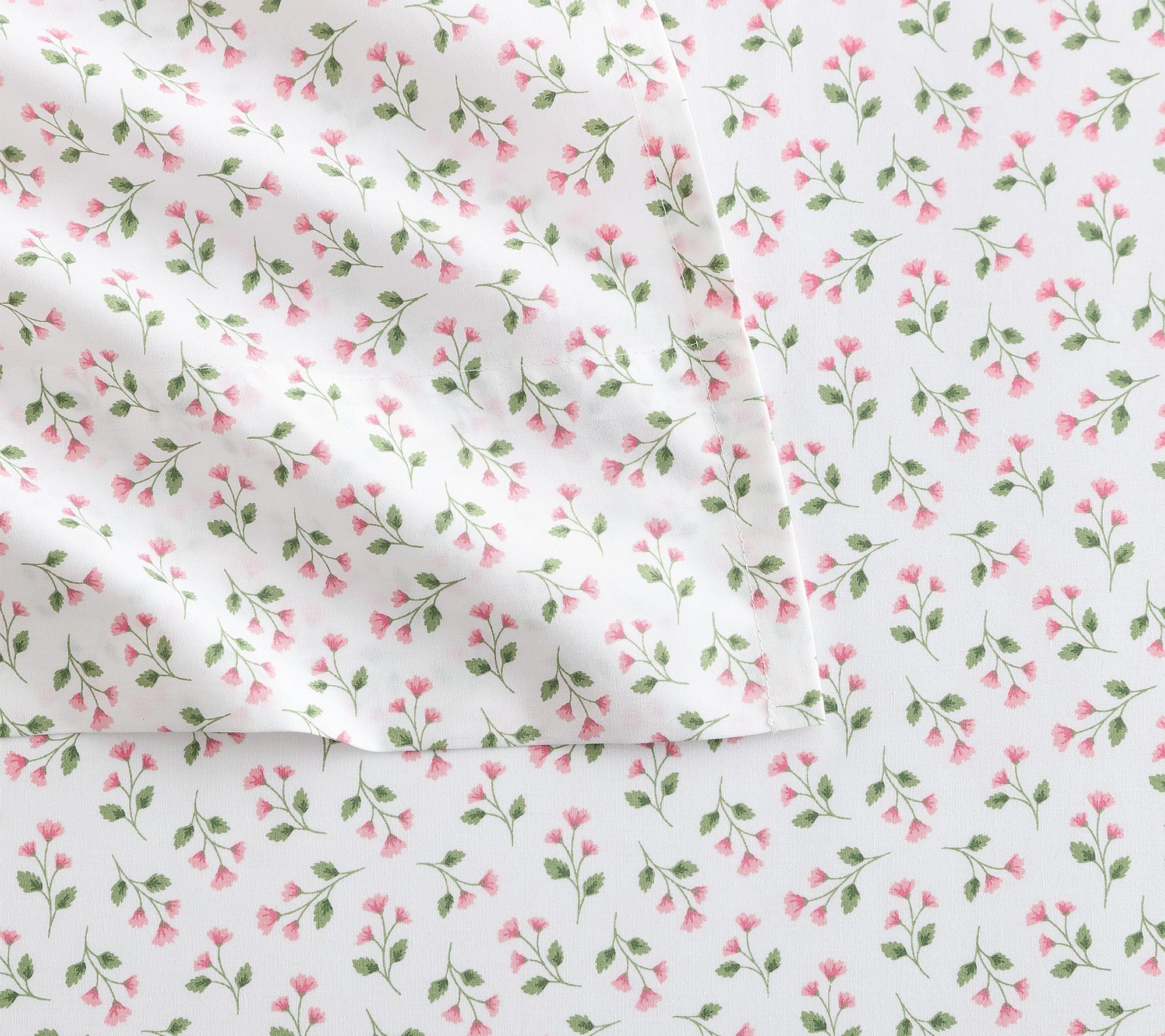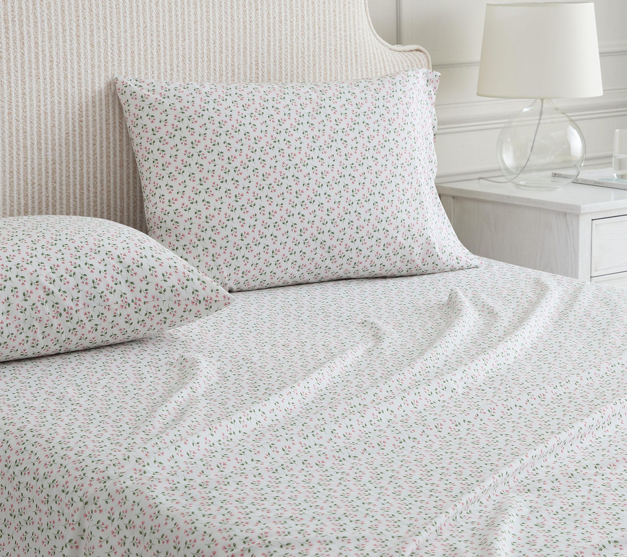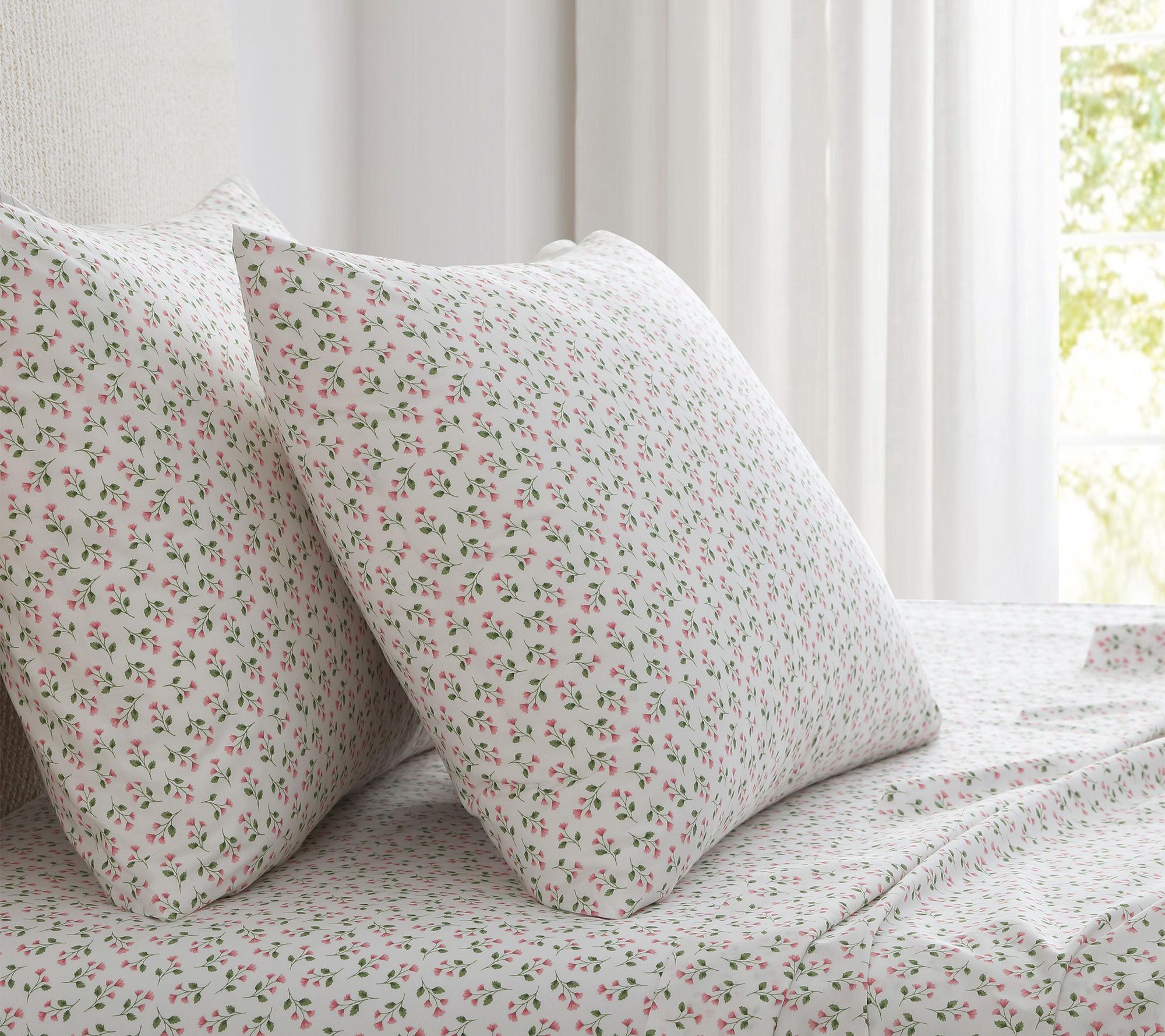 Enjoy moments of relaxation surrounded by the elegant charm of these floral sheets, crafted with soft cotton and adorned with scattered poppy pink sprigs and green leaves on a white background. The set features crisp, cool comfort and graceful details, inviting a touch of everyday luxury that easily complements both farmhouse and sophisticated decor. From Martha Stewart.
