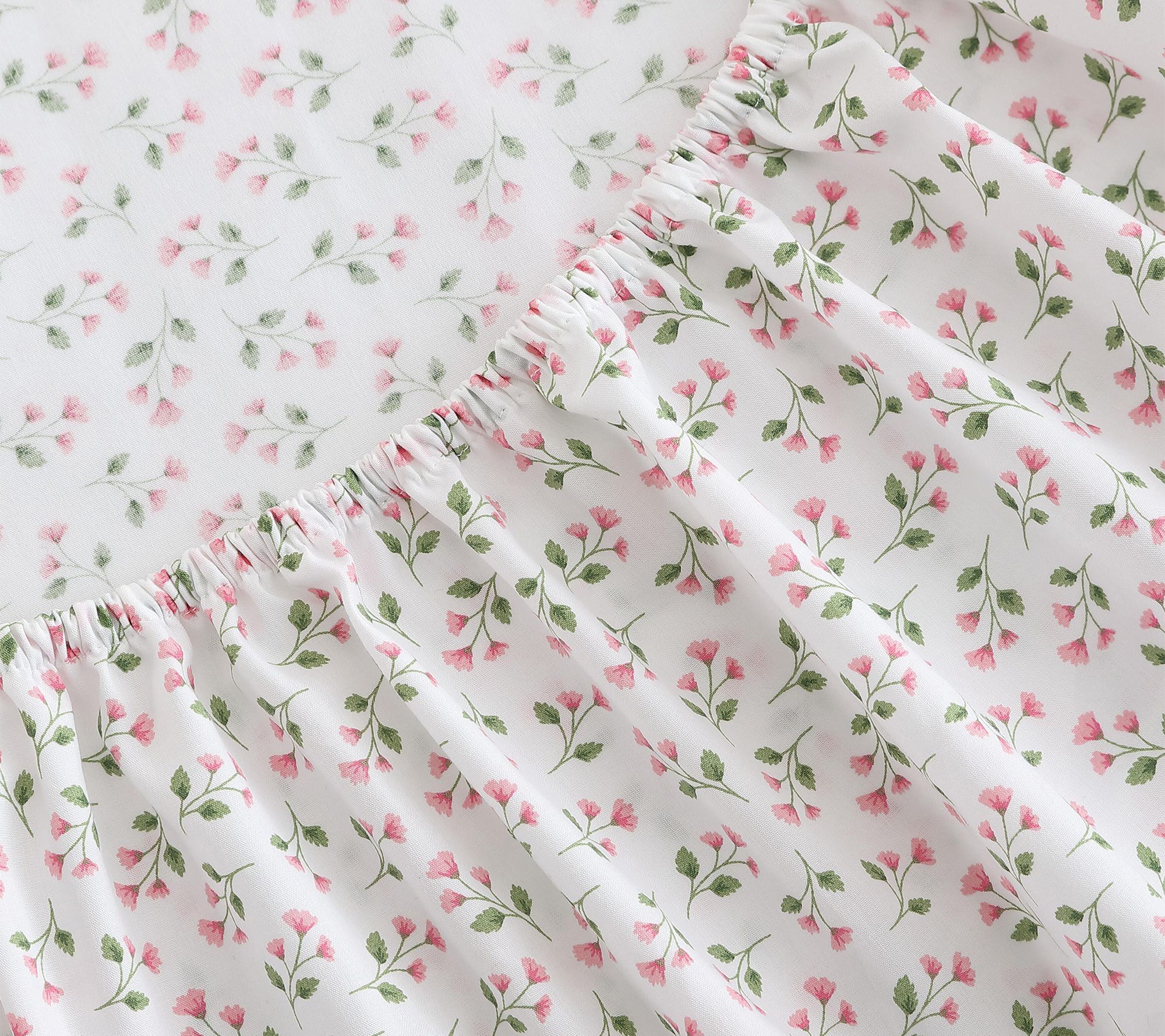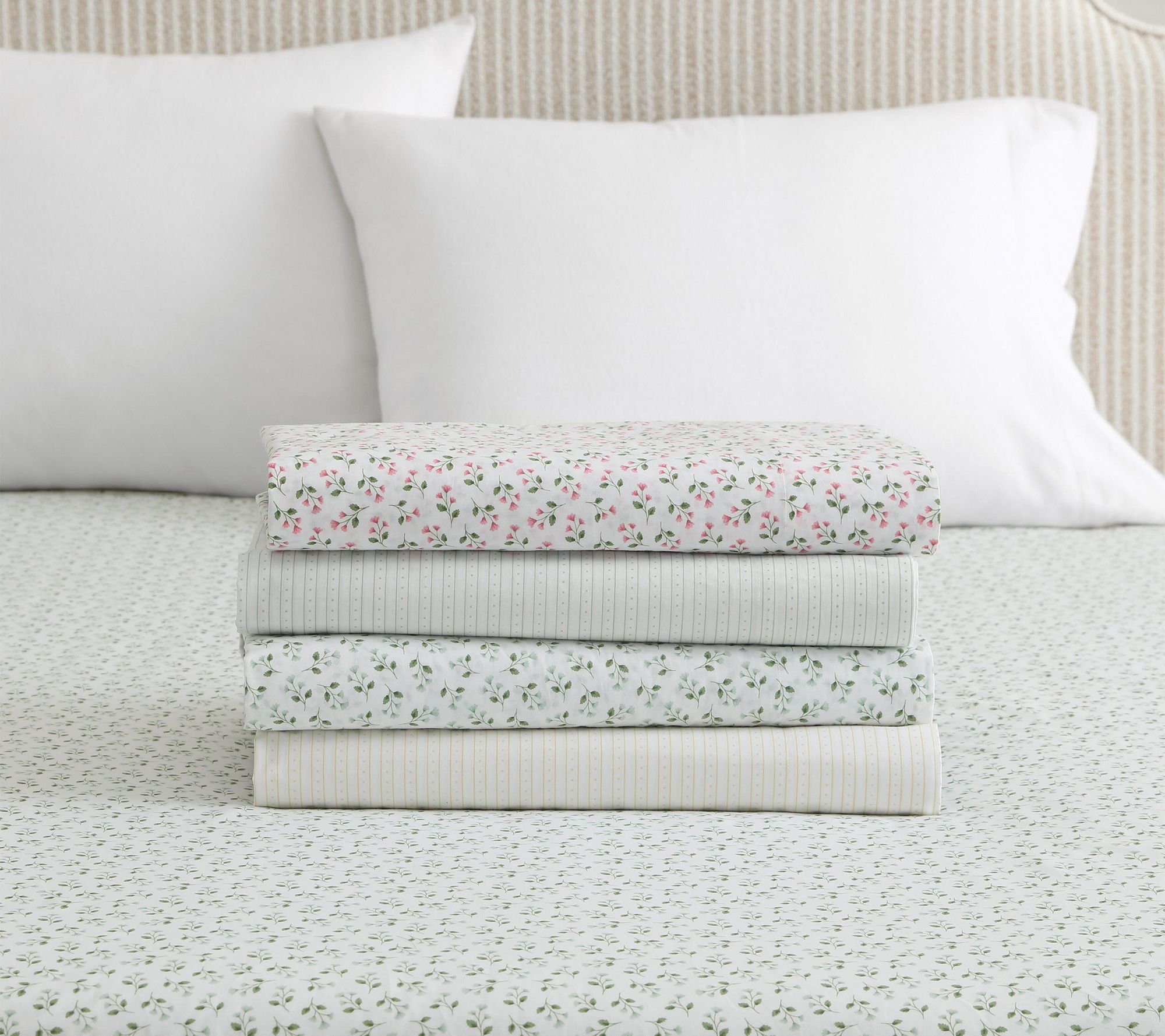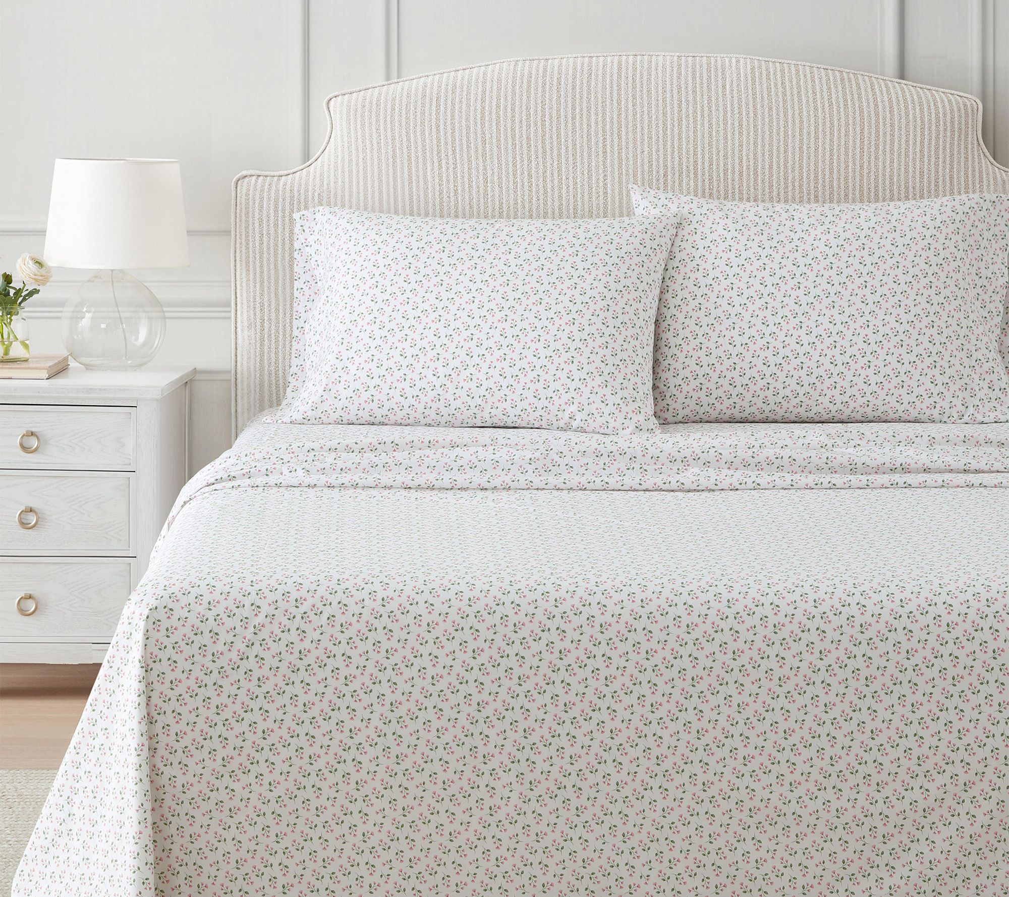 Enjoy moments of relaxation surrounded by the elegant charm of these floral sheets, crafted with soft cotton and adorned with scattered poppy pink sprigs and green leaves on a white background. The set features crisp, cool comfort and graceful details, inviting a touch of everyday luxury that easily complements both farmhouse and sophisticated decor. From Martha Stewart.