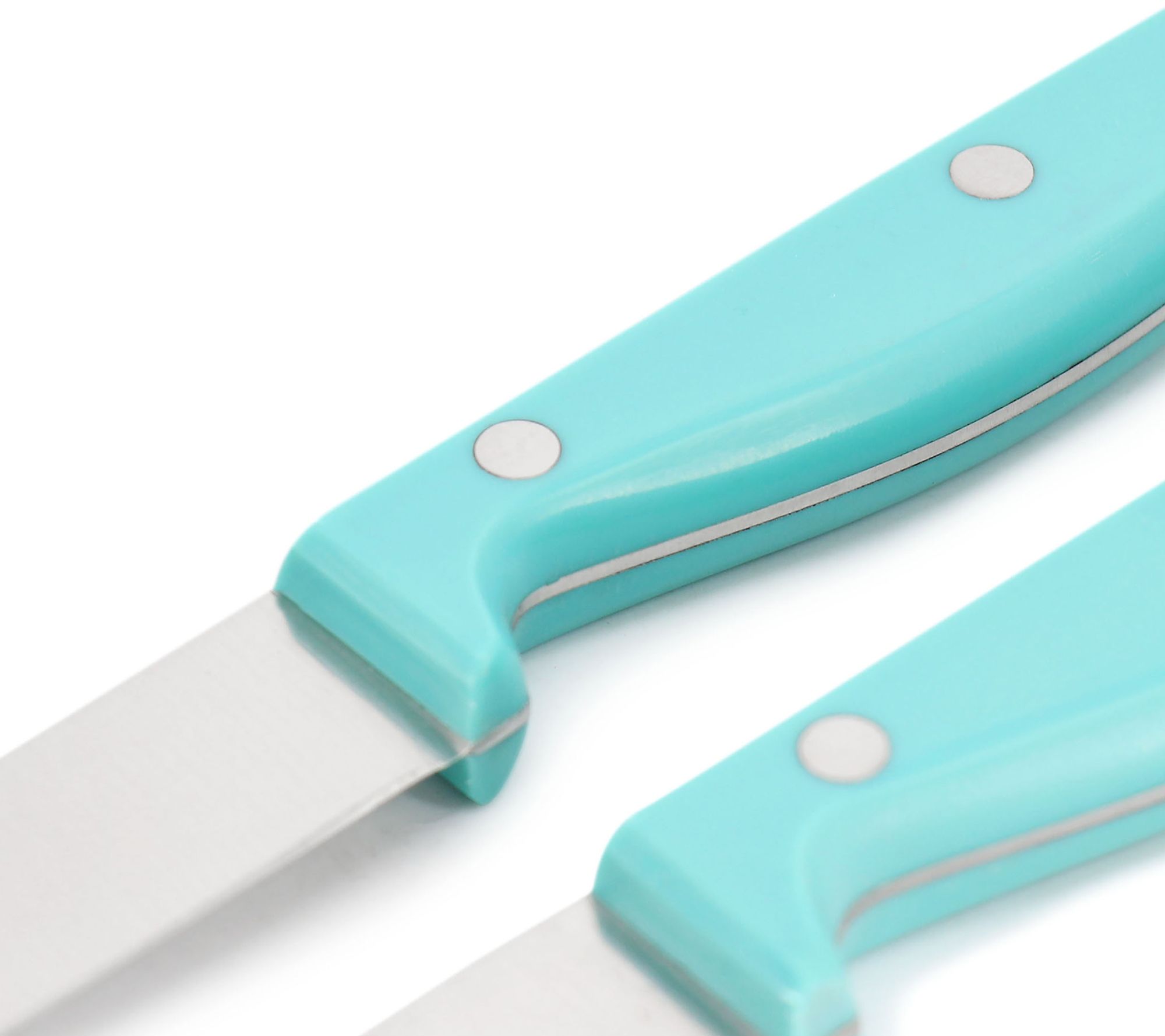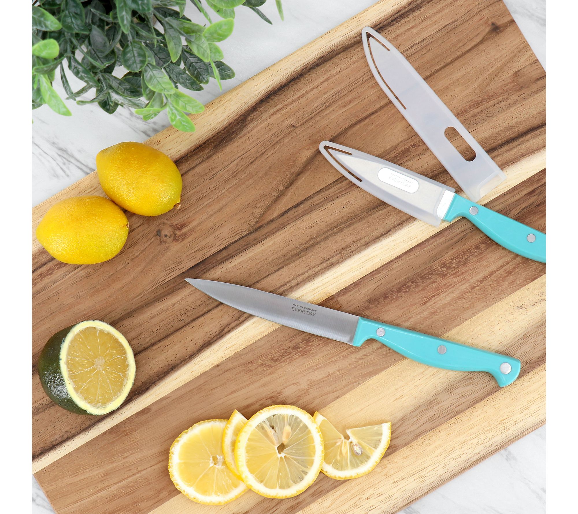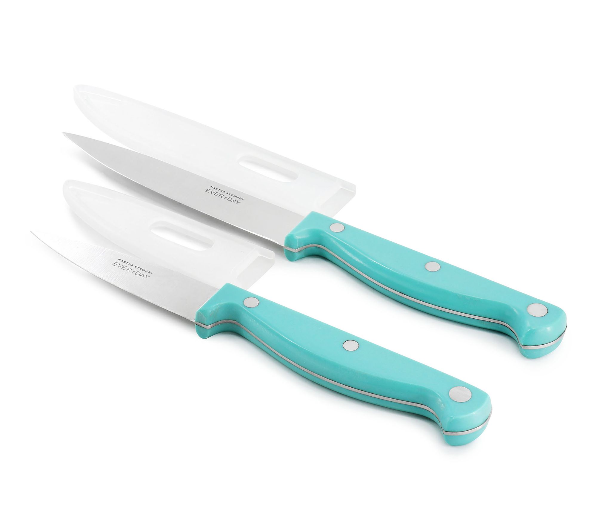 Prep your favorite meals with confidence using this cutlery set, featuring a utility knife and paring knife designed for everyday chopping, slicing, and dicing. Ergonomic, triple-riveted handles offer a secure grip, while high-carbon stainless steel blades deliver exceptional sharpness for effortless kitchen tasks. Safe storage is a breeze with included sheaths, making cleanup and organization simple. From Martha Stewart.