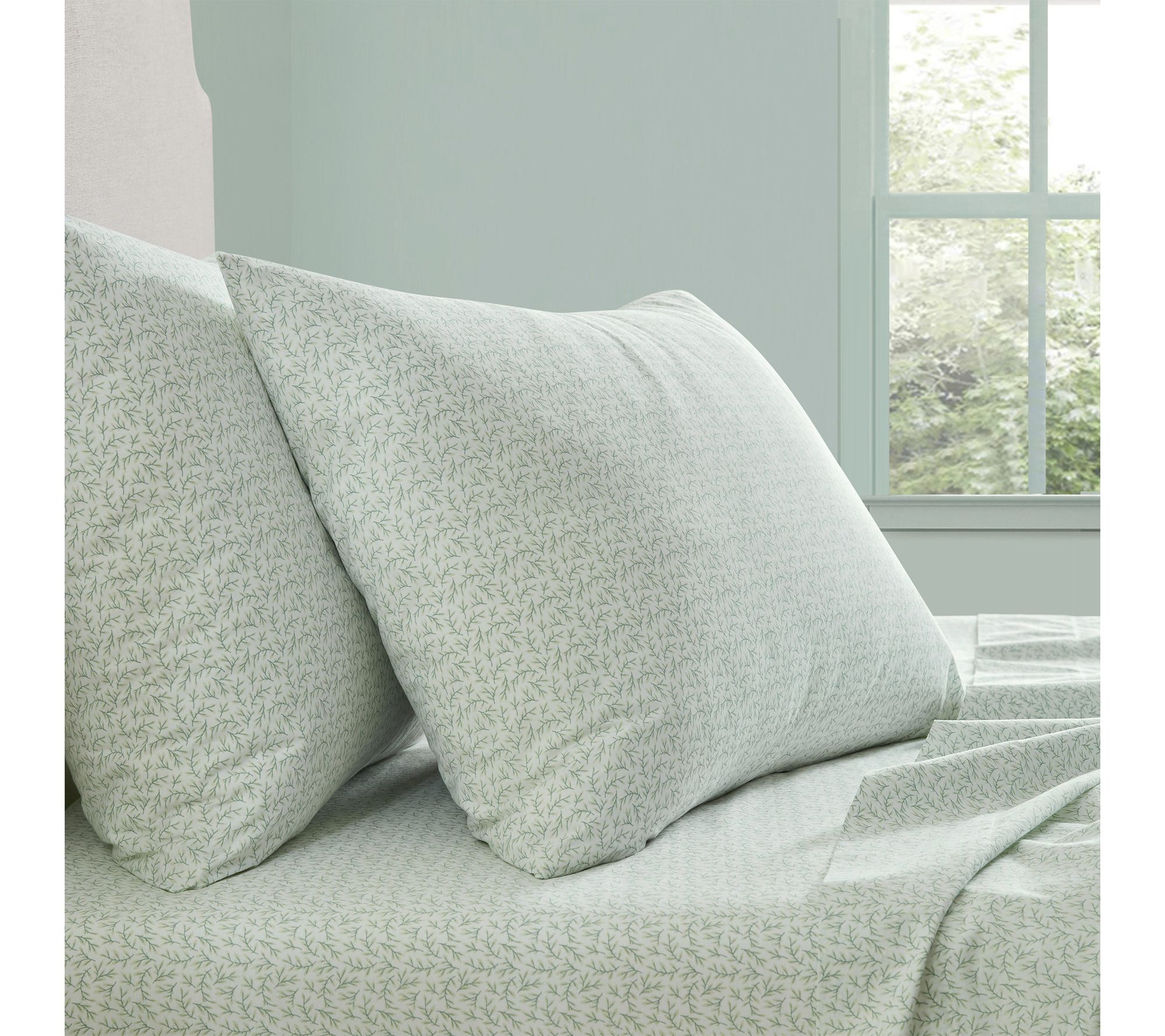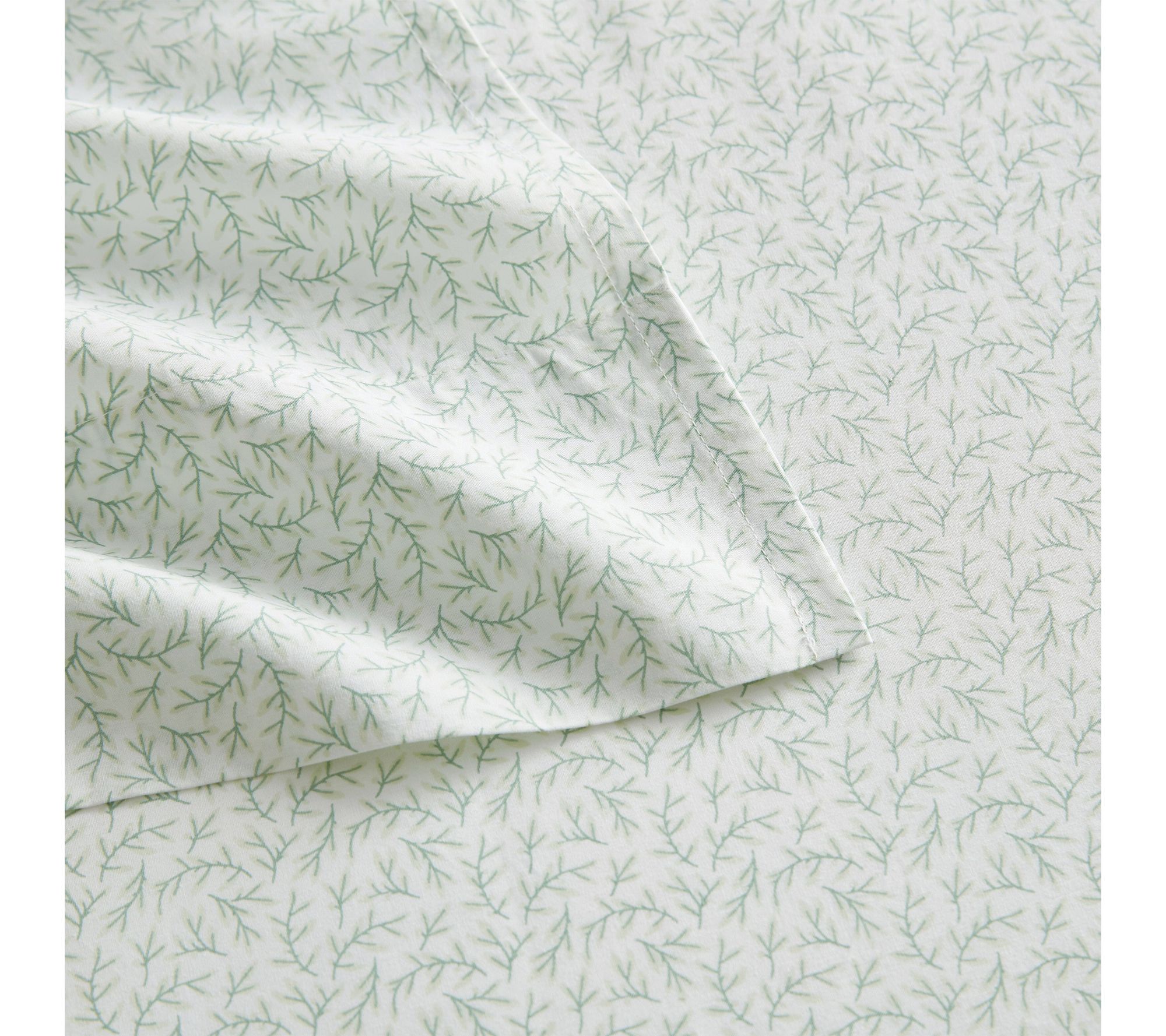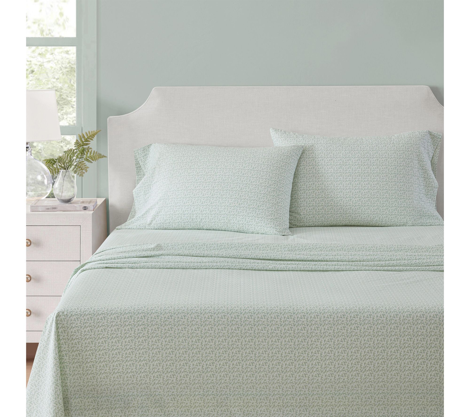 Add a touch of sophistication to your bedroom with this cotton sheet set adorned in a subtle leaf design. The gentle green and white palette creates a soothing atmosphere, while the soft 100% cotton weave offers comfort every night. Designed to blend seamlessly into both classic and contemporary spaces, it's a simple upgrade that helps refresh your favorite retreat. From Martha Stewart.