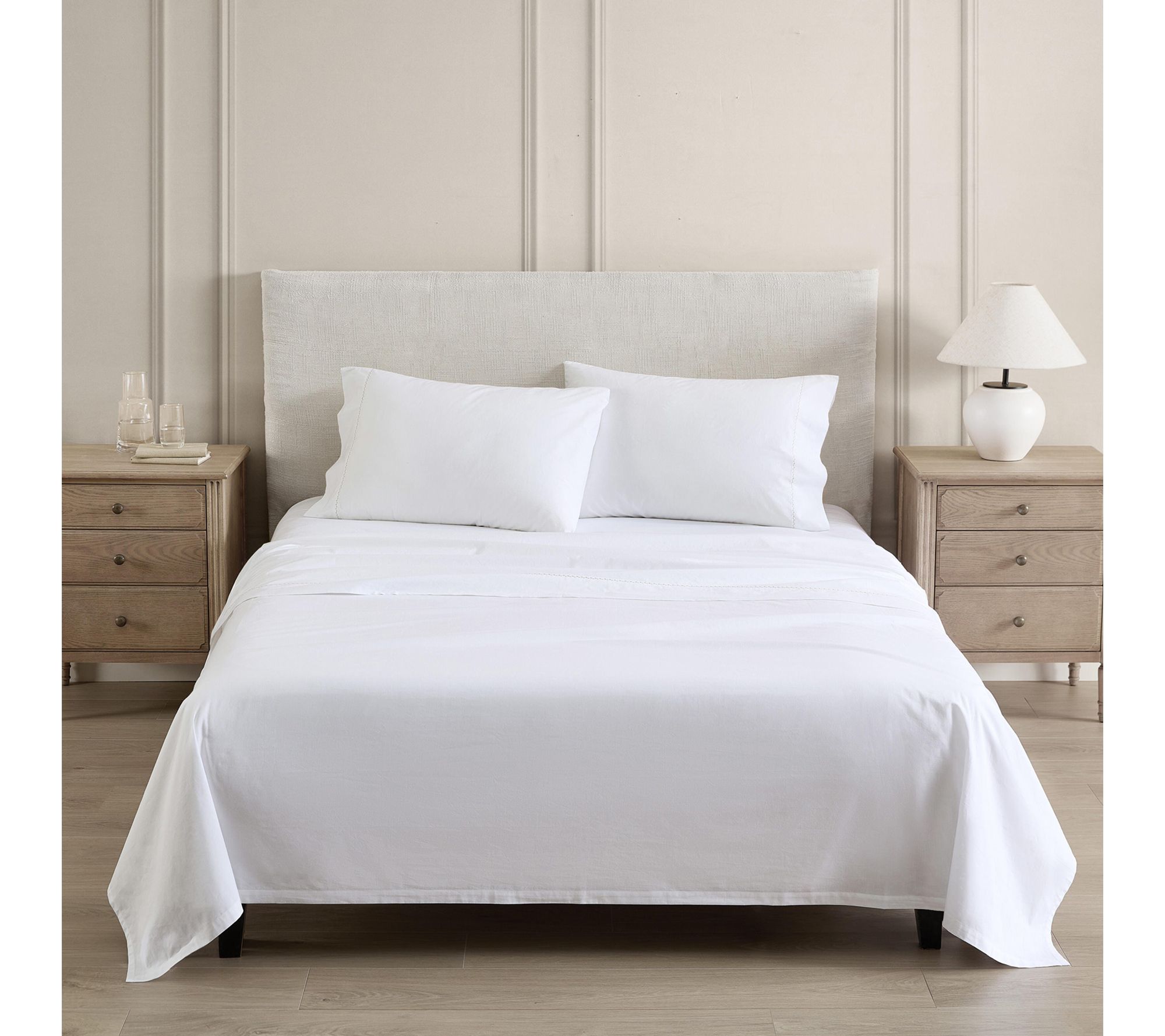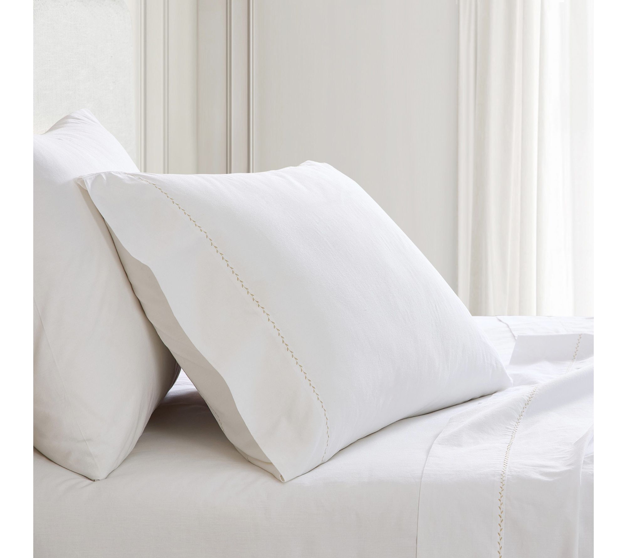 Flat sheet and pillowcases feature self hem with graceful 4-stitch detailing