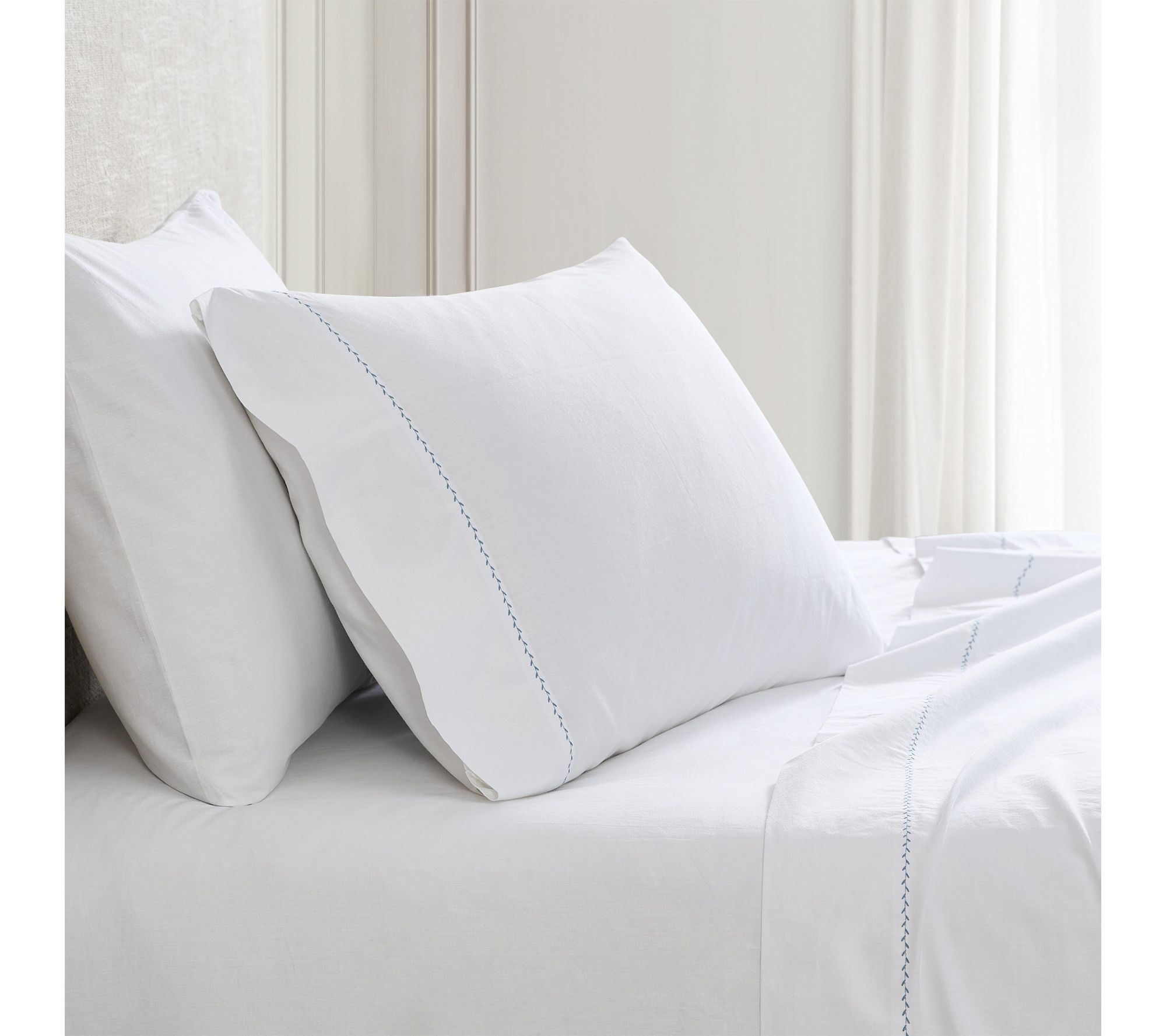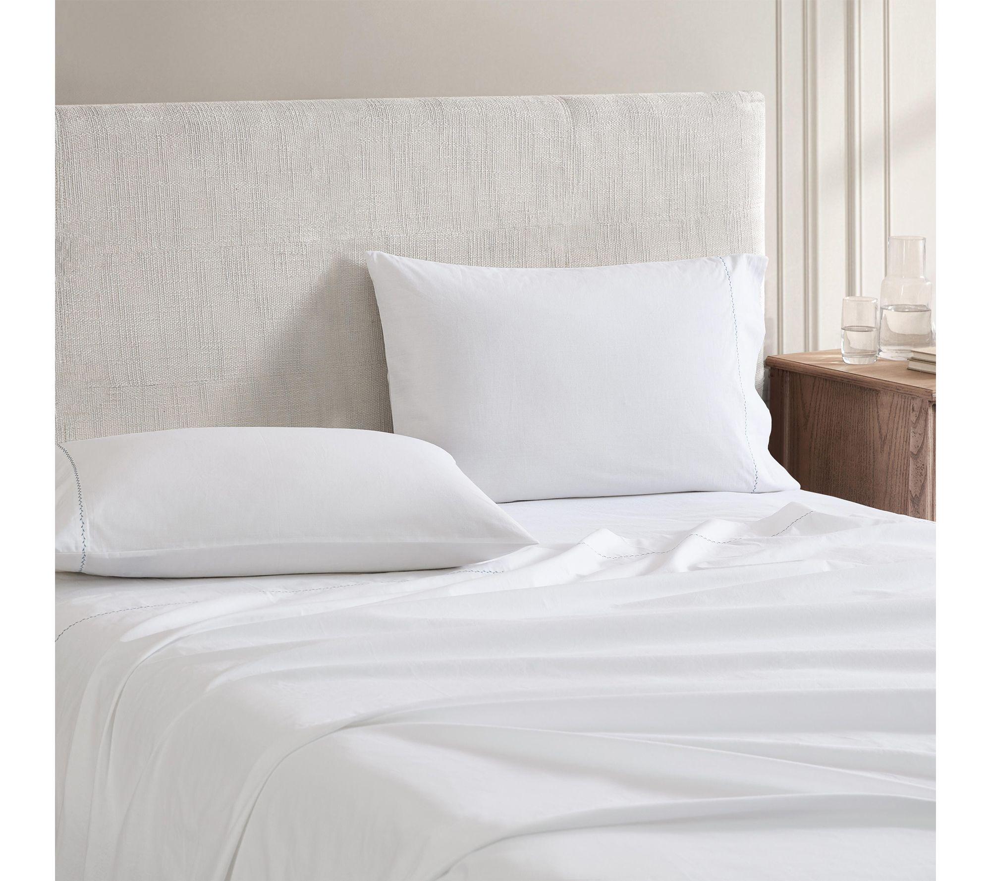 Soothing hues and a soft, crisp touch redefine your sanctuary with this queen sheet set from Martha Stewart. Imagine the gentle embrace of 100% cotton percale as you slip into bed, each detail -- like the graceful stitch and polished finish -- adding a layer of elegance to your nighttime routine. Thoughtfully designed for lasting quality and timeless appeal, these sheets bring everyday luxury to any bedroom retreat. From Martha Stewart.