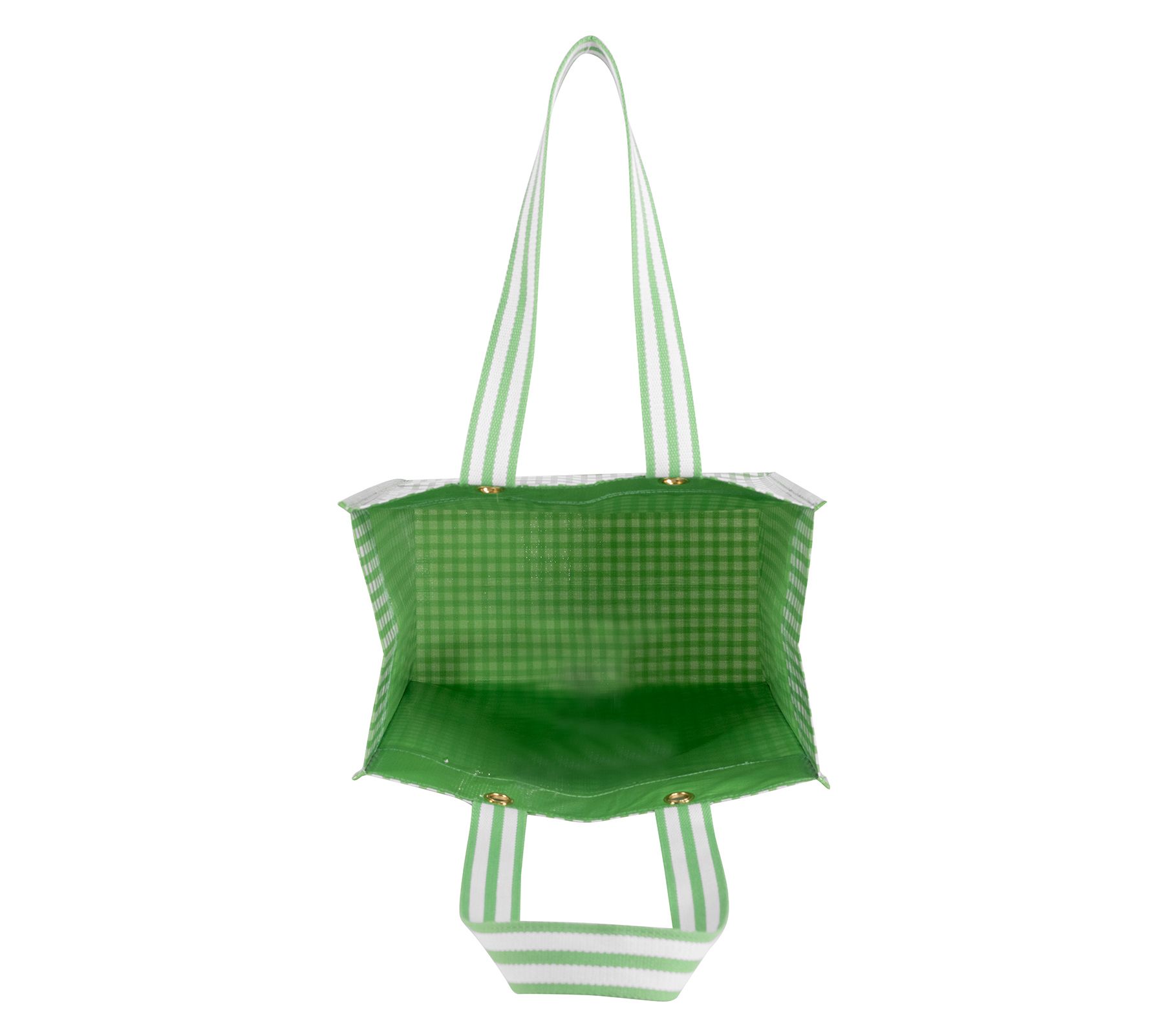 • No closure, double handles, goldtone grommets, green gingham print, reinforced nylon handles, flat base