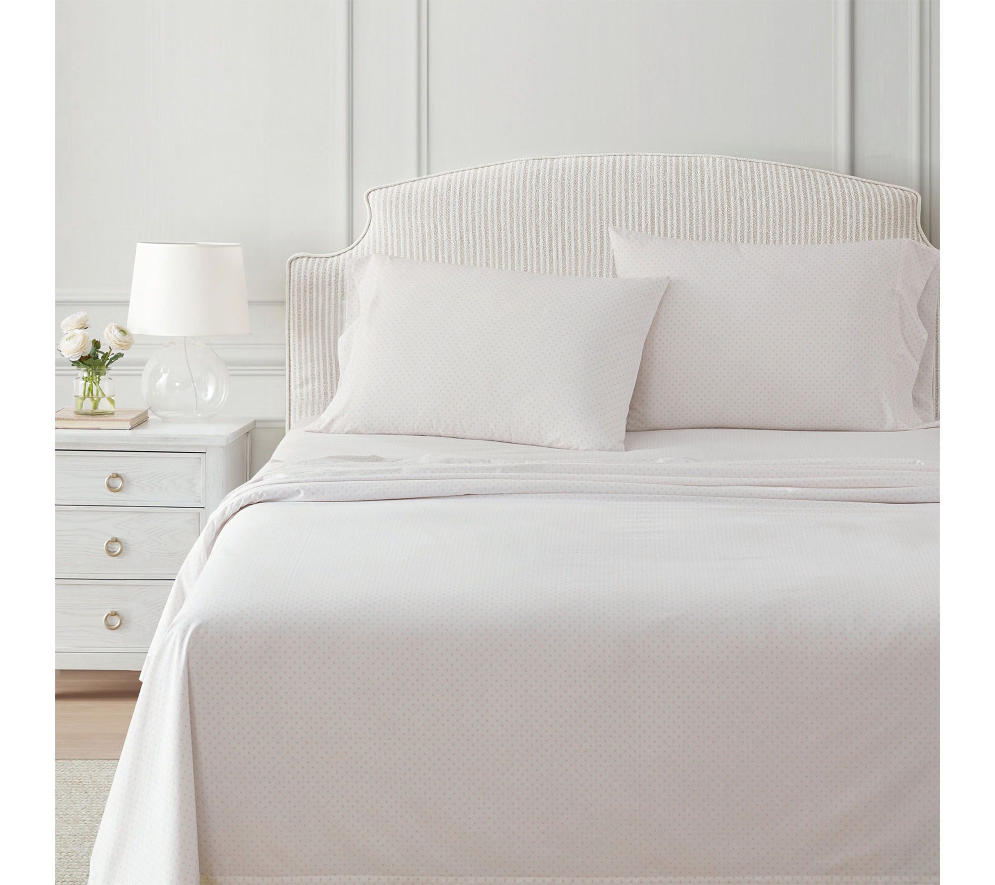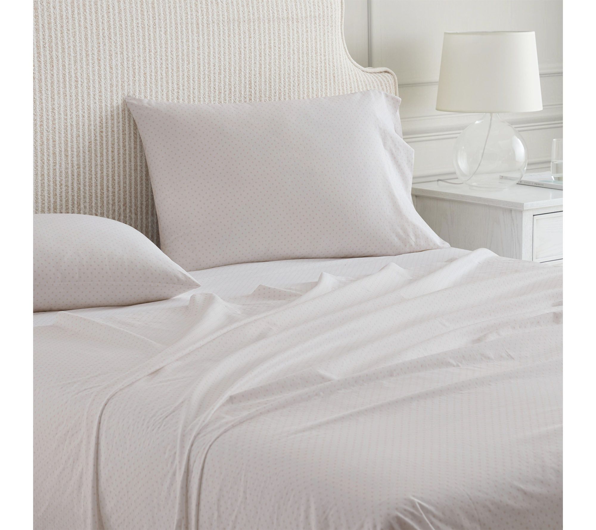 Unwind into the gentle touch of 100% cotton percale, decorated with pearl-peach polka dots that bring just the right pop of playful charm to your bedroom. These soft, crisp sheets offer refined comfort and timeless style -- perfect for everything from peaceful mornings to cozy movie nights. From Martha Stewart.