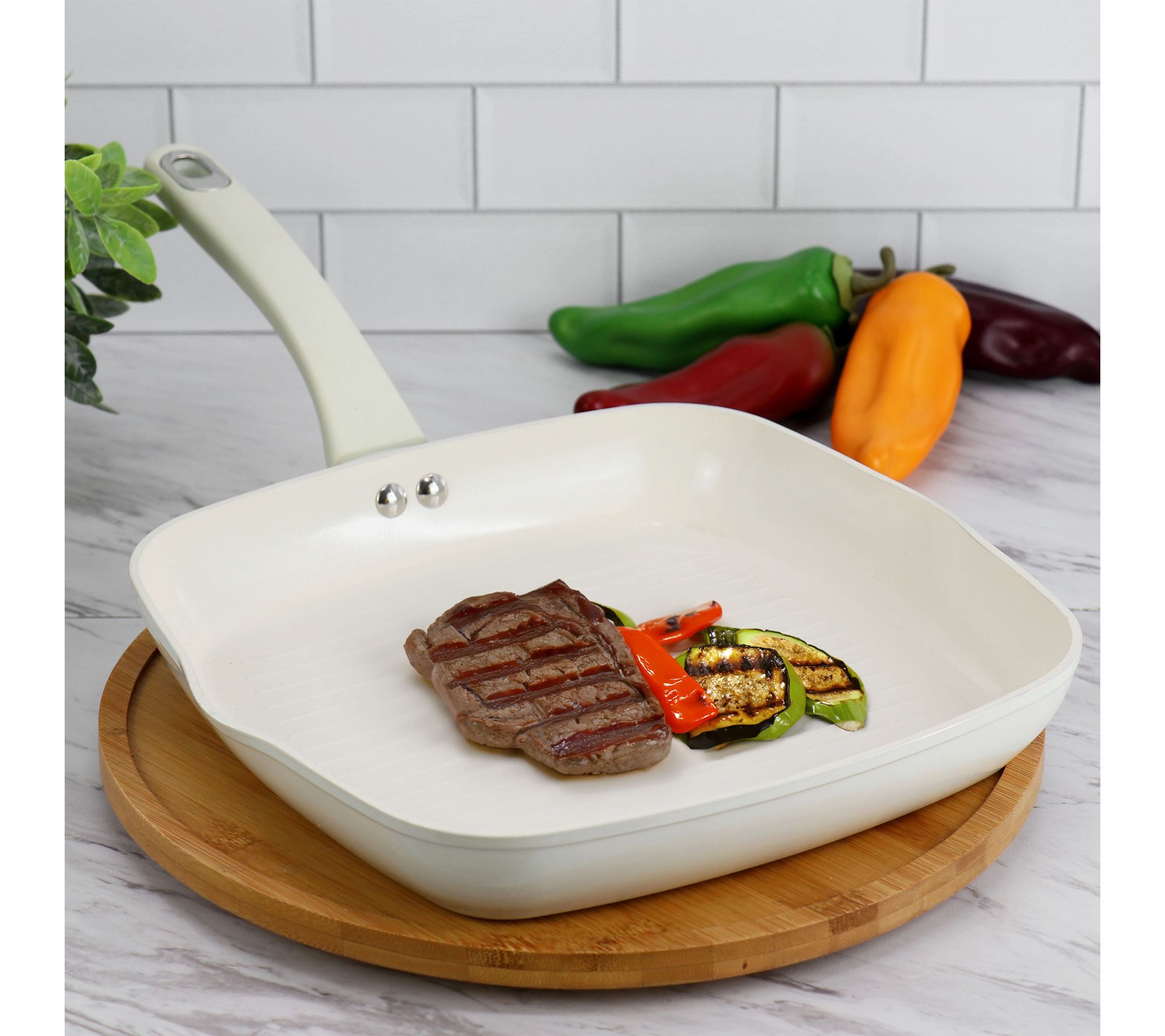 • Ridged surface creates grill marks on meats and vegetables