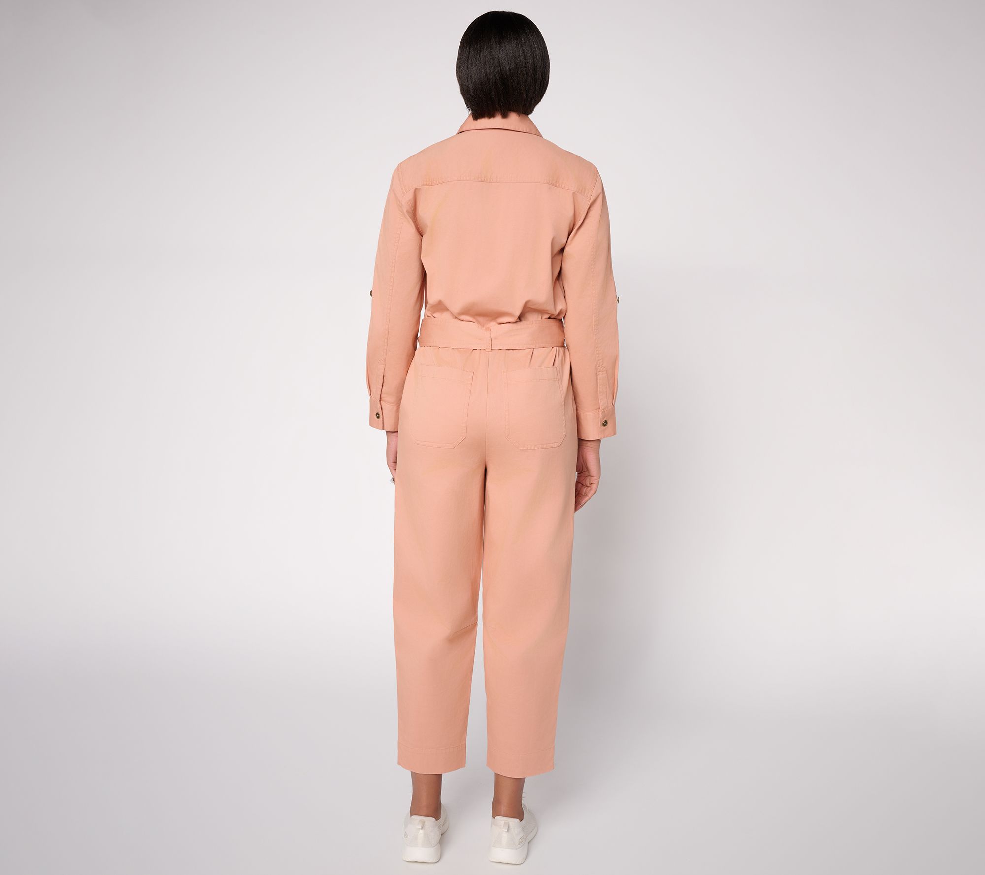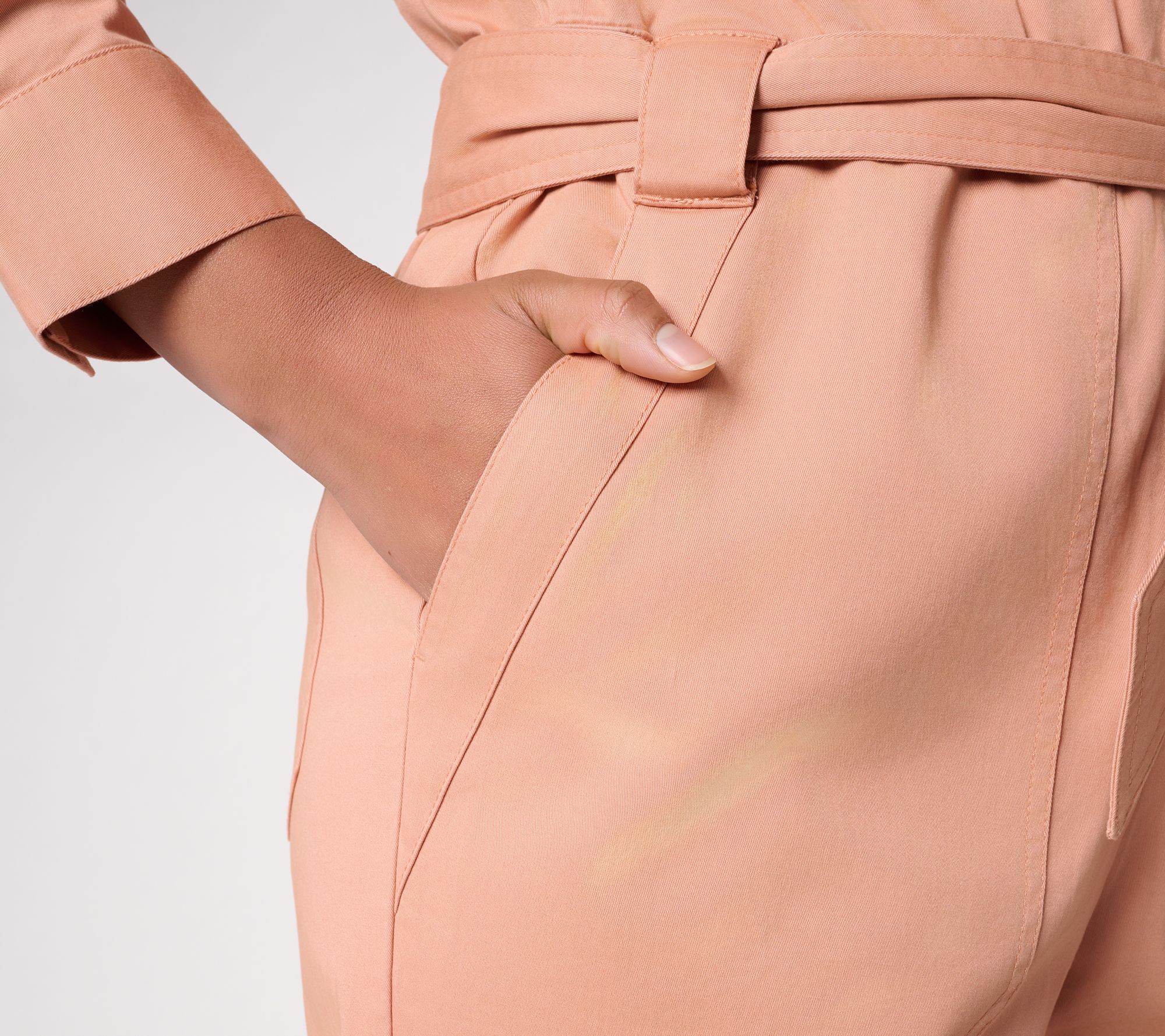 Features: one-piece jumpsuit, long sleeves, collar, button-front placket, waist seam, self-tie belt, chest pocket, side pockets