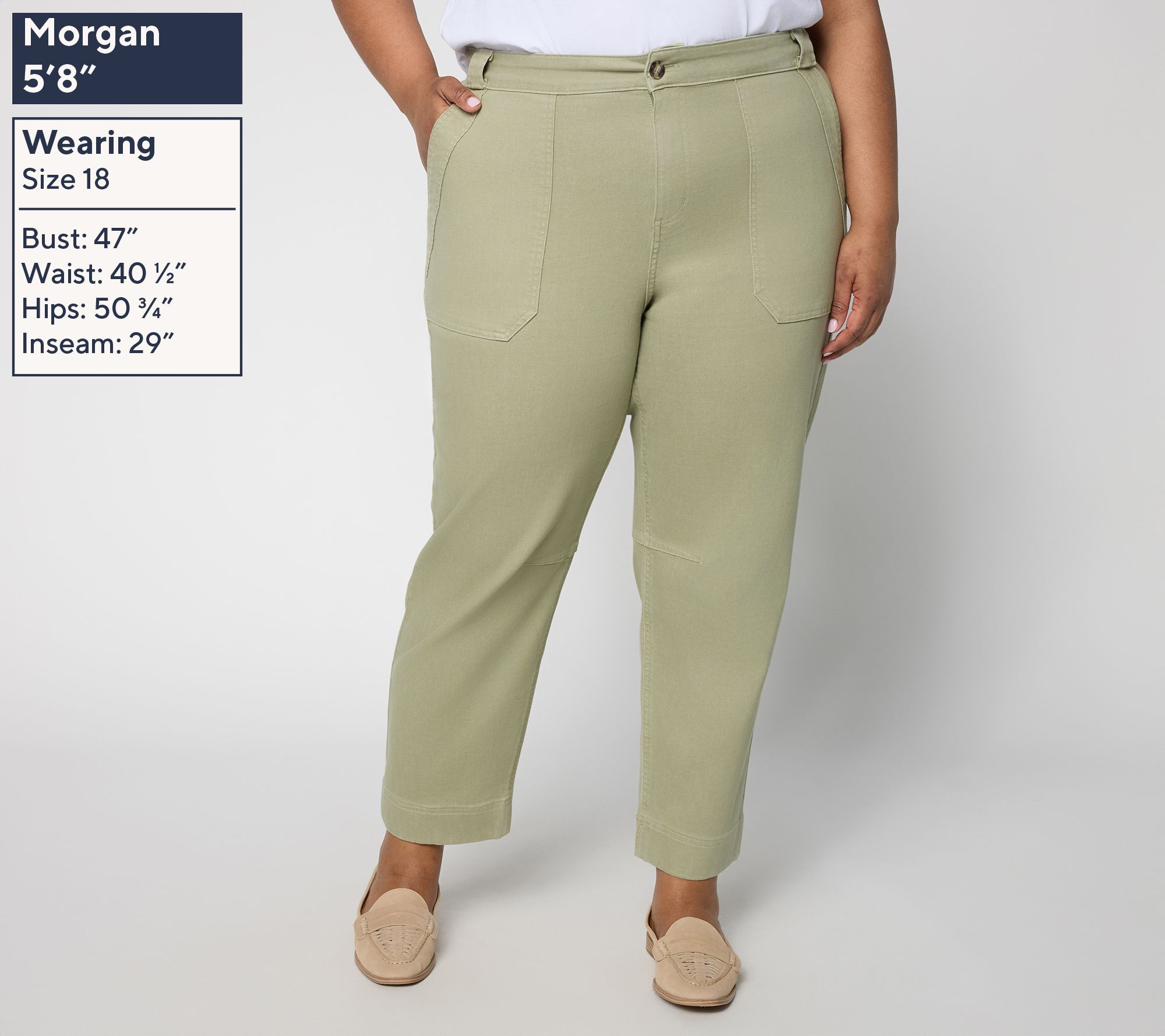 Features: ankle length, utility styling, front patch pockets with wide angled banding, bartacks at pockets, turnback hems
