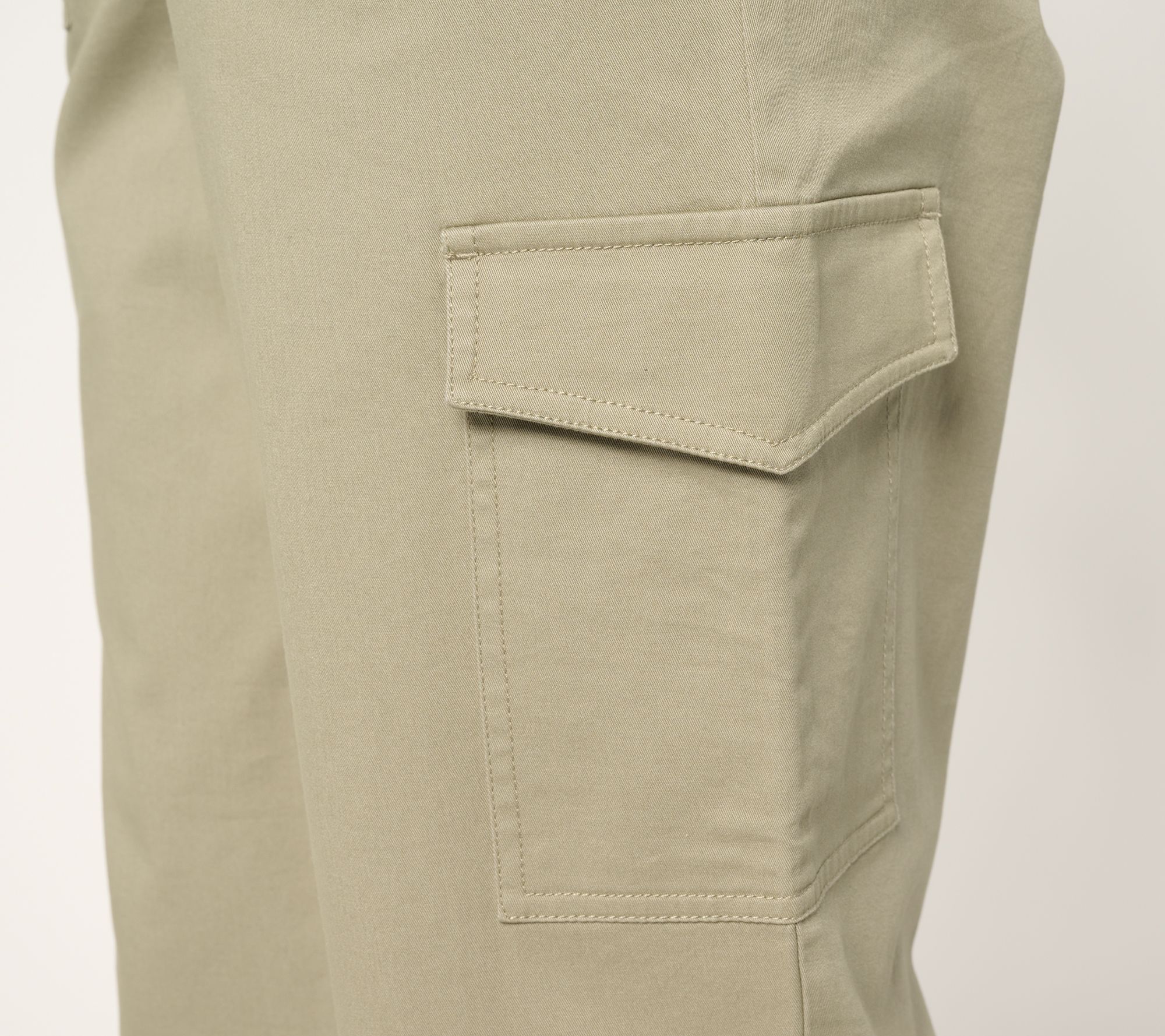 Features: pull-on style, faux fly with functional button, flat waistband, side pockets, cargo pockets, back pockets, full length