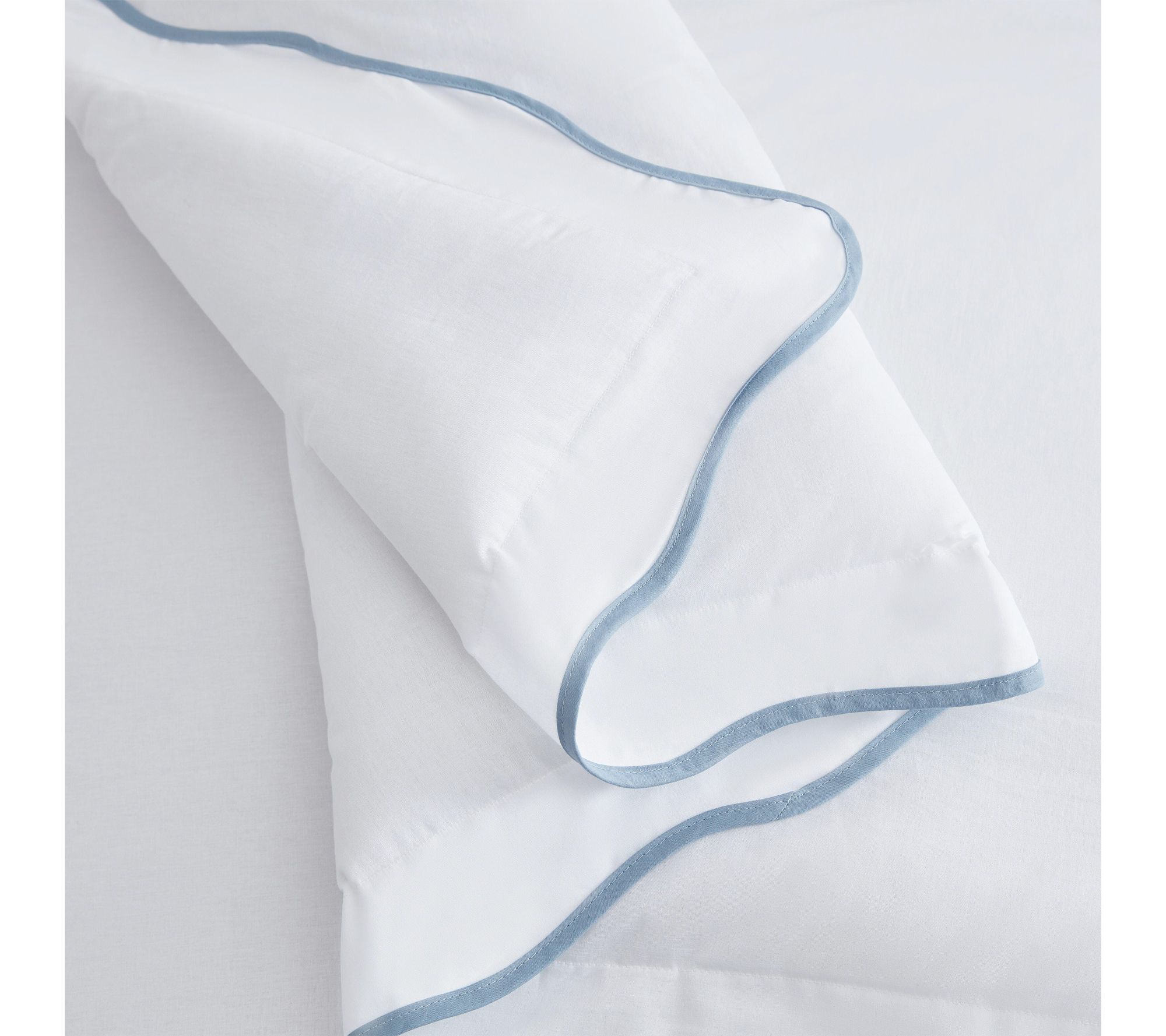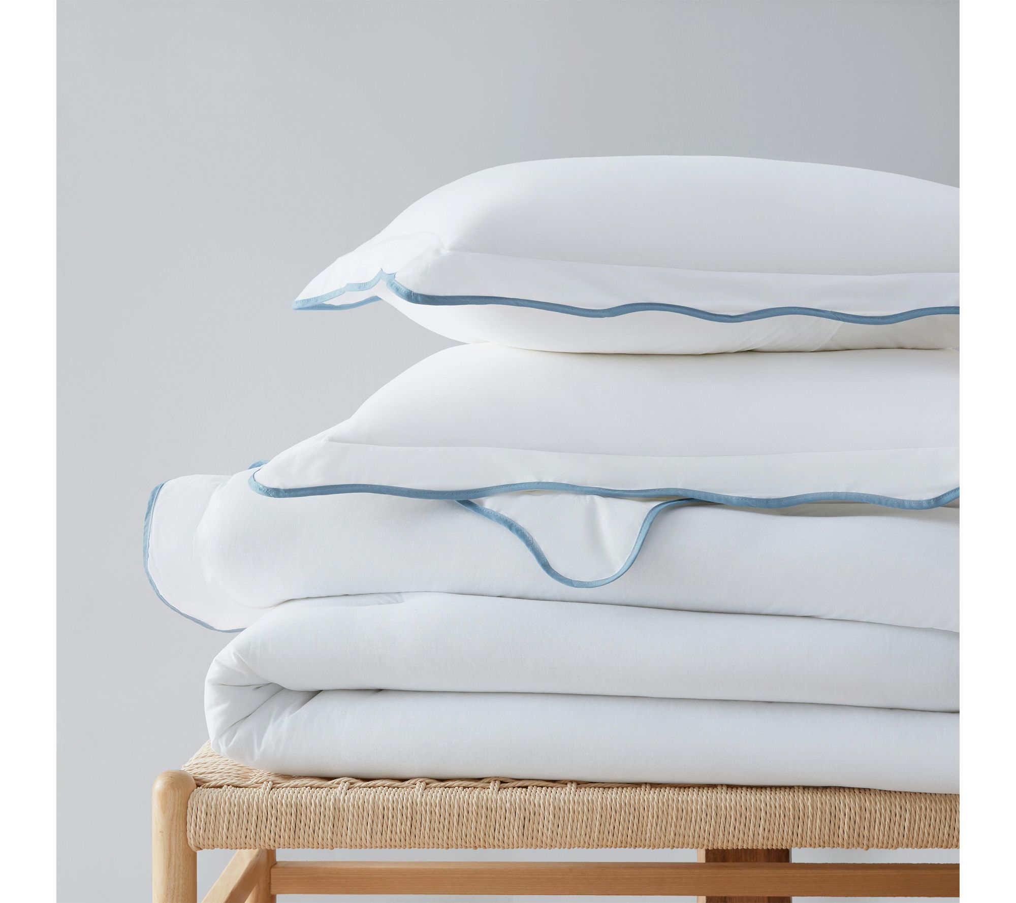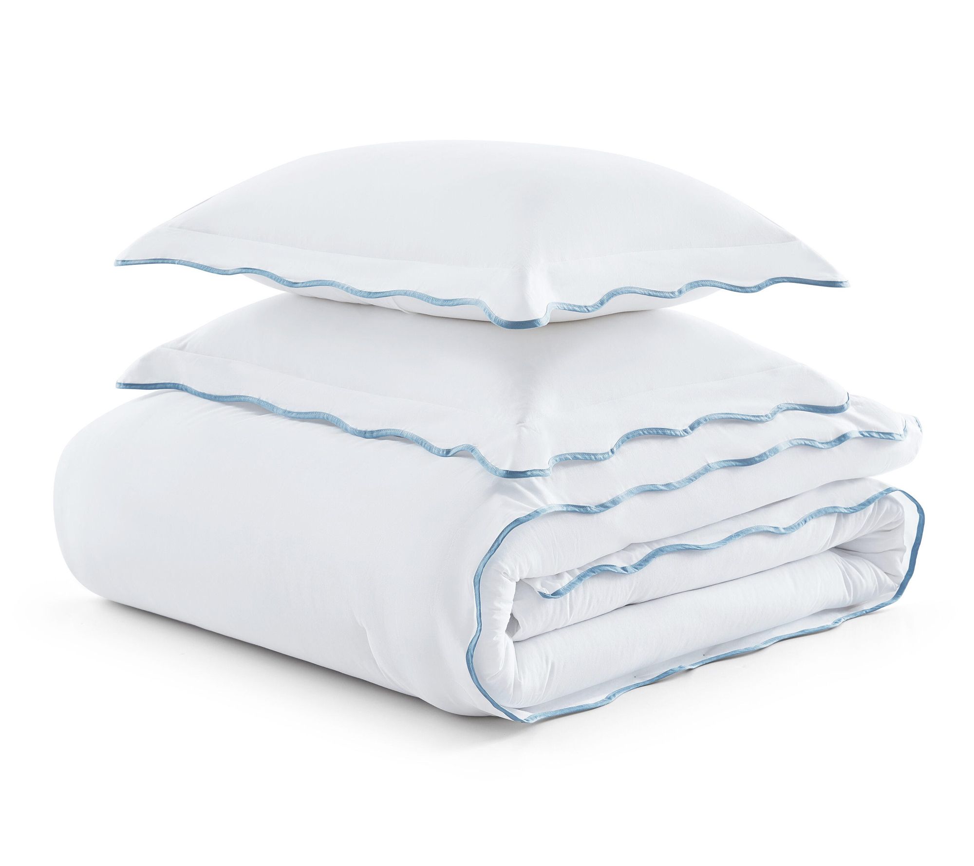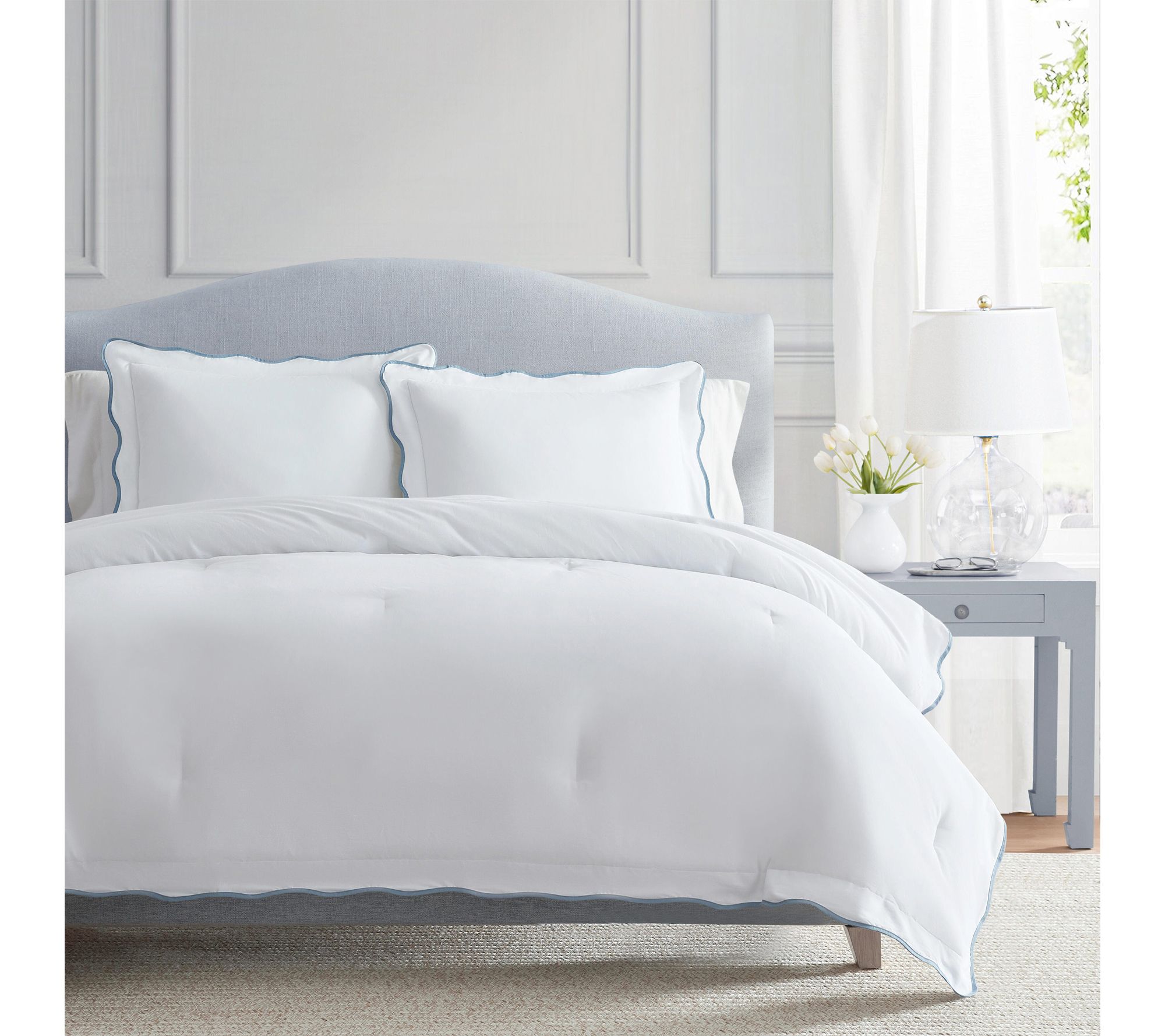 A scalloped edge in soft blue instantly uplifts your bedroom, creating a soothing oasis with this comforter set. Crafted from 100% cotton for a gentle feel, the plush quilting offers inviting warmth in every season. Whether refreshing the master suite or welcoming guests, you'll love the tailored finish and timeless look. From Martha Stewart.
