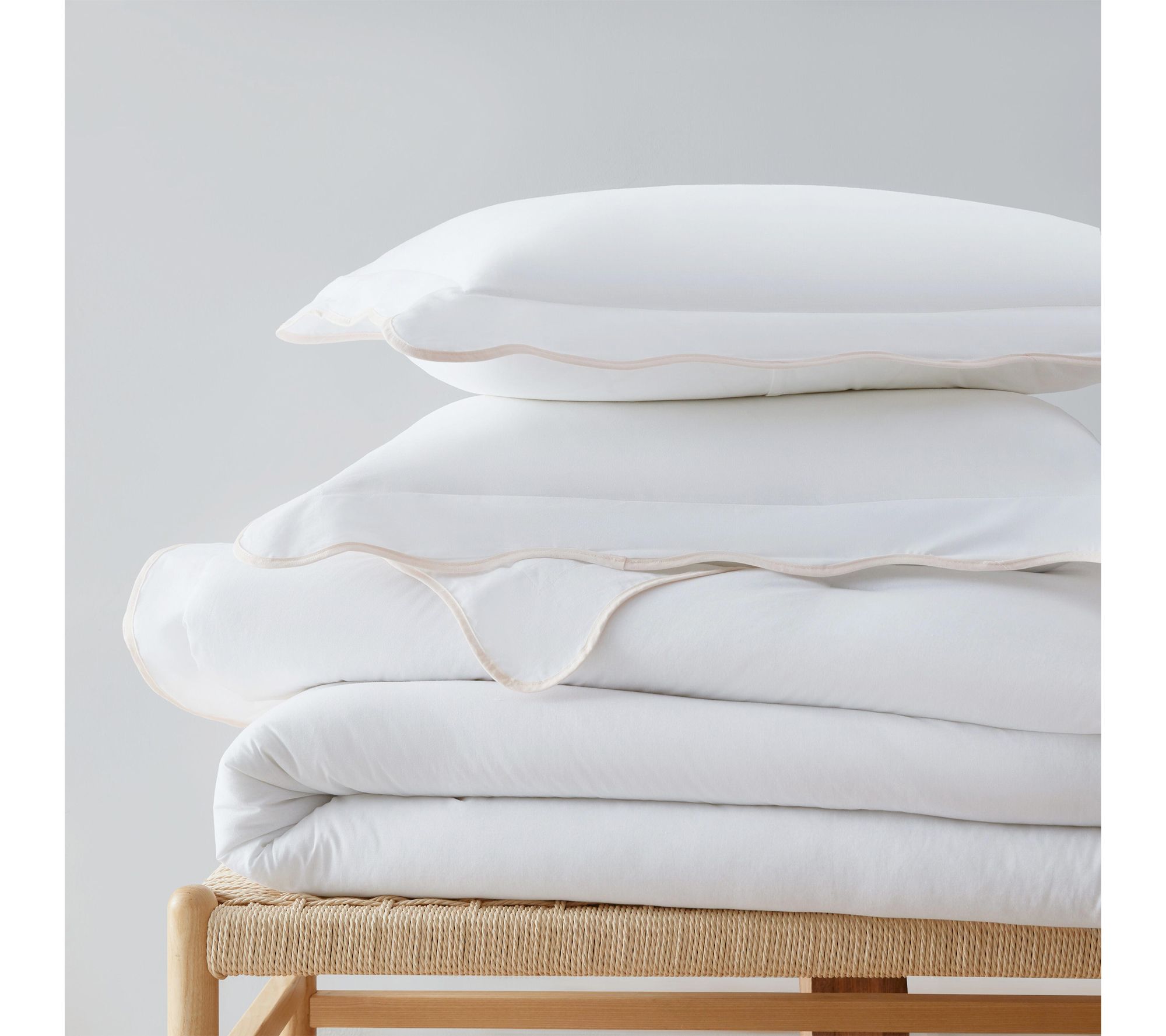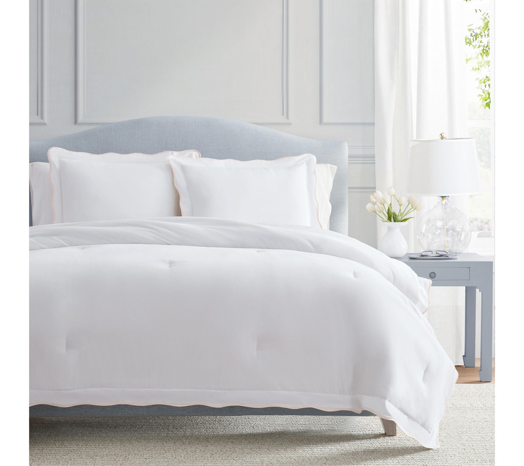 Curl up in the inviting softness of this comforter set, where classic scalloped trim in blush pink highlights crisp cotton fabric for an elegant bedroom refresh. From guest rooms to master suites, the plush, quilted comforter and matching shams deliver easy all-season warmth and a tailored finish for a cozy, welcoming retreat. From Martha Stewart.