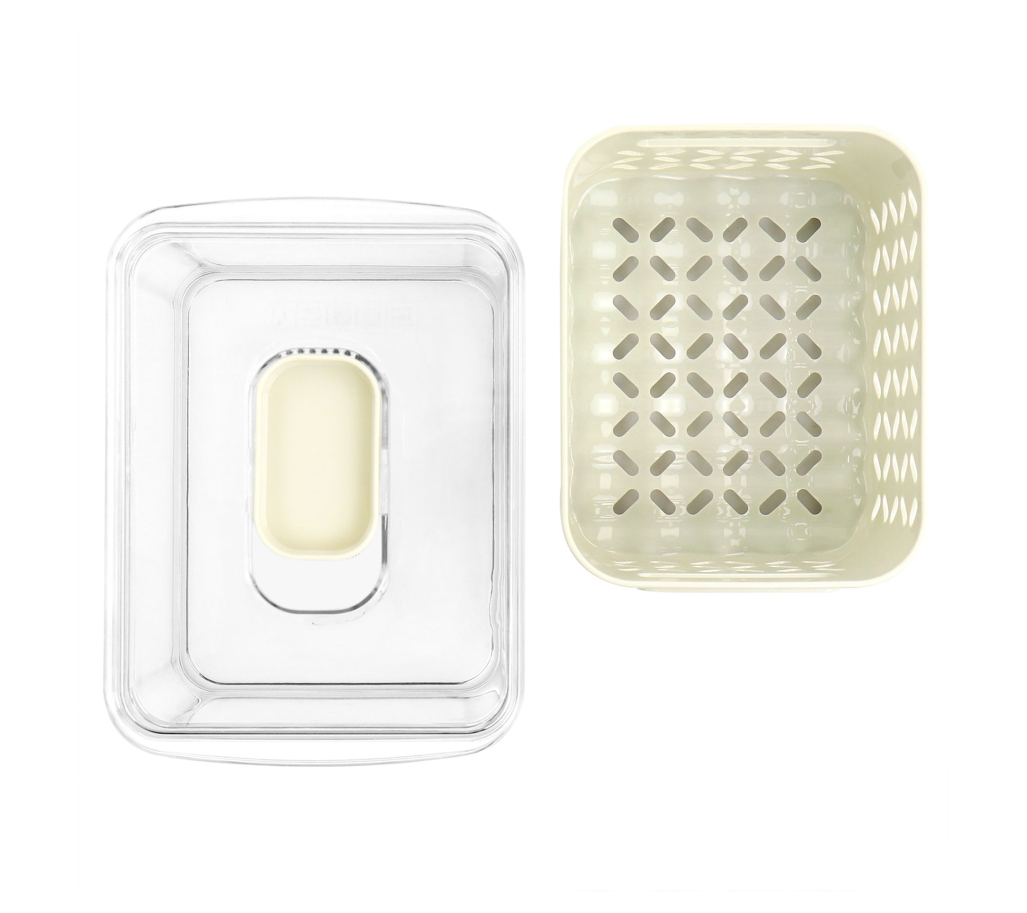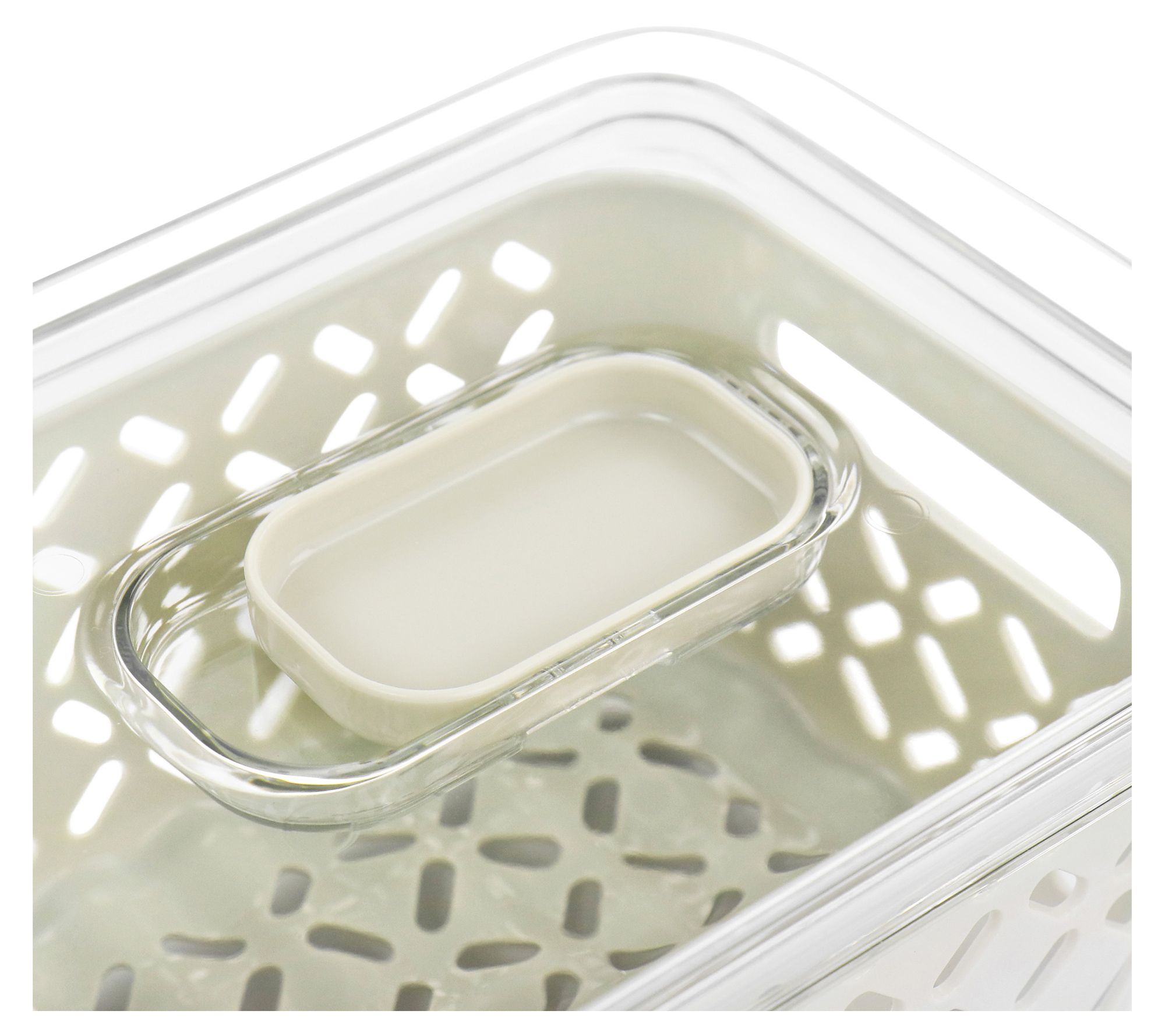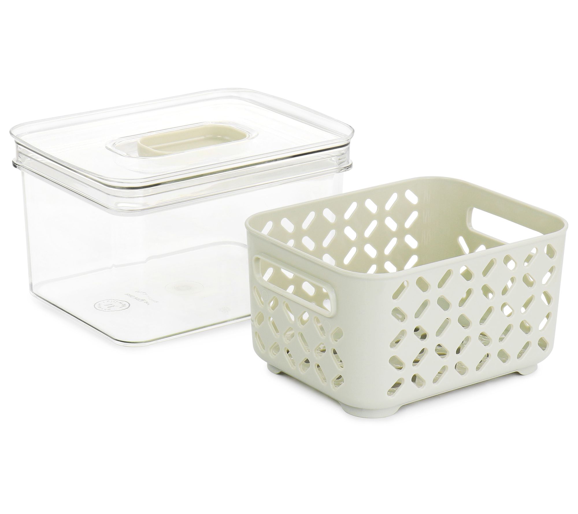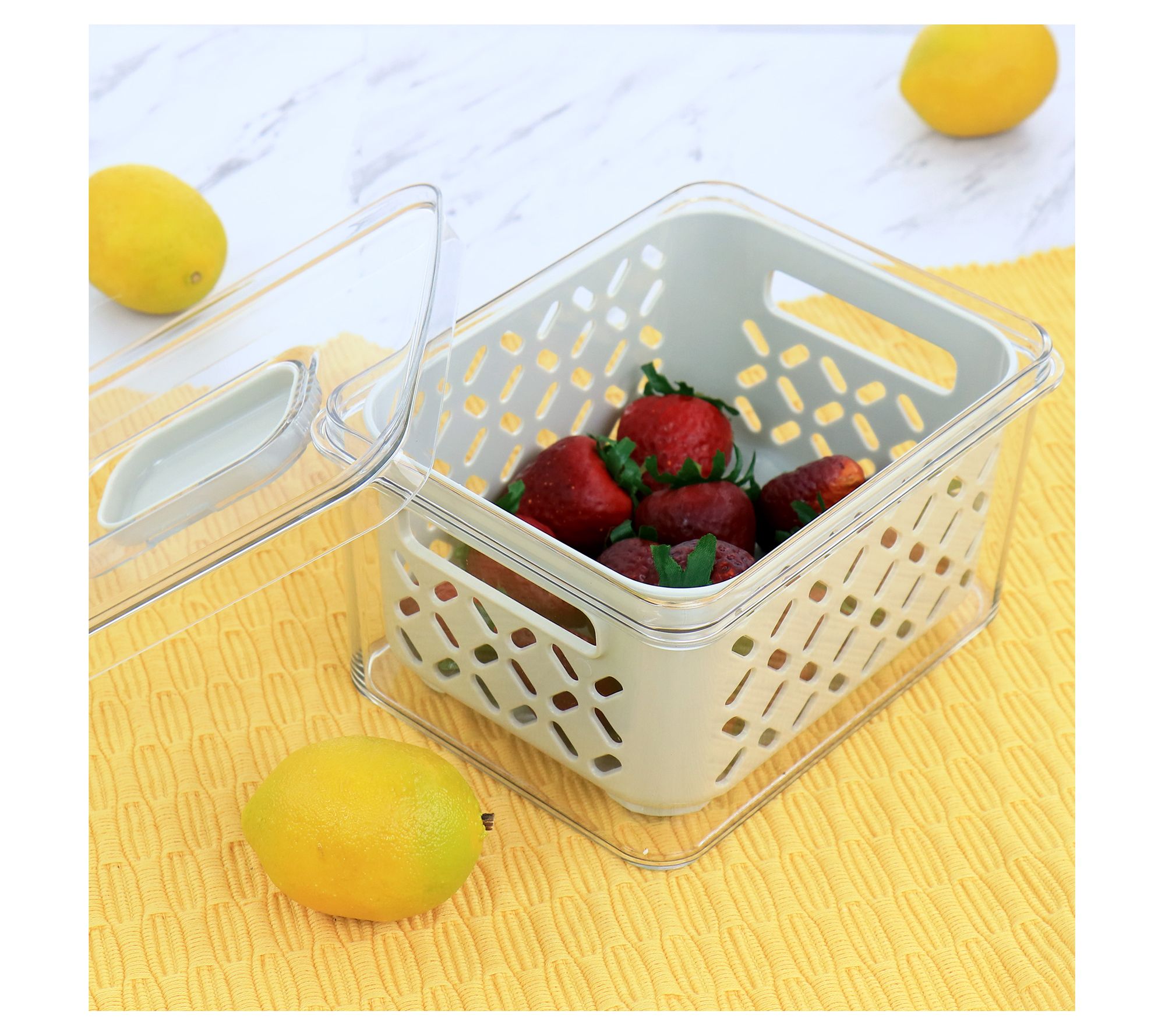 Enjoy delicious fresh fruits and vegetables when you keep them in this fresh keeper set! Smart design keeps food in the removable basket colander with room to drain into the surrounding container. A vented lid slider keeps air flowing while stackable storage keeps your fridge clutter-free. From Martha Stewart.