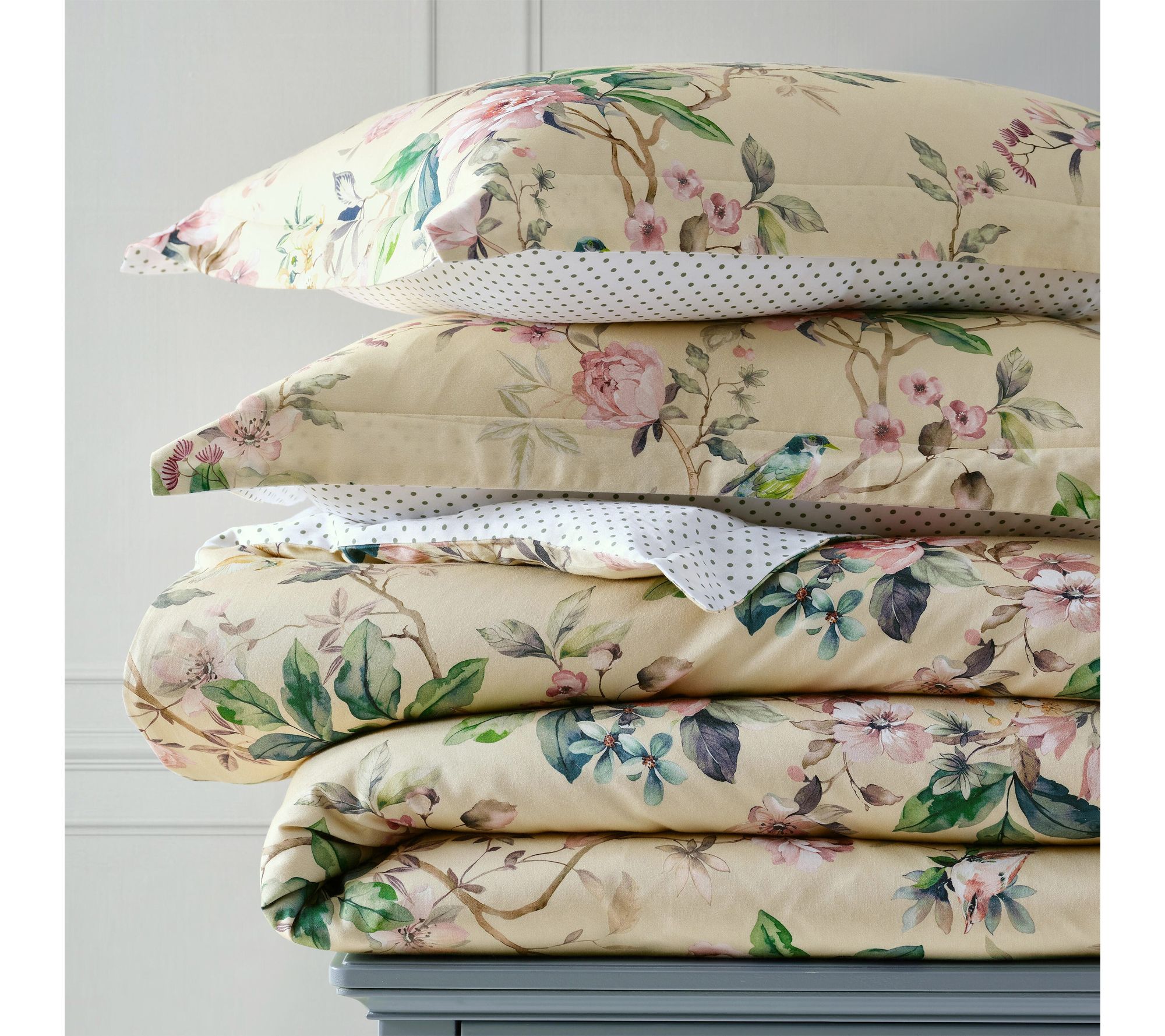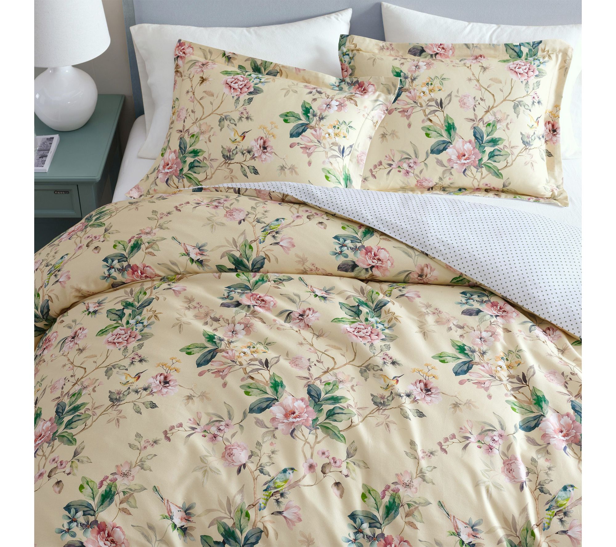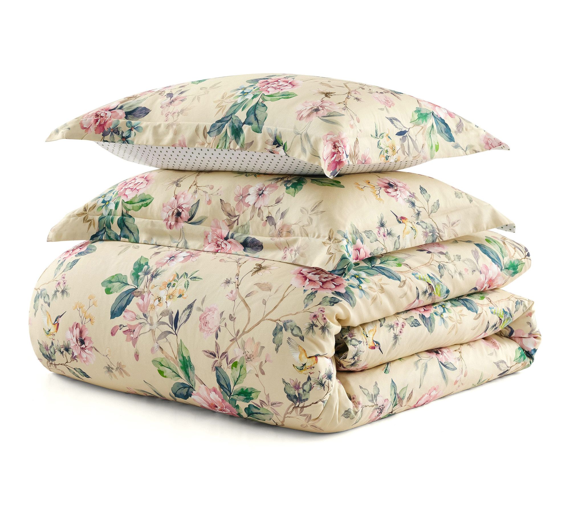 Awaken your bedroom retreat with the enchantment of a floral comforter set -- where delicate songbirds and blossoms dance across smooth, cotton sateen. Soft hues of pink, blue, and green on a creamy backdrop create a tranquil haven, while a reversible polka dot pattern lets you refresh your style anytime. From Martha Stewart.