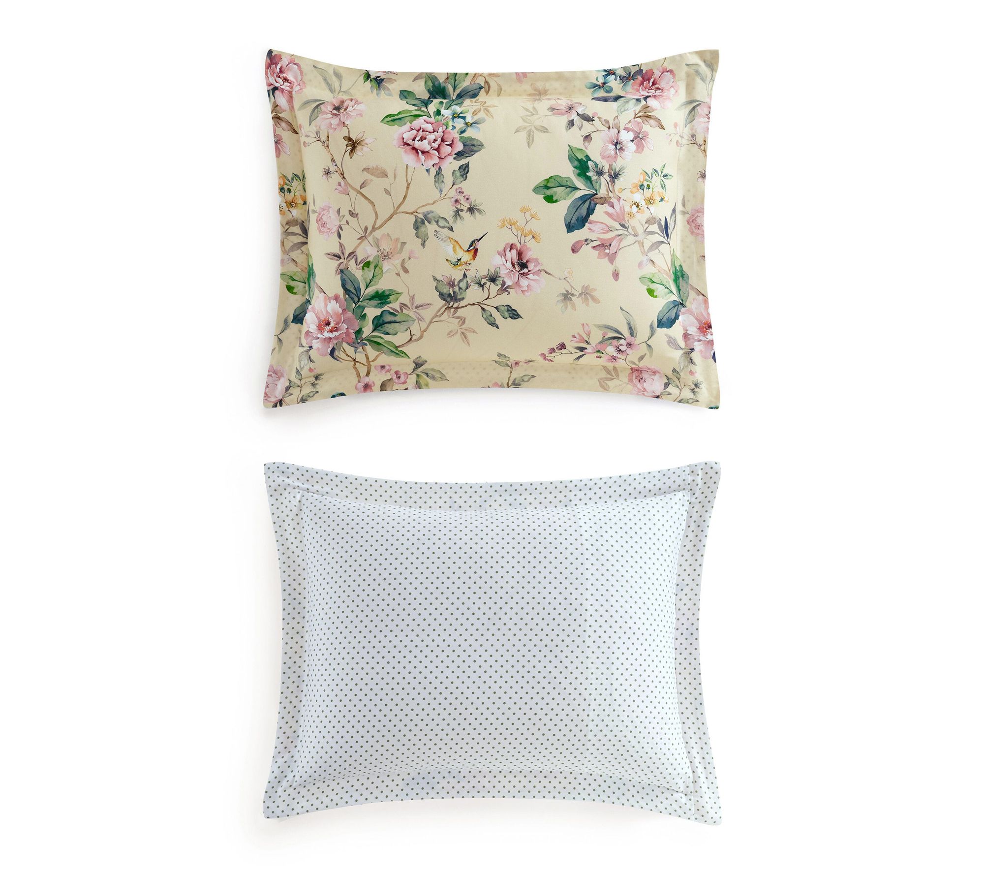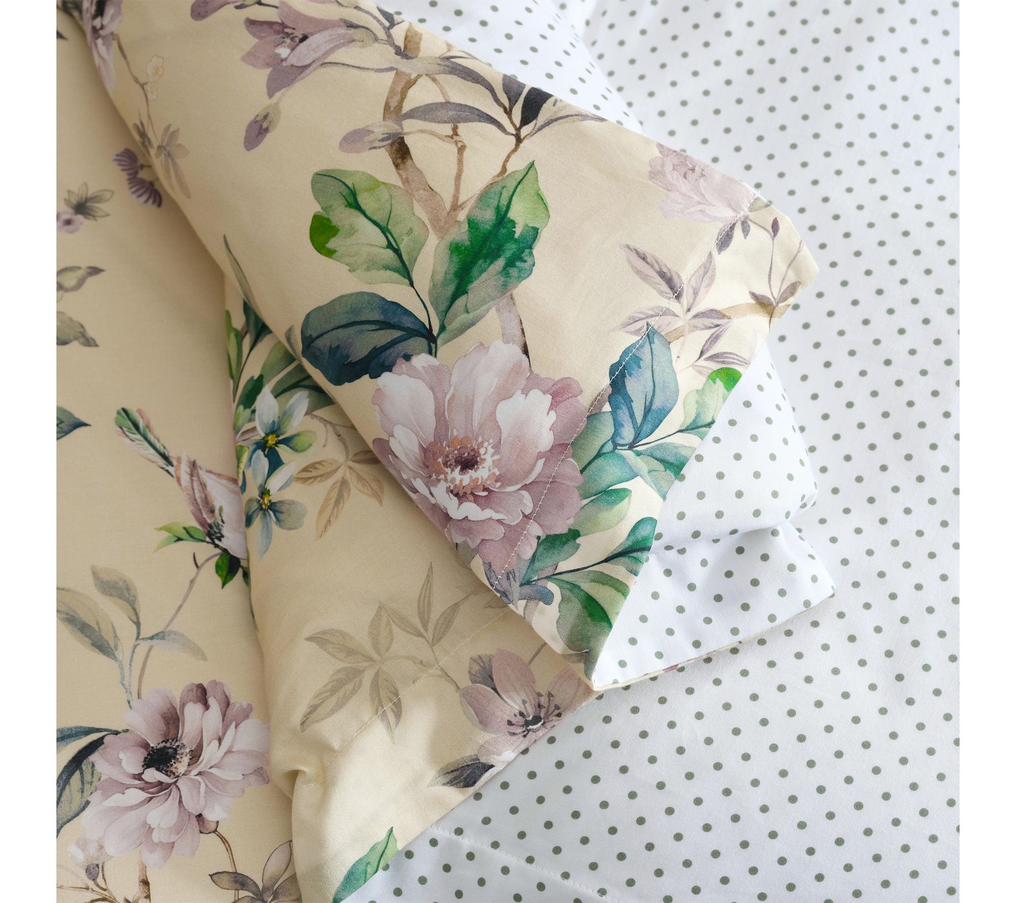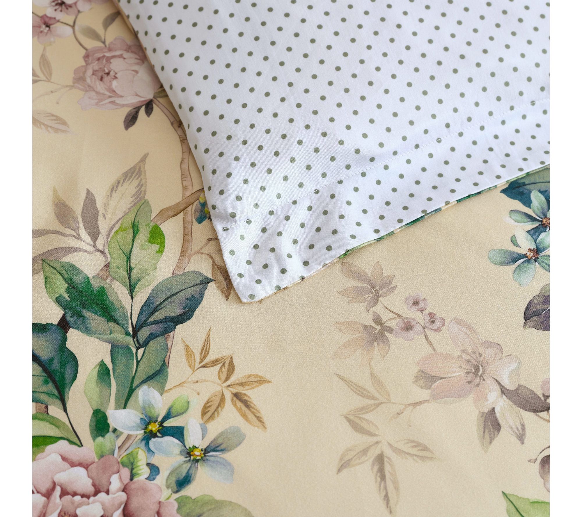 Awaken your bedroom retreat with the enchantment of a floral comforter set -- where delicate songbirds and blossoms dance across smooth, cotton sateen. Soft hues of pink, blue, and green on a creamy backdrop create a tranquil haven, while a reversible polka dot pattern lets you refresh your style anytime. From Martha Stewart.