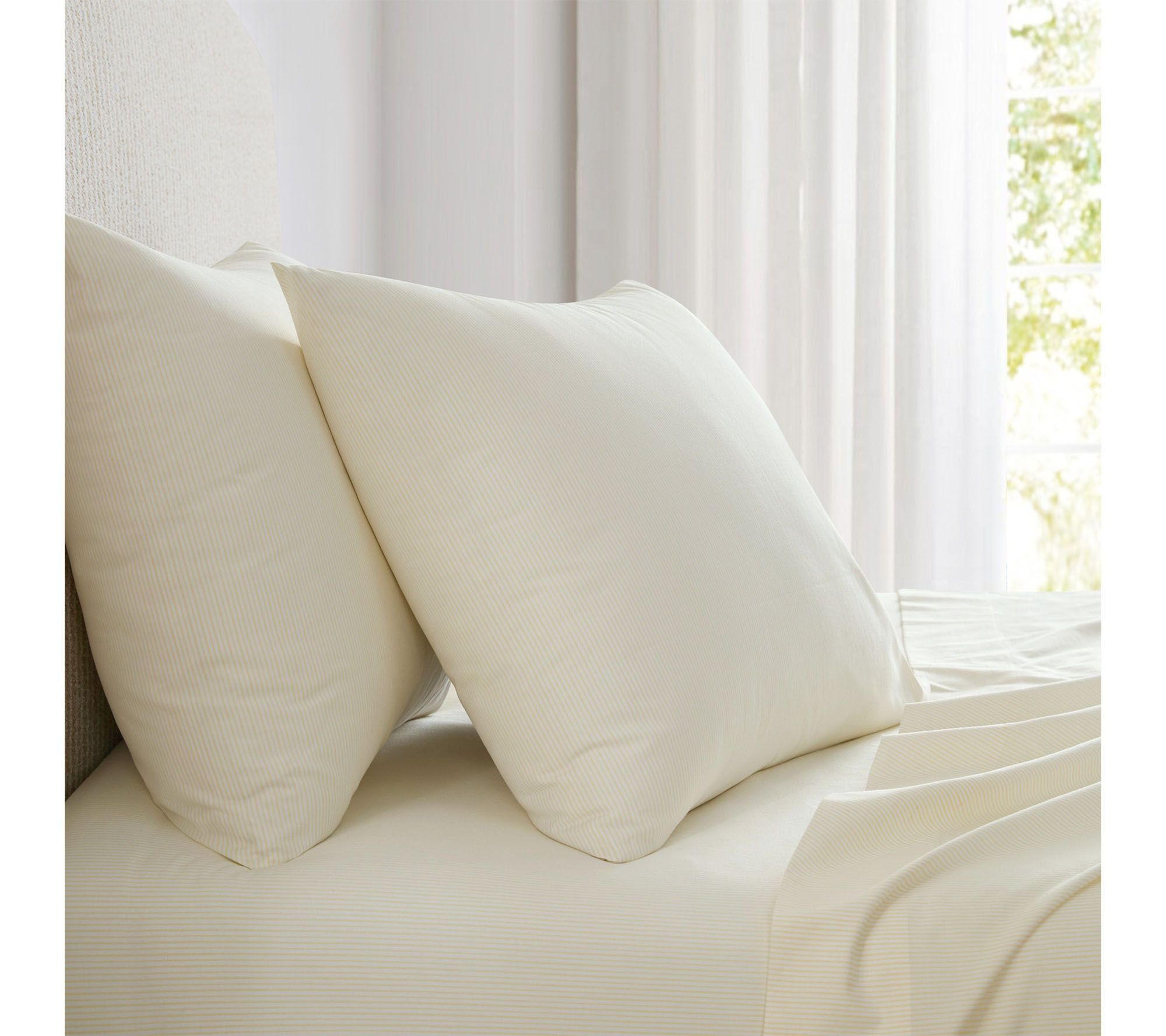 Soft yellow stripes on crisp white bring an inviting touch to your bedroom, blending style with everyday luxury. Crafted from 100% cotton percale for a breathable and cool night's rest, this full sheet set boasts thoughtful details like a polished finish, deep pockets for a secure fit, and a blend of farmhouse charm with a modern touch. From Martha Stewart.