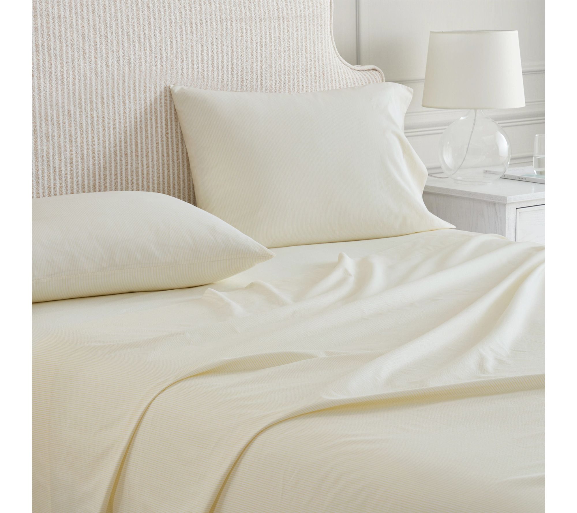 Liven up mornings with the cool, crisp feel of these 100% cotton sheets -- classic yellow stripes add timeless charm to your retreat, whether you're refreshing a guest room or brightening your own space. Thoughtfully designed with elasticized edges and a deep pocket for a secure fit, this sheet set brings a polished finish and effortless comfort to your bedtime ritual. From Martha Stewart.