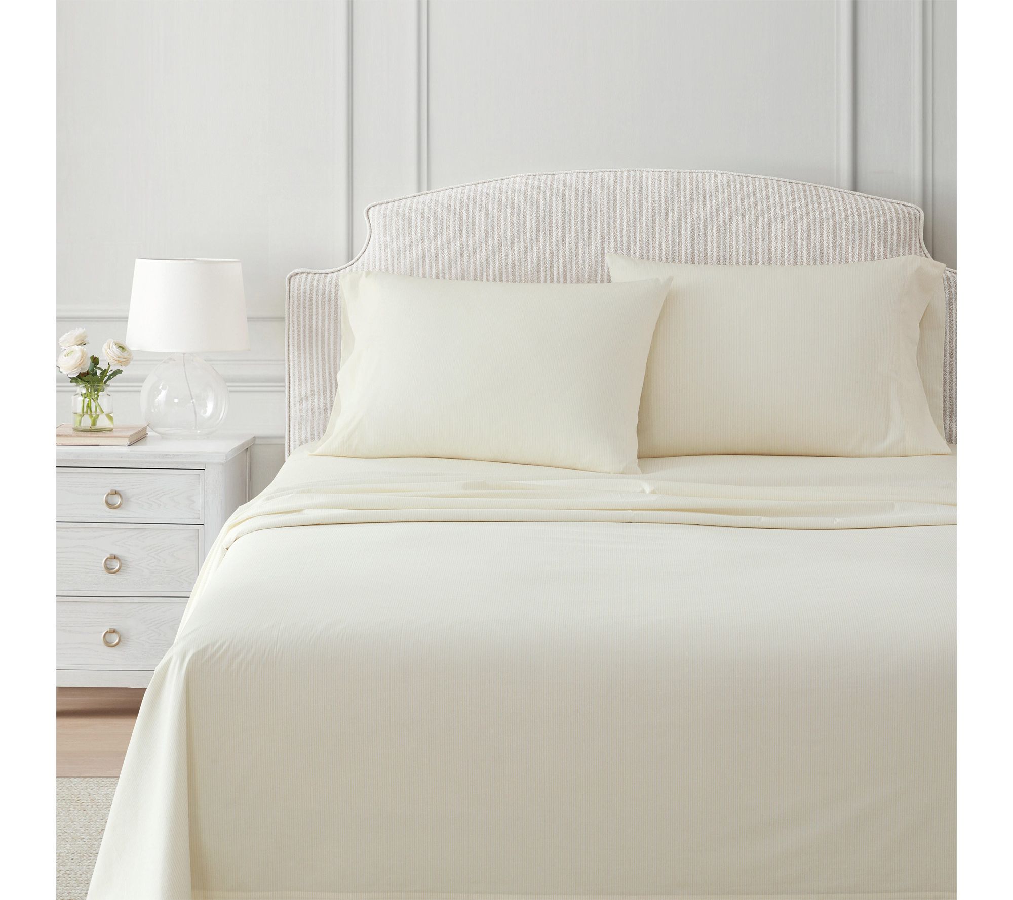 Flat sheet and pillowcase feature a clean self hem with graceful four-stitch detail