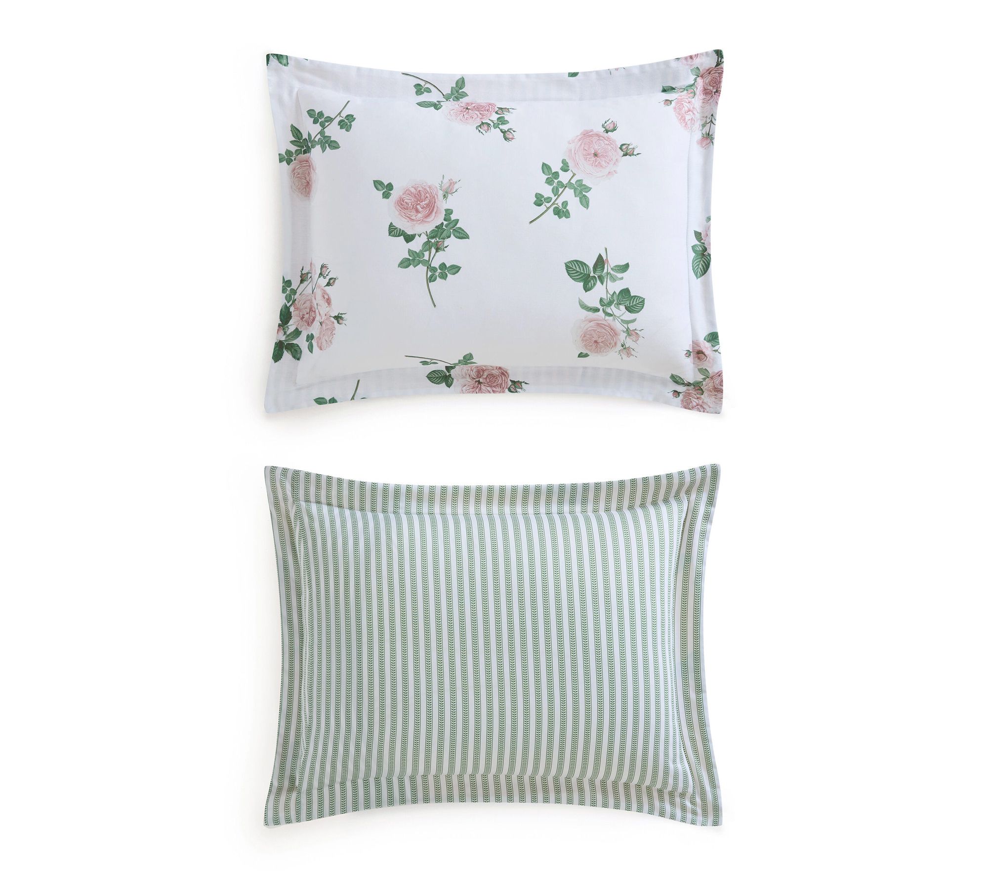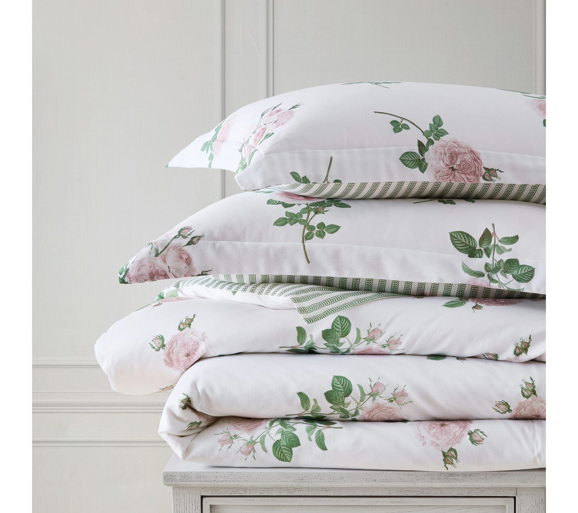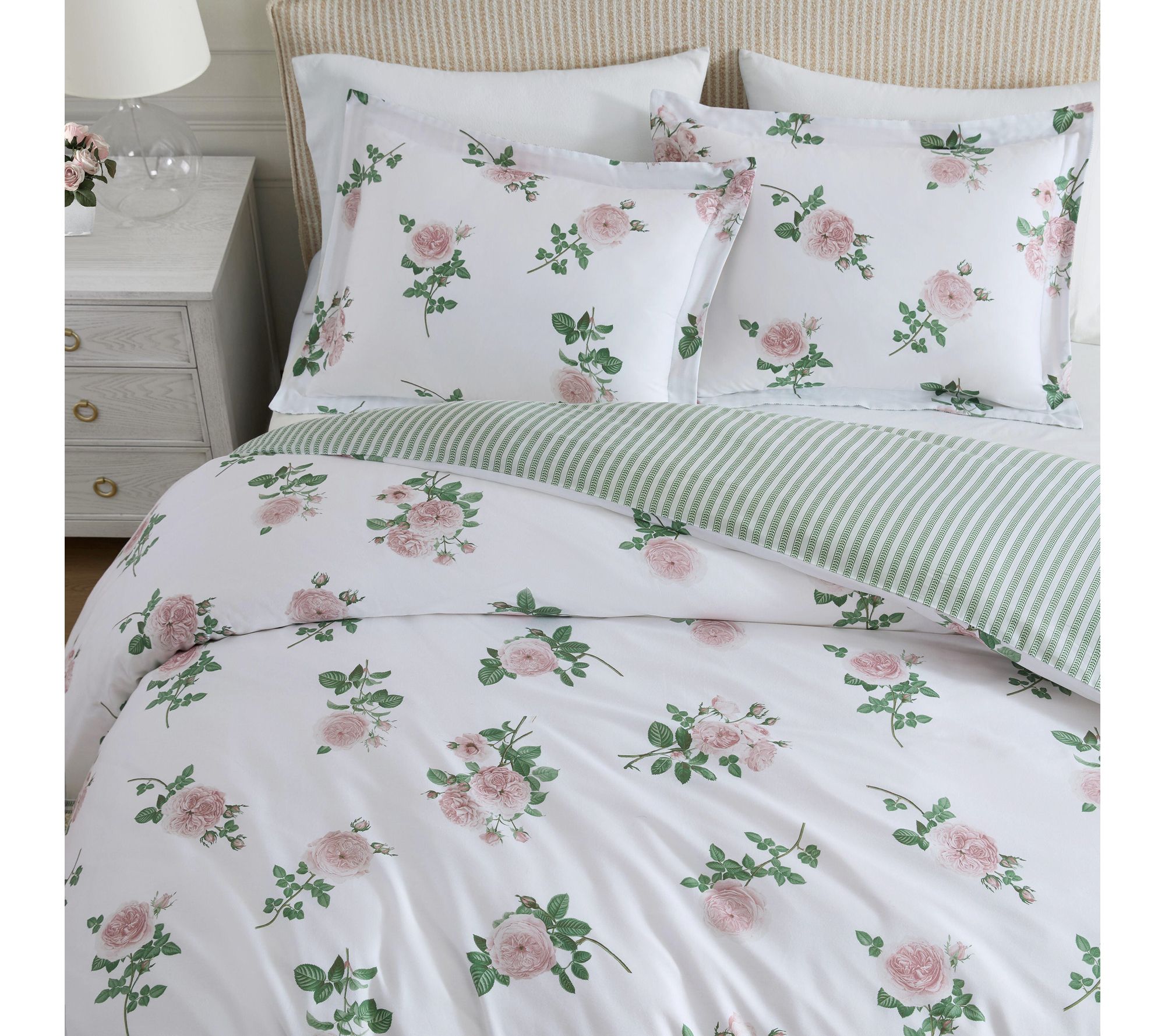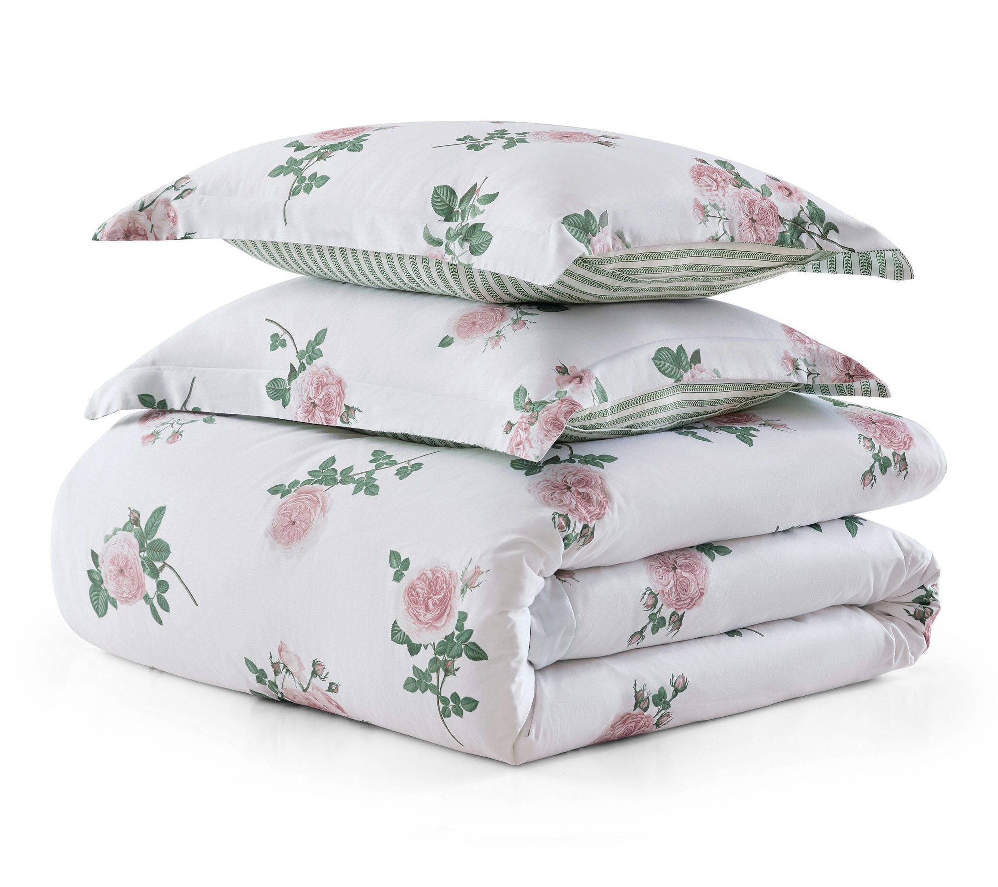 Turn your bedroom into an elegant retreat with this comforter set that pairs romantic tea rose blooms with a subtle green stripe reverse for added styling options. Crafted from cotton sateen, the plush down-alternative fill offers a silky, smooth touch and consistent warmth, making it a beautiful way to refresh your space season after season. From Martha Stewart.