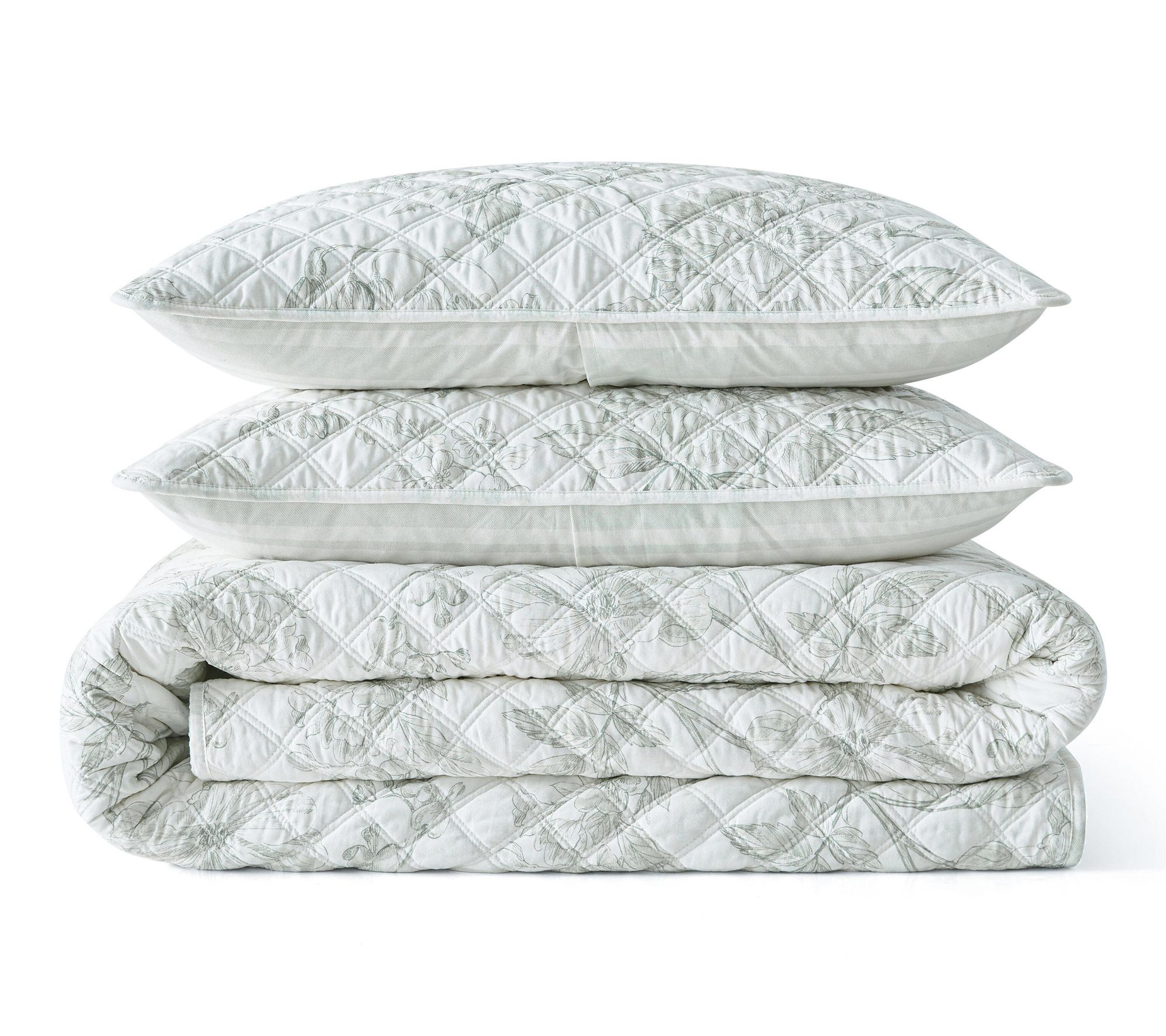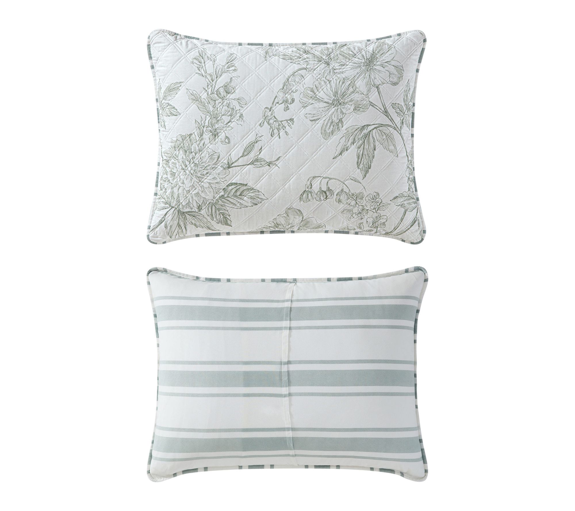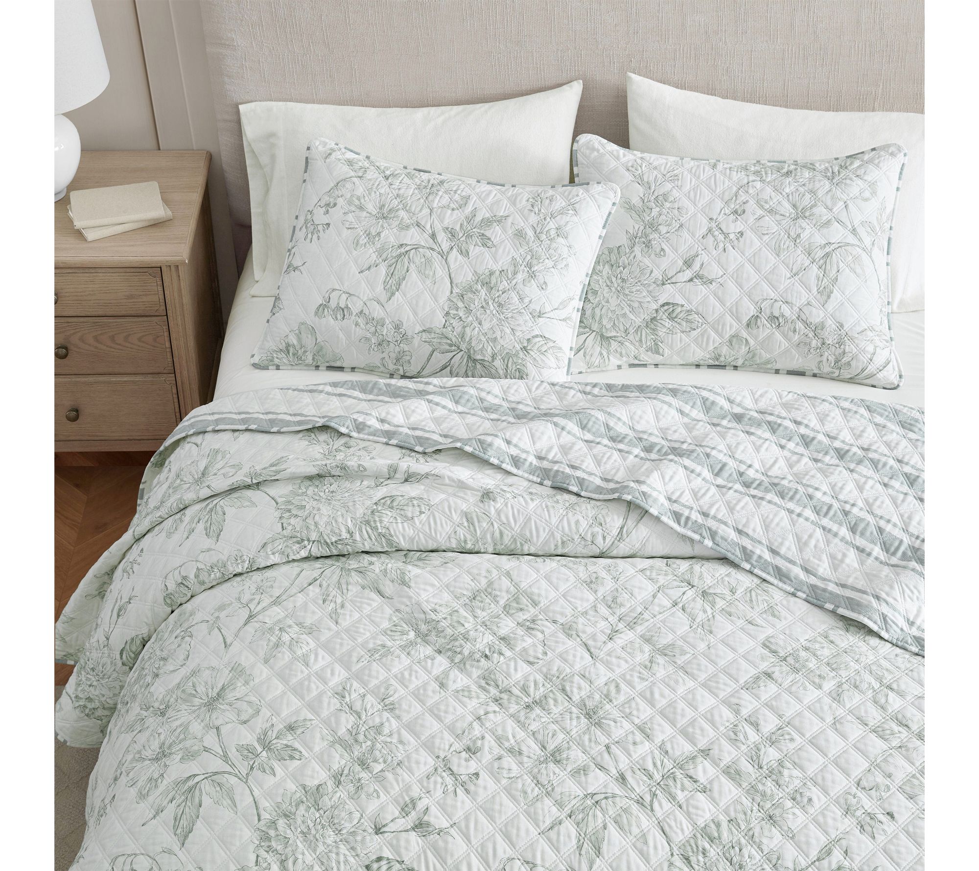 Refresh your bedroom with the timeless elegance of this quilt set, inspired by the lush beauty of botanical gardens. A delicate floral design graces the front while classic stripes on the reverse offer stylish versatility -- layer it on your bed for a touch of soft, nature-inspired comfort any time of year. From Martha Stewart.