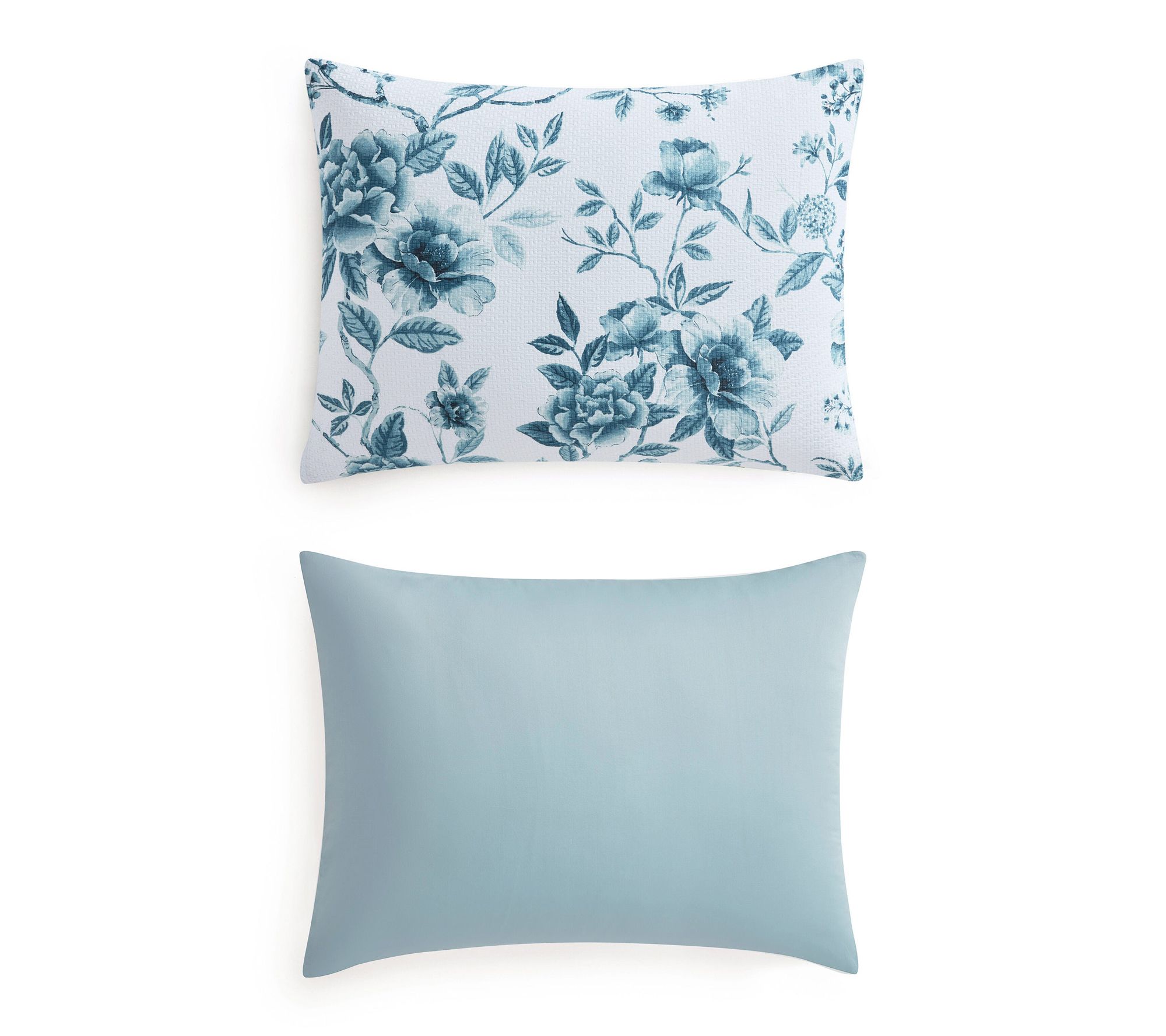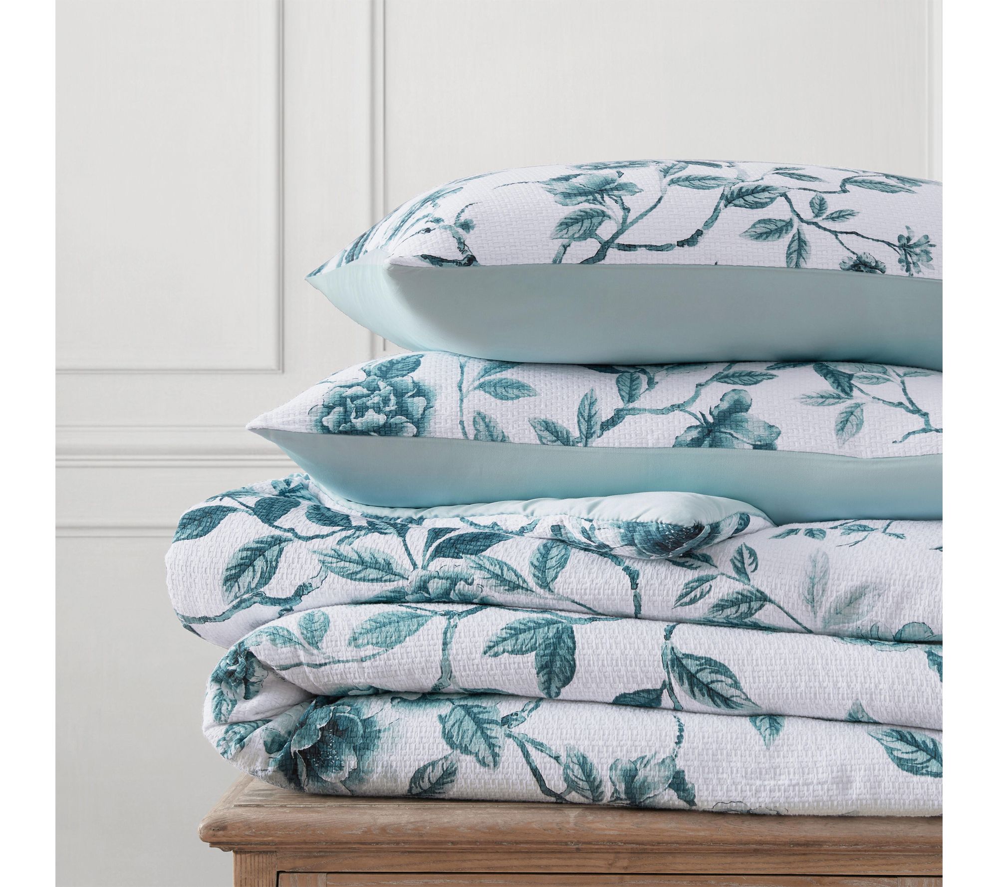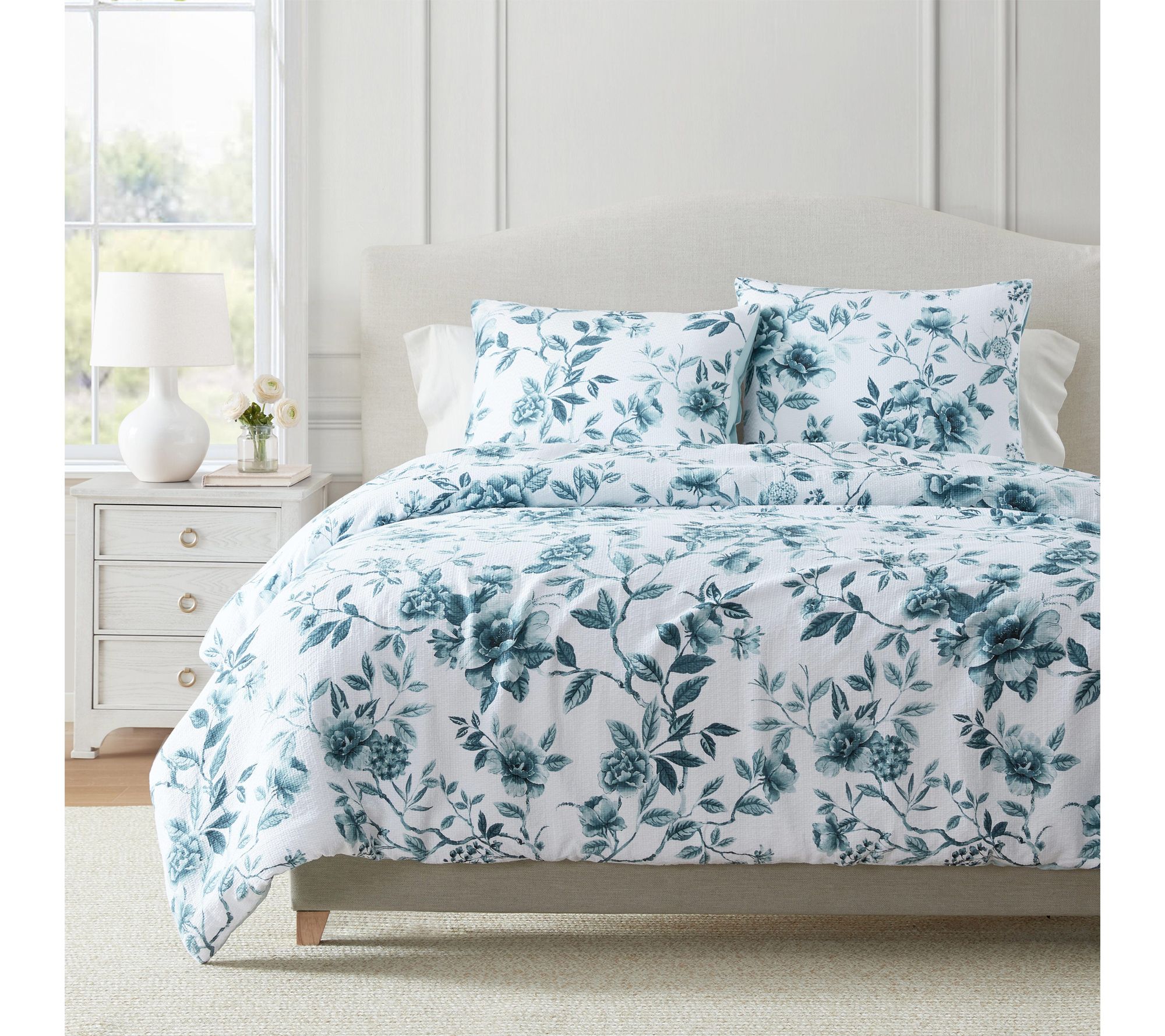 Refresh your bedroom with the elegant Vivian Floral comforter set, where soft blue botanicals and leafy branches dance across a crisp white cotton jacquard. Its plush, breathable comfort provides cozy warmth year-round, creating a serene oasis -- whether you're curling up with a favorite book or inviting guests to enjoy welcoming style. From Martha Stewart.