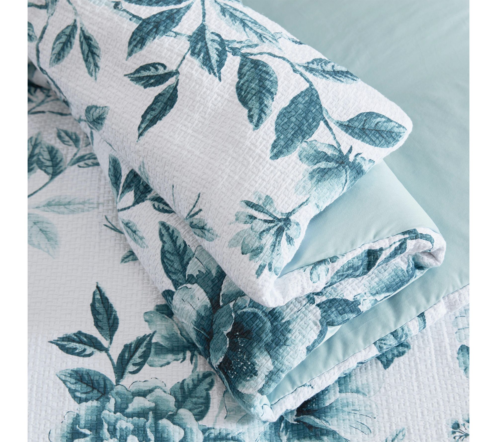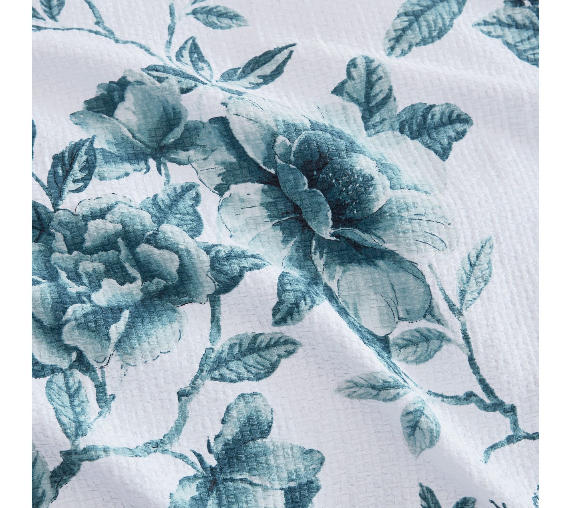 • Features botanical-inspired blue florals and leafy branches on a textured cotton jacquard fabric