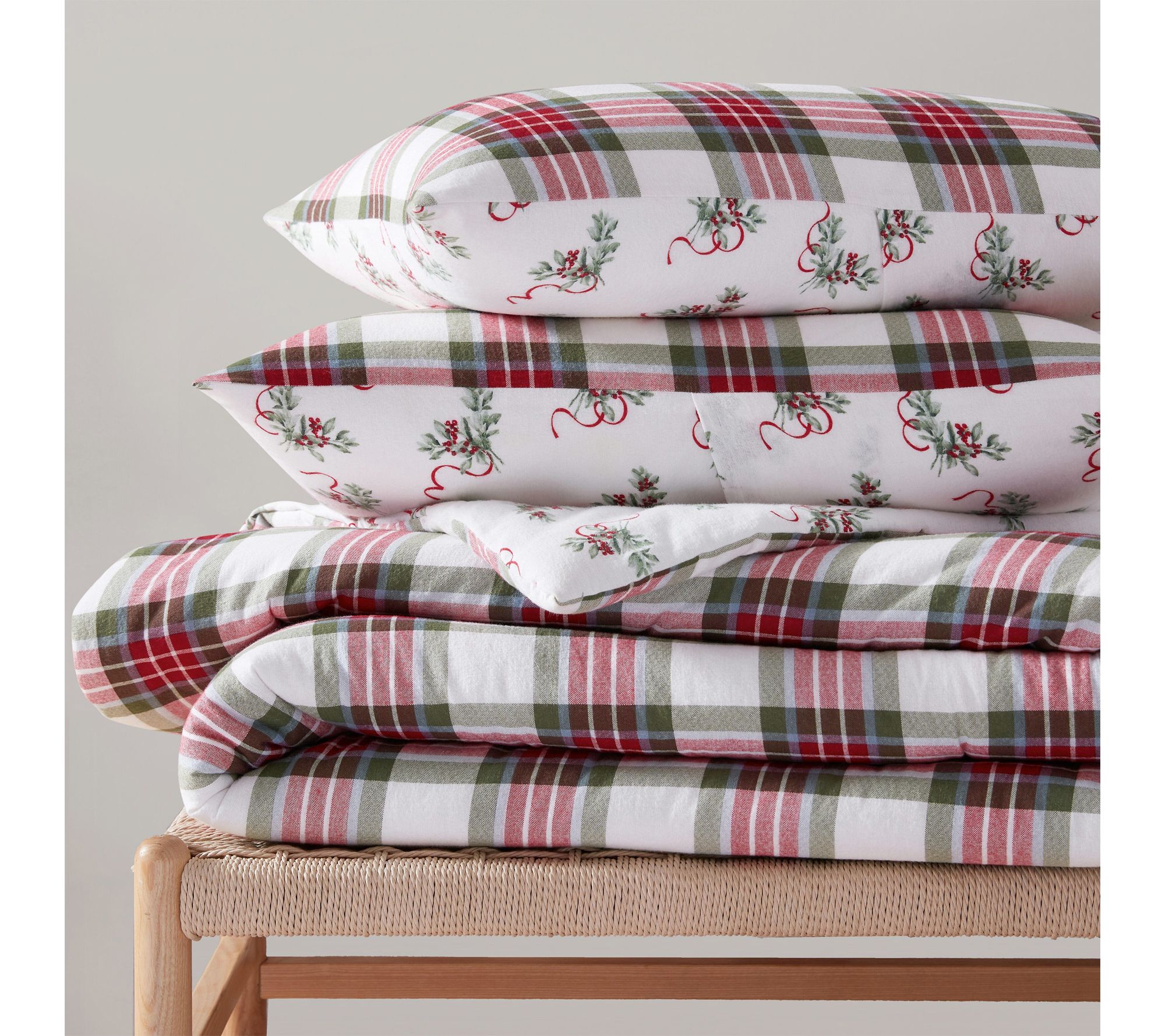 Curl up in festive comfort with this reversible king comforter set, featuring a classic red and green plaid design on one side and delicate holly sprigs with cheerful red ribbons on the reverse. The soft cotton flannel offers warmth and charm, ideal for creating a cozy seasonal retreat or welcoming guests over the holidays. From Martha Stewart.