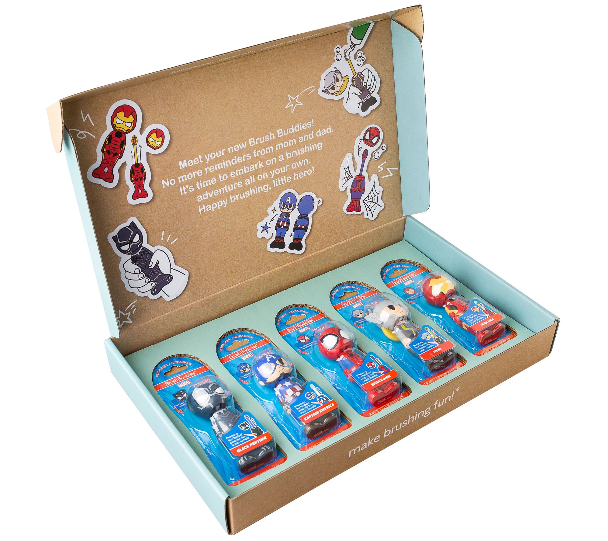 • Includes five Marvel Superheroes Poppin kids' toothbrushes, each with brush cap: one each of Black Panther, Thor, Spider-Man, Iron Man, and Captain America