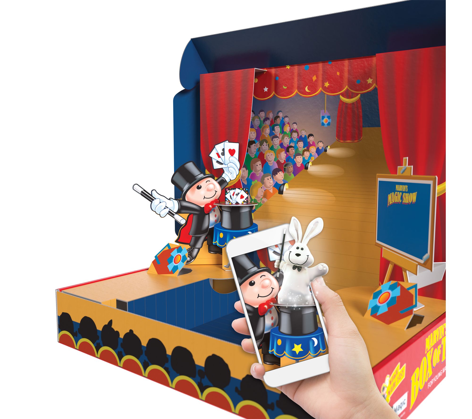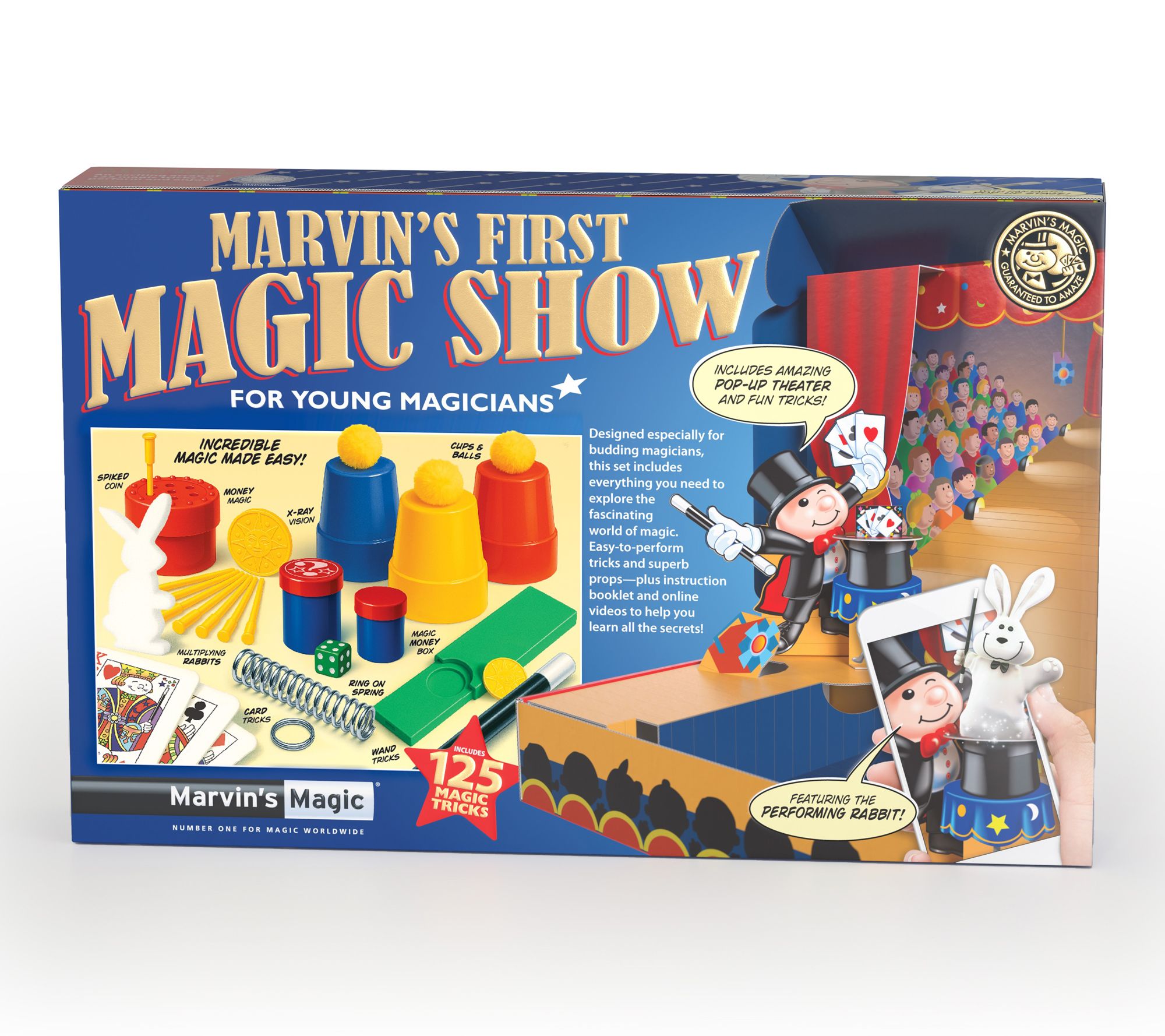 • Includes Spiked Coin Trick, Cups & Balls, Magic Money Box, Magic Wand, Magic Cards, Ring on a Spring, Foam Bunnies, Dice & Canisters, Secret Instructions, Pop-up Stage