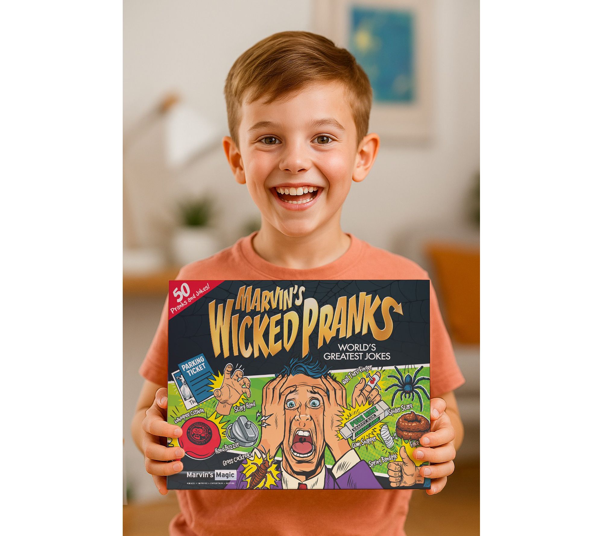 Bring laughter and surprises to every gathering with this board game set filled with devilish props and cheeky pranks. With classics like a whoopee cushion, nail through finger trick, and snappy chewing gum, it's easy to spark contagious giggles and unforgettable moments. Dive into a world of mischief with 50 hilarious jokes that get everyone smiling. From Marvins Magic.