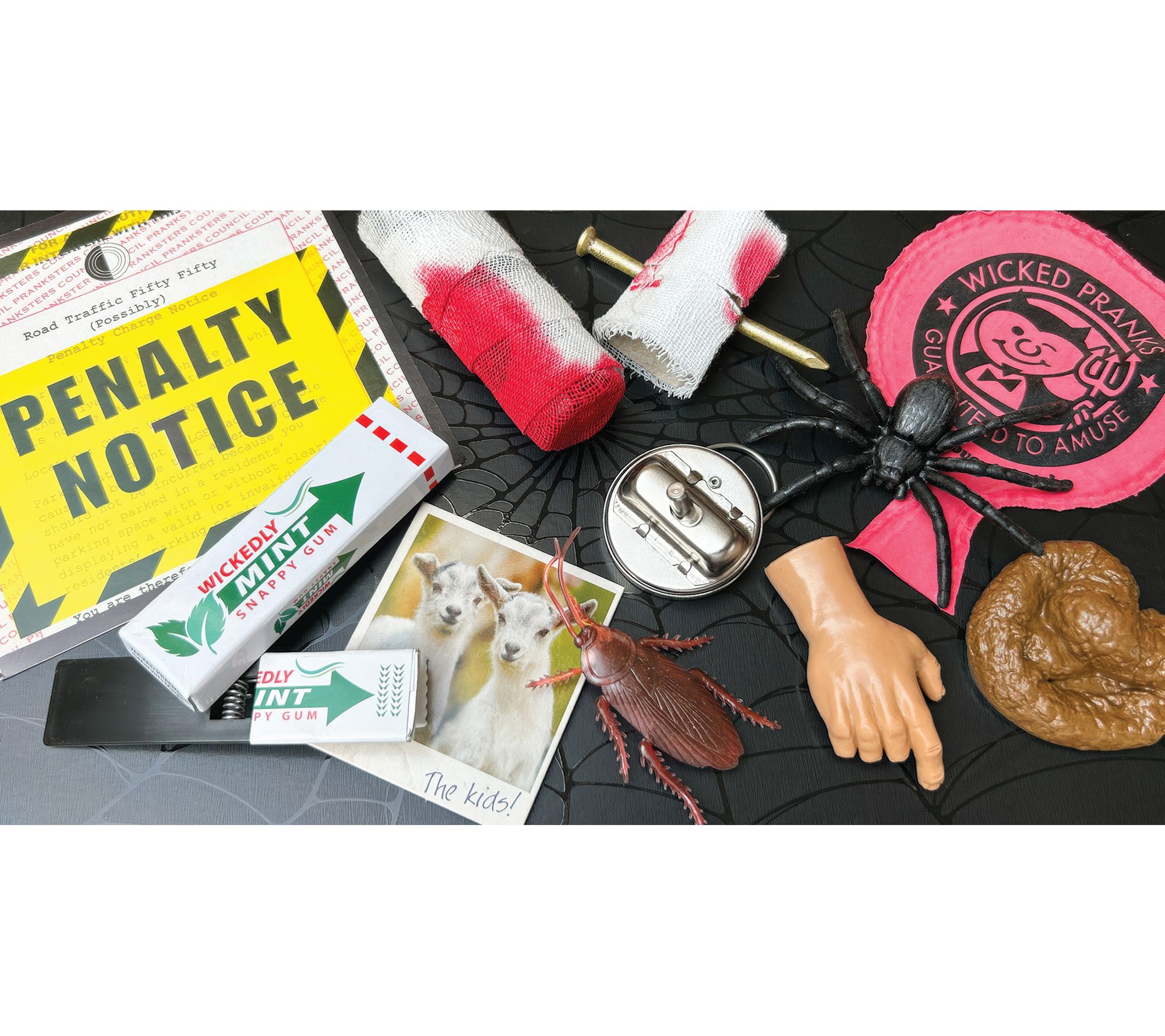 • Includes Spider Scare, Handshake Shocker, Fake Poop, Whoopee Cushion, Spring Loaded Bandage, Snappy Chewing Gum, Scary Hand, Gross Cockroach, The Kids Photo, Penalty Parking Notice, Nail Through Finger, and Jokes Booklet